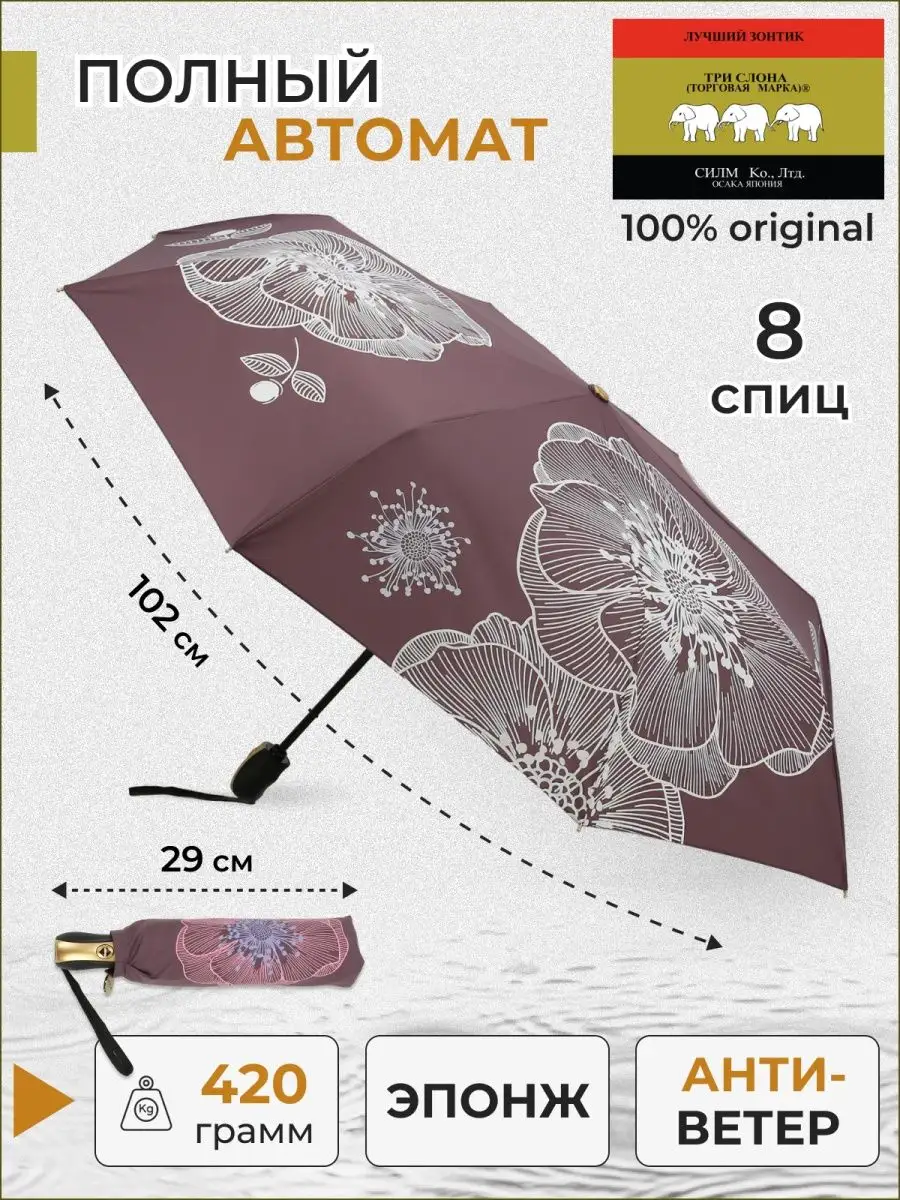 Описание: Производство зонтов под брендом Три слона было начато 120 лет назад. Первое время мануфактура, расположенная на территории Японии, носила название Футагава Кайша Лтд. и сменила его только в 1985 году на СИЛМ Ко., Лтд. На территории СССР продукция Три слона появилась примерно в 1970 году. Эргономичная ручка сделана из качественного пластика полиуретана с противоскользящей обработкой. Спицы зонта имеют необычную конструкцию, комплекс пружин и звеньев спиц, изготовленных из гибкого и упругого материала углепластика и фибергласса. Пружины защищают зонт от поломок при выворачивании от ветра. Конструкция зонта выполнена из алюминия. Раздвижной стержень зонта металлический.