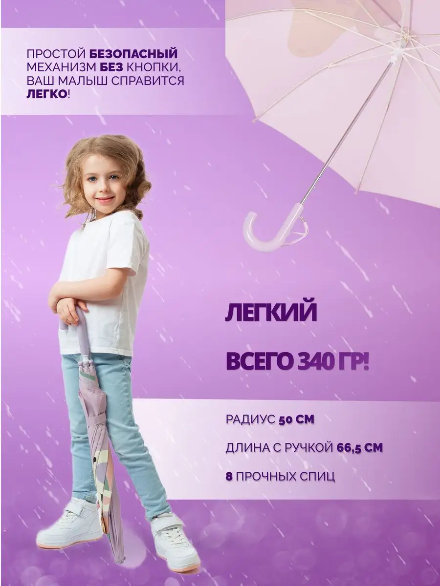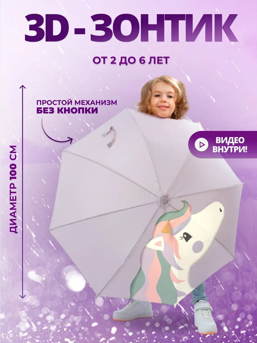 Описание: Детский зонт единорог с необычным дизайном - 3Д элементами и любимыми персонажами надежно защитит вашего ребенка в непогоду от снега и дождя. Простой механизм складывания позволит малышу легко и самостоятельно открыть и закрыть свой любимый зонтик. С единорожкой прогулки становятся намного веселее! Зонтик для девочек отличается простотой и имеет следующие особенности: прочные спицы, плотный ветроустойчивый купол и объемный рисунок 3D. Необычный дизайн произведет вау-эффект на вашего ребенка. Детские аксессуары для прогулок должны быть практичны и удобны и наши легкие зонтики полностью этому соответствуют. С ними легко справиться даже самый маленький малыш. Мы рекомендуем зонтик с единорогом для девочек от 3х лет. Зонт с ярким и объемным дизайном имеет купол, обеспечивающий 100% защиту от дождя. Яркий необычный аксессуар станет отличным подарком девочке 3, 4, 5 лет. Зонт подходит для прогулок на улице в дождливую и в любую погоду! Зонты складные - важный и необходимый атрибут в гардеробе ребенка. Приобретайте зонтики Aquamarinе KIDS. Наша продукция — семейный выбор. Она «прозрачная» — вы всегда можете задать интересующие вопросы. Оставляйте, пожалуйста, отзывы о товаре. Нам важно ваше мнение!