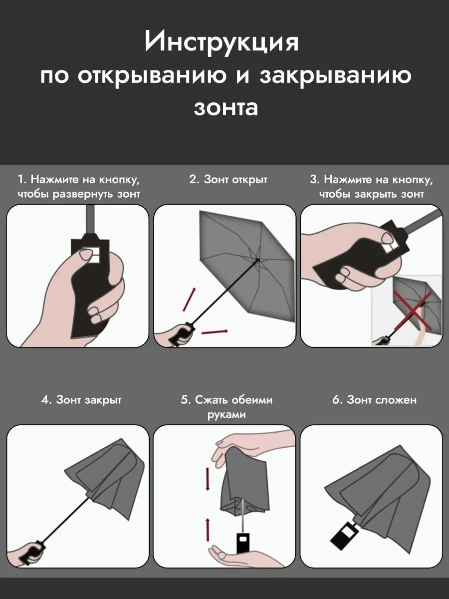 Описание: Зонт подойдет как мужчине так и женщине Зонты автоматы очень популярны благодаря своему удобству и простоте использования. Они особенно полезны в условиях быстро меняющейся погоды, когда нужно быстро защититься от дождя или солнца. Зонт обратного сложения TOPBINLU - полностью автоматический обратный, имеет большой купол, диаметром - 106 см и окружностью 116 см, который надежно крепится на 16 усиленных спицах, что делает его более устойчивым к ветру в сравнении с традиционными 8-12 спиц. Он снабжен системой антиветер это конструктивное решение, которое предназначено для улучшения устойчивости зонта при сильном ветре. В чем же плюс обратного сложения? В том что зонт закрывается не наружной стороной, а внутренней, сохраняя при этом оставшиеся капельки внутри зонта. Это позволяет держать модный аксессуар одной рукой, не беспокоясь о каплях воды или снеге, которые могут попадать на одежду, мебель, пол или сиденье автомобиля. Светоотражающая полоса на зонтике (рефлектор) предназначена для повышения безопасности в темное время суток, когда водители на дороге могут не заметить пешехода. Рефлектор отражает свет фар автомобилей и делает аксессуар более заметным для водителей, что уменьшает риск возникновения дорожно-транспортного происшествия. Технология защиты от солнца эффективно блокирует 99% ультрафиалетовых лучей (УФ лучей). Благодаря этому зонтик подходит для любой погоды. Супергидрофобная технология защиты от просачивания воды позволит Вам наслаждаться прогулкой в любых погодных условиях. Зонтик автоматический, а это значит - автоматическое открывание и закрывание одним щелчком одной руки. Мы подготовили для Вас различные однотонные, яркие, сочные расцветки. Вы сможете подобрать зонт автомат женский или мужской. Представленные модели изготовлены из высококачественных материалов и будут служить долго и без нареканий. ВНИМАНИЕ! Зонт - автоматический! Во избежание заклинивания механизма и для сохранения зонта в работоспособном состоянии, его следует складывать ТОЛЬКО после сворачивания купола повторным нажатием на кнопку открытия/закрытия.
