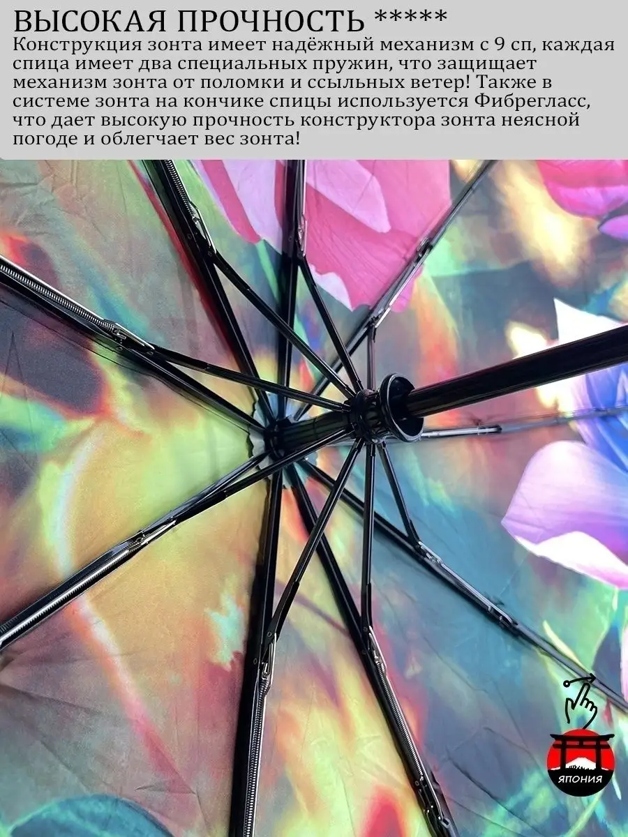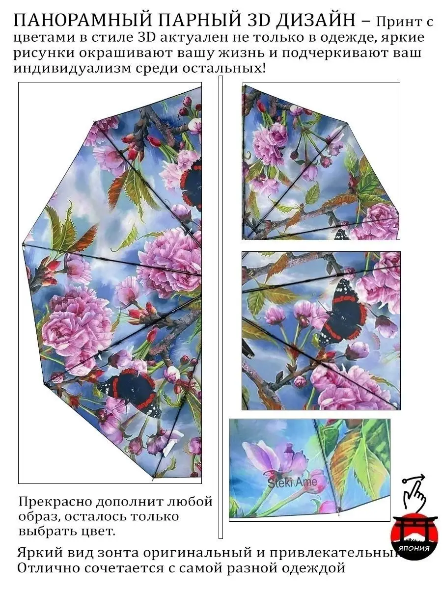 Описание: Зонт полный автомат 9 спиц с оригинальным рисунком, ЯПОНСКОГО качества от производителя Steki Ame! Зонт с двусторонним куполом, купол снаружи однотонный черный ПУ КОЖА, внутри купола красивый панорамный 3D рисунок: принт разноцветные цветы роза, тюльпан бабочки абстракция листья узоры растения, отличный способ выделиться среди других и всегда быть уникальным с эксклюзивным зонтам. Стильный и модный аксессуар для лобового пользователя! Преимущества: Зонт автомат открытие и закрытие купола осуществляется автоматически с кнопкой. Кнопка с значком и большая. Зонт имеет большой купол, прочный стальной и ветроустойчивый каркас с системой антиветер защищает от дождя и ветра. Ткань внутри ЯПОНСИКИЙ ЭПОНЖ, внешний купол ПУ КОЖА обработанная DLF легко отталкивает воду. Зонт остается сухим и предотвращает прилипание грязи. Ручка прямая удобная с петелькой приятная на ощупь. При низком температуре рука не мерзнет. Большая кнопка с значком. Надежный и отличный аксессуар для женщины и девушки на дождливую погоду и на мокрую снег, также для защиты от солнца на пляже! Зонт это не только полезный аксессуар каждого человека, но и оригинальный подарок в любое время года и к любому празднику. Зонт - подарок, который говорит о вашей заботе, подарите сестре, жене, любимой девушке. Зонт упакован в фирменной подарочной упаковке. Используйте для фотосессии. Наслаждайтесь красивыми, яркими цветами, которые поднимут вам настроение. --- --- --- --- Характеристика: полный автомат, 3 сложения. Длина купола 114 см, 9 спиц/104см. Длина в сложенном виде: 31 см. Высота зонта 5,5 см, Спиц, 9 ш., Длина ручки 7 см. Стержень: сталь. Вес: 480г. --- --- --- --- ТЕГИ: оригинальный подарок к празднику зонтик легкий подростке для фотосессии на работу в офис на корпоратив на вечеринку однотонный Зонт не трость не прозрачный купол не три слона радуга не полуавтомат мини любимому мужчине.