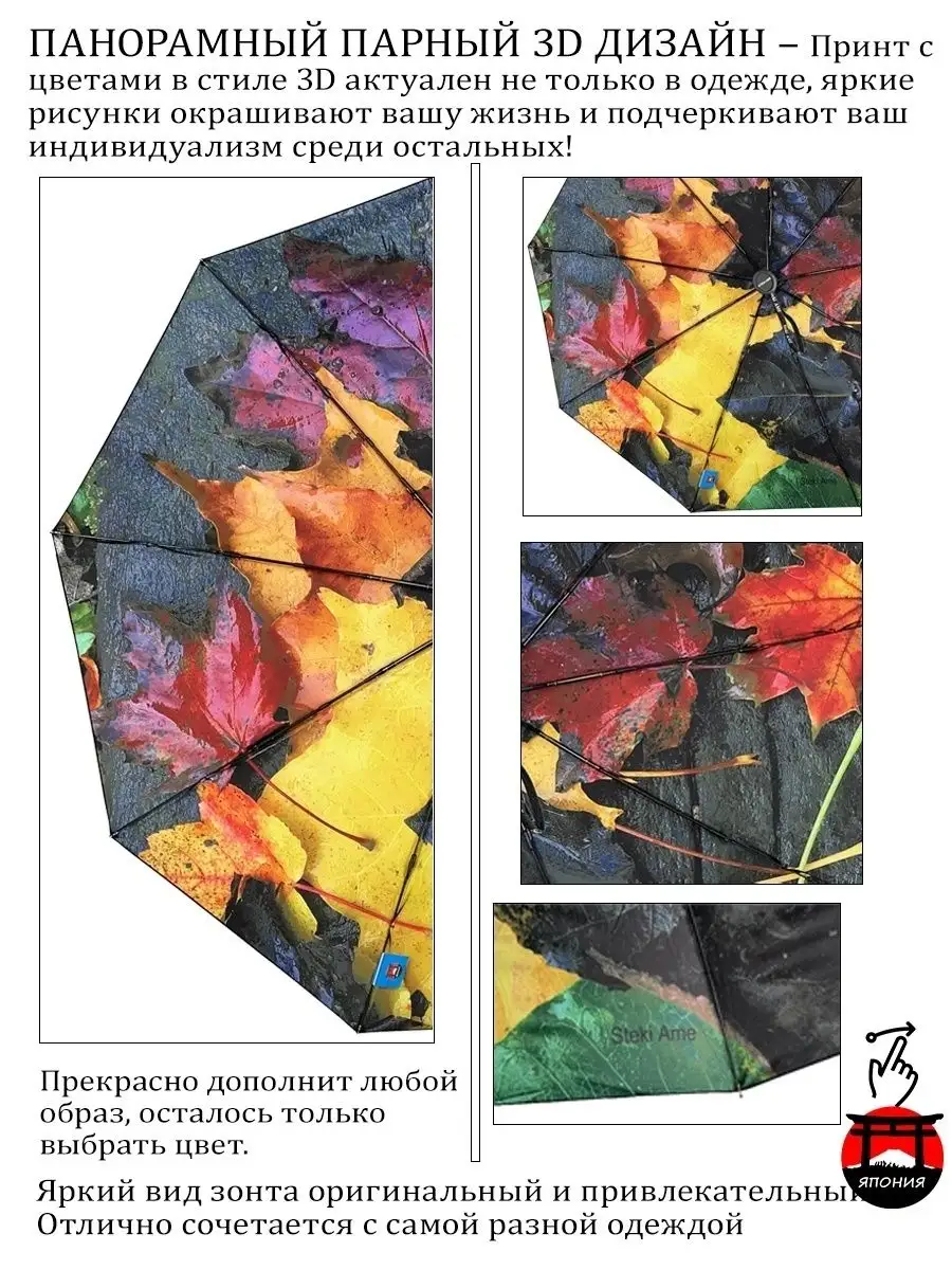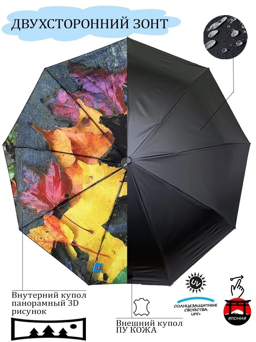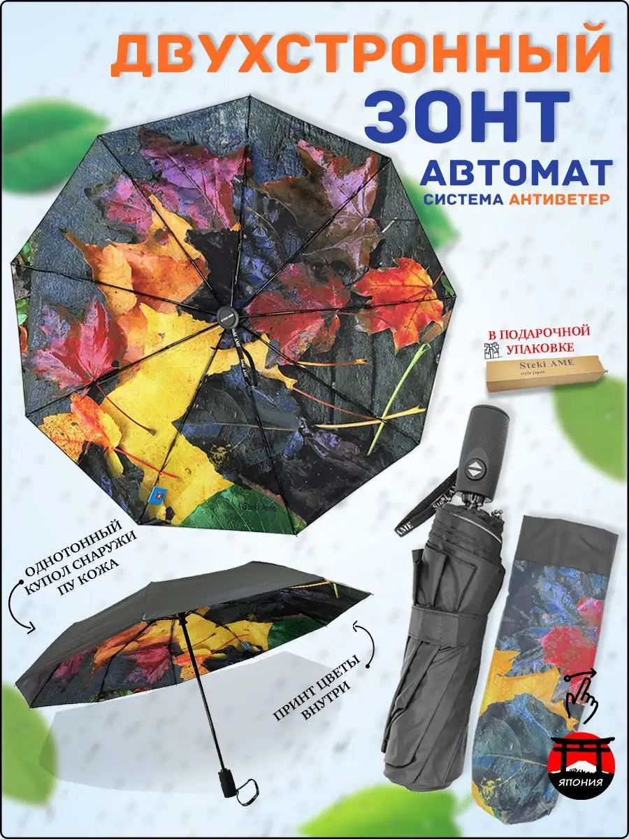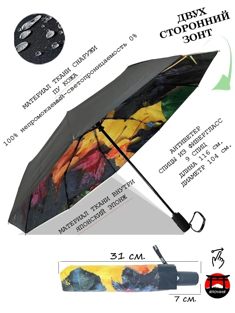 Описание: Эксклюзивный двухсторонний зонт с принтом "Осенние цветы", ЯПОНСКОГО качества от производителя Steki Ame! Зонт с двусторонним куполом, купол снаружи однотонный черный ПУ КОЖА, внутри купола красивый панорамный 3D рисунки, стиль осенние листья, отличный способ выделиться среди других и всегда быть уникальным с эксклюзивным зонтам. Стильный и модный аксессуар для лобового пользователя! Женский зонт в осеннем стиле с желтыми, красными и коричневыми цветами и листьями на бежевом куполе. Модная цветовая политра зонта создаст стиль как романтическим натурам так и бизнесменам и бизнес леди Преимущества: Зонт автомат открытие и закрытие купола осуществляется автоматически с кнопкой. Кнопка с значком и большая. Зонт имеет большой купол, прочный стальной и ветроустойчивый каркас с системой антиветер защищает от дождя и ветра. Ткань внутри ЯПОНСИКИЙ ЭПОНЖ, внешний купол ПУ КОЖА обработанная DLF легко отталкивает воду. Зонт остается сухим и предотвращает прилипание грязи. Ручка прямая удобная с петелькой приятная на ощупь. При низком температуре рука не мерзнет. Большая кнопка с значком. Надежный и отличный аксессуар для женщины и девушки на дождливую погоду и на мокрую снег, также для защиты от солнца на пляже! Зонт это не только полезный аксессуар каждого человека, но и оригинальный подарок в любое время года и к любому празднику. Зонт - подарок, который говорит о вашей заботе, подарите сестре, жене, любимой девушке. Зонт упакован в фирменной подарочной упаковке. Используйте для фотосессии. Яркий цвет поднимет настроение Вам и окружающим, раскрасит хмурый рабочий день. --- --- --- --- Характеристика: полный автомат, 3 сложения. Длина купола 116 см, 9 спиц/104см. Длина в сложенном виде: 31 см. Высота зонта 55,5 см, Спиц, 9 ш., Длина ручки 7 см. Стержень: сталь. Вес: 480г. --- --- --- --- ОБРАЩАЕМ ВАШЕ ВНИМАНИЕ, что зонт не рекомендуется использовать при сильных порывах ветра, так как он может сломаться. --- --- --- --- Зонт украшенный абстрактным рисунком или орнаментом, выглядит по-настоящему необычно. Абстракция на куполе зонтика делает его визуальное восприятие как бы безграничным, пускает ваше воображение в полет, купол с абстрактным рисунком кажется тем изображением, какое вы сами себе нарисуете... Поэтому зонты с абстракцией на куполе берут люди творческие, веселые и умеющие строить свою жизнь по собственному разумению. Абстракция может быть легкой, светлых тонов или более сложной с использованием темным цветов и многогранных рисунков --- --- --- ---ТЕГИ: оригинальный подарок к празднику зонтик легкий подростке для фотосессии на работу в офис на корпоратив на вечеринку однотонный Зонт не трость не прозрачный купол не три слона радуга не полуавтомат мини любимому мужчине.