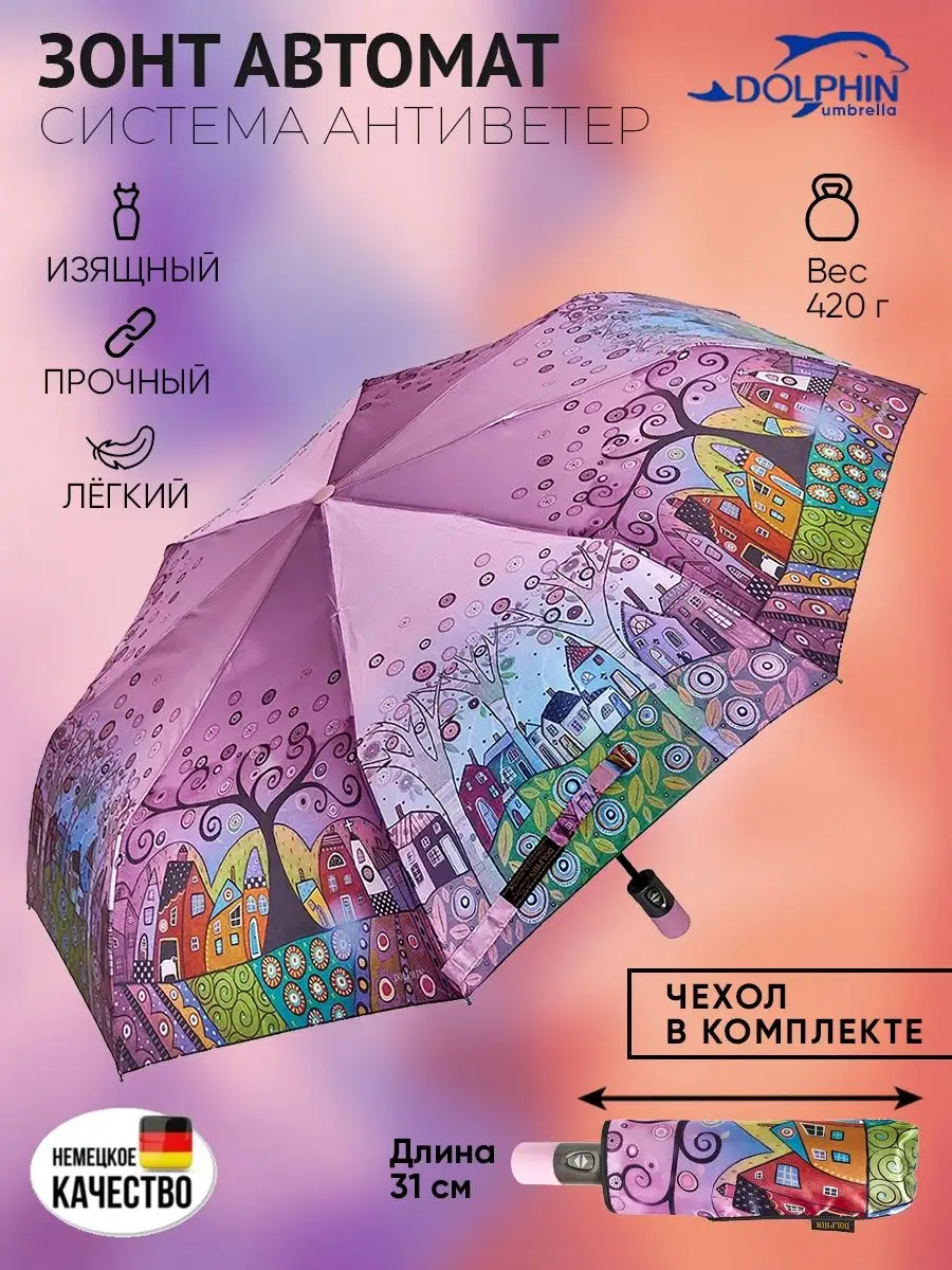 Описание: Женский складной зонт автоматический тм Dolphin - красивый, прочный, компактный, а значит очень удобный аксессуар, который всегда защитит вас от мокрого снега, дождя, знойного солнца или ветра. Стильный зонт имеет небольшой размер и свободно помещается в женской сумочке (в сумку) или рюкзаке, что делает его идеальным выбором для девушек и женщин любого возраста. Благодаря небольшому весу и габаритам им сможет пользоваться девушка подросток (подростковый) и женщина любого возраста. Зонтики женские автомат Dolphin имеют яркий оригинальный рисунок, что существенно отличает его от аналогичных зонтов других производителей. Такой дизайн всегда будет выделять вас на улице, и привлекать внимание прохожих. В плохую погоду будет поднимать вам настроение своим ярким дизайном. Сам купол большой изготовлен из мягкого, но прочного материала - сатин, его приятно держать в руках и использовать во время дождя. Дополнительно материал купола – сатин имеет водоотталкивающую пропитку, что позволяет зонту не впитывать влагу, во время дождя он не становится тяжелее и быстрее сохнет после дождя. Для производства каркаса автоматического зонта мы используем усиленный механизм немецкого производителя, благодаря которому зонт прослужит вам очень долгое время даря комфорт и радость использования. Облегченный механизм зонта с системой Антиветер / Антишторм, который не дает зонту сломаться даже в самый сильный ветер или ураган. При максимальном давлении на купол, спицы зонта рассчитаны на то, что бы перевернуть купол в обратную стороны. Эта система не дает сломать спицы или порвать купол. Зонт полный автомат. В комплект к зонту входит удобный чехлом для хранения в сложенном виде, который выполнен в одном дизайне с куполом зонта. Купив ккрасивый и качественный зонт один раз, вы будете испытывать комфорт использования зонта каждый раз при необходимости. Зонтик аксессуар складной подойдет на зиму, весну, лето и осень, защитит от мокрого снега, дождя, ветра и знойного солнца. Благодаря компактным размерам и удобной ручке маленький зонт можно взять с собой на прогулку, повседневной поездки на работу, путешествию, в машину, в поход, дальнюю дорогу, прогулке на улице в парке и на даче в саду. Такой зонт это отличный и презентабельный подарок любимому человеку, близким людям, партнерам по бизнесу, коллегам. Выбрав zont в качестве подарка вы подчеркнете элегантный вкус, а так же важность и заботу по отношению к близким. Легкие женские зонты Dolphin от мирового производителя Dolphin - Planet известного поставщика качественных зонтов из стали по всему миру. Компания Долфин имеет представителей по всему миру, таким странам как Россия, Япония, США, Индия, Китай, европейские страны. Компания производит зонты уже более 30 лет и имеет огромный опыт в производстве. В ассортименте огромное количество зонтов с разным дизайном на выбор и мужчинам, и женщинам. Не упустите свой шанс приобрести качественный и надежный женский зонт, который будет не только защищать вас от непогоды, но и станет прекрасным дополнением к вашему стилю. Как важно испытывать удобство и комфорт даже в плохую непогоду. Сделайте заказ прямо сейчас и получите еще один аксессуар для комфортной и уютной повседневной жизни!