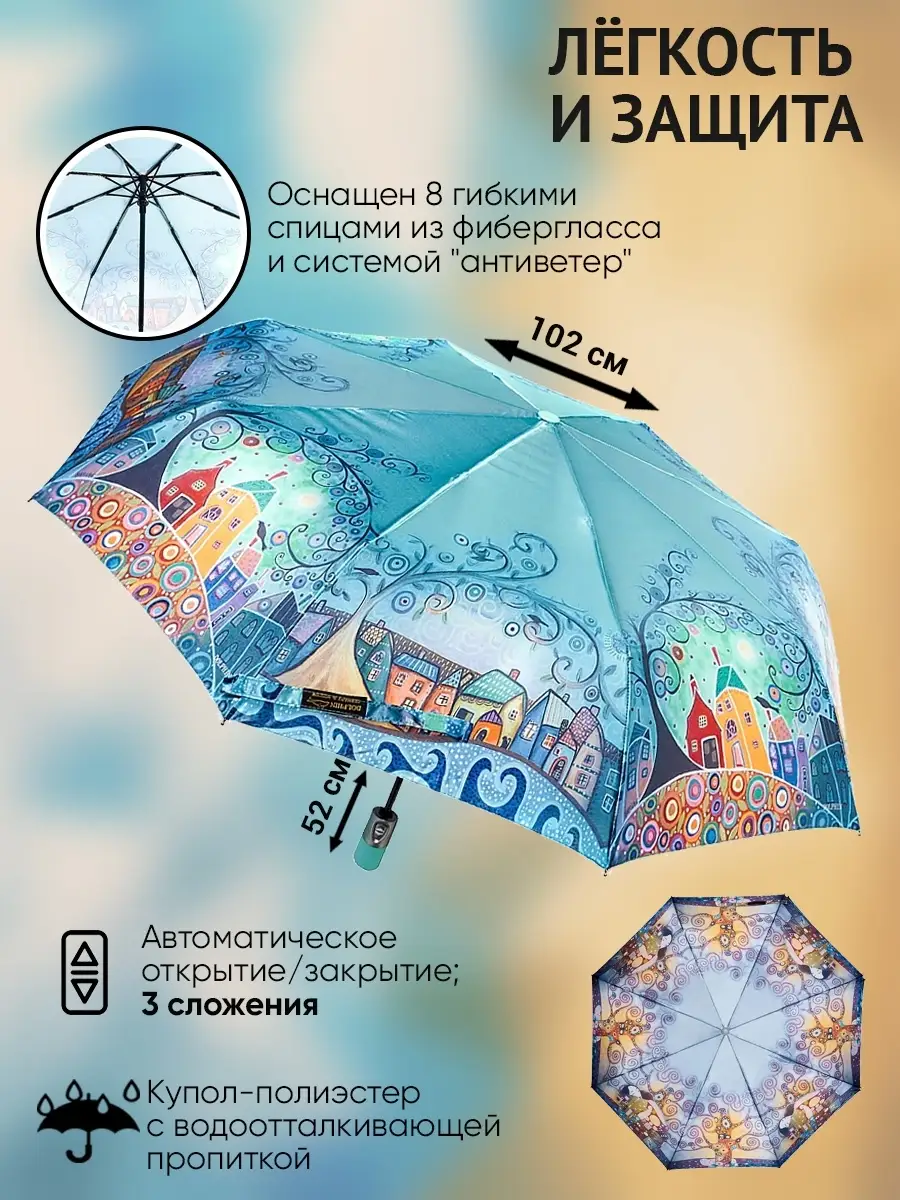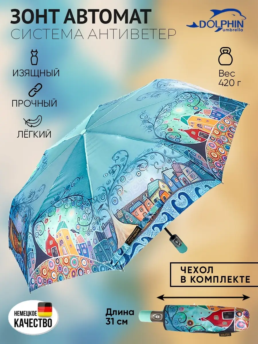 Описание: Женский складной зонт автоматический тм Dolphin - красивый, прочный, компактный, а значит очень удобный аксессуар, который всегда защитит вас от мокрого снега, дождя, знойного солнца или ветра. Стильный зонт имеет небольшой размер и свободно помещается в женской сумочке (в сумку) или рюкзаке, что делает его идеальным выбором для девушек и женщин любого возраста. Благодаря небольшому весу и габаритам им сможет пользоваться девушка подросток (подростковый) и женщина любого возраста. Зонтики женские автомат Dolphin имеют яркий оригинальный рисунок, что существенно отличает его от аналогичных зонтов других производителей. Такой дизайн всегда будет выделять вас на улице, и привлекать внимание прохожих. В плохую погоду будет поднимать вам настроение своим ярким дизайном. Сам купол большой изготовлен из мягкого, но прочного материала - сатин, его приятно держать в руках и использовать во время дождя. Дополнительно материал купола – сатин имеет водоотталкивающую пропитку, что позволяет зонту не впитывать влагу, во время дождя он не становится тяжелее и быстрее сохнет после дождя. Для производства каркаса автоматического зонта мы используем усиленный механизм немецкого производителя, благодаря которому зонт прослужит вам очень долгое время даря комфорт и радость использования. Облегченный механизм зонта с системой Антиветер / Антишторм, который не дает зонту сломаться даже в самый сильный ветер или ураган. При максимальном давлении на купол, спицы зонта рассчитаны на то, что бы перевернуть купол в обратную стороны. Эта система не дает сломать спицы или порвать купол. Зонт полный автомат. В комплект к зонту входит удобный чехлом для хранения в сложенном виде, который выполнен в одном дизайне с куполом зонта. Купив ккрасивый и качественный зонт один раз, вы будете испытывать комфорт использования зонта каждый раз при необходимости. Зонтик аксессуар складной подойдет на зиму, весну, лето и осень, защитит от мокрого снега, дождя, ветра и знойного солнца. Благодаря компактным размерам и удобной ручке маленький зонт можно взять с собой на прогулку, повседневной поездки на работу, путешествию, в машину, в поход, дальнюю дорогу, прогулке на улице в парке и на даче в саду. Такой зонт это отличный и презентабельный подарок любимому человеку, близким людям, партнерам по бизнесу, коллегам. Выбрав zont в качестве подарка вы подчеркнете элегантный вкус, а так же важность и заботу по отношению к близким. Легкие женские зонты Dolphin от мирового производителя Dolphin - Planet известного поставщика качественных зонтов из стали по всему миру. Компания Долфин имеет представителей по всему миру, таким странам как Россия, Япония, США, Индия, Китай, европейские страны. Компания производит зонты уже более 30 лет и имеет огромный опыт в производстве. В ассортименте огромное количество зонтов с разным дизайном на выбор и мужчинам, и женщинам. Не упустите свой шанс приобрести качественный и надежный женский зонт, который будет не только защищать вас от непогоды, но и станет прекрасным дополнением к вашему стилю. Как важно испытывать удобство и комфорт даже в плохую непогоду. Сделайте заказ прямо сейчас и получите еще один аксессуар для комфортной и уютной повседневной жизни!