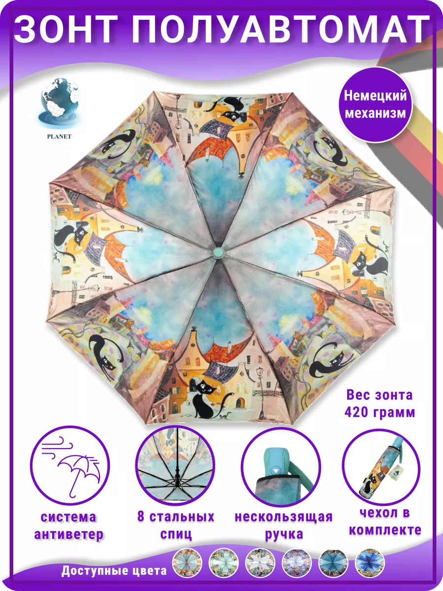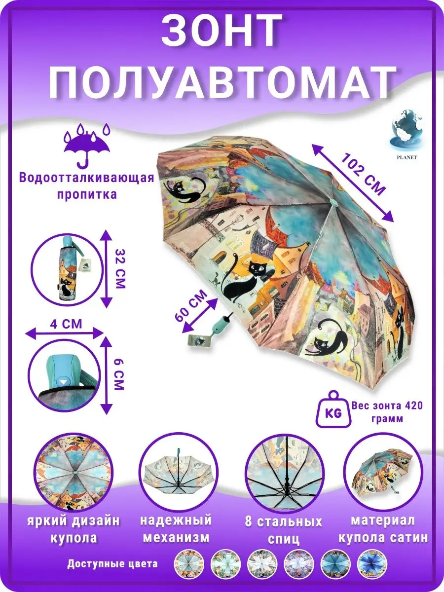 Описание: Женский складной зонт полуавтоматический тм Planet – невероятно красивый, прочный, компактный, а значит очень удобный аксессуар, который всегда защитит вас от мокрого снега, дождя, знойного солнца или ветра. Стильный зонт имеет небольшой размер и свободно помещается в женской сумочке (сумку) или рюкзаке, что делает его идеальным выбором для девушек и женщин любого возраста. Благодаря небольшому весу и габаритам им сможет пользоваться девушка подросток (подростковый) и женщина любого возраста. Зонтики Planet имеют яркий оригинальный рисунок, что существенно отличает его от аналогичных зонтов других производителей. Такой дизайн всегда будет выделять вас на улице, и привлекать внимание прохожих. В плохую погоду будет поднимать вам настроение своим ярким дизайном. Сам купол изготовлен из мягкого, но прочного материала - сатин, его приятно держать в руках и использовать во время дождя. Дополнительно материал купола – сатин имеет водоотталкивающую пропитку, что позволяет зонту не впитывать влагу, во время дождя он не становится тяжелее и быстрее сохнет после дождя. Для производства каркаса полуавтоматического зонта мы используем усиленный механизм немецкого производителя, благодаря которому зонт прослужит вам очень долгое время даря комфорт и радость использования. Облегченный механизм зонта с системой Антиветер / Антишторм, который не дает зонту сломаться даже в самый сильный ветер или ураган. При максимальном давлении на купол, спицы зонта рассчитаны на то, что бы перевернуть купол в обратную стороны. Эта система не дает сломать спицы или порвать купол. В комплект к зонту входит удобный чехлом для хранения, который выполнен в одном дизайне с куполом зонта. Купив красивый и качественный зонт один раз, вы будете испытывать комфорт использования зонта каждый раз при необходимости. Зонтик аксессуар складной подойдет на зиму, весну, лето и осень, защитит от мокрого снега, дождя, ветра и знойного солнца. Благодаря компактным размерам и удобной ручке зонт можно взять с собой на прогулку, повседневной поездки на работу, путешествию, в машину, в поход, дальнюю дорогу, прогулке на улице в парке и на даче в саду. Такой зонт это отличный и презентабельный подарок любимому человеку, близким людям, партнерам по бизнесу, коллегам. Выбрав zont в качестве подарка вы подчеркнете элегантный вкус, а так же важность и заботу по отношению к близким. Зонт Planet от мирового производителя Dolphin - Planet известного поставщика качественных зонтов по всему миру. Компания Долфин имеет представителей по всему миру, таким странам как Россия, Япония, США, Индия, Китай, европейские страны. Компания производит зонты уже более 30 лет и имеет огромный опыт в производстве. В ассортименте огромное количество зонтов с разным дизайном на выбор и мужчинам, и женщинам. Не упустите свой шанс приобрести качественный и надежный женский зонт, который будет не только защищать вас от непогоды, но и станет прекрасным дополнением к вашему стилю. Как важно испытывать удобство и комфорт даже в плохую непогоду. Сделайте заказ прямо сейчас и получите еще один аксессуар для комфортной и уютной повседневной жизни!
