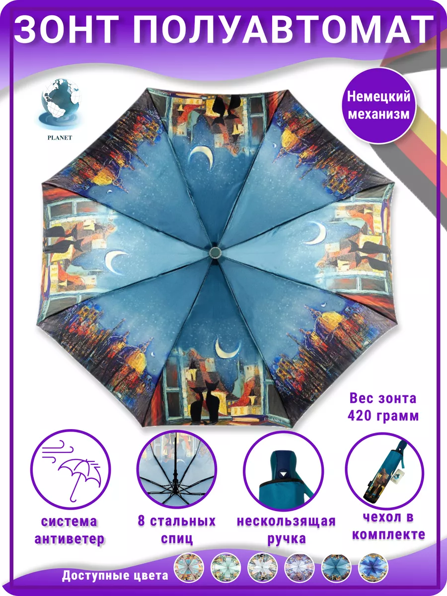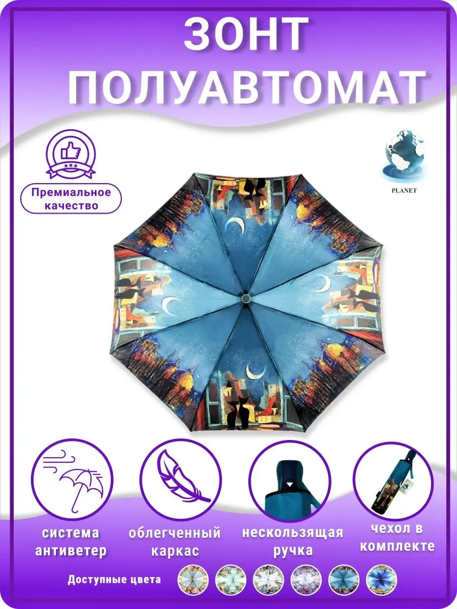 Описание: Женский складной зонт полуавтоматический тм Planet – невероятно красивый, прочный, компактный, а значит очень удобный аксессуар, который всегда защитит вас от мокрого снега, дождя, знойного солнца или ветра. Стильный зонт имеет небольшой размер и свободно помещается в женской сумочке (сумку) или рюкзаке, что делает его идеальным выбором для девушек и женщин любого возраста. Благодаря небольшому весу и габаритам им сможет пользоваться девушка подросток (подростковый) и женщина любого возраста. Зонтики Planet имеют яркий оригинальный рисунок, что существенно отличает его от аналогичных зонтов других производителей. Такой дизайн всегда будет выделять вас на улице, и привлекать внимание прохожих. В плохую погоду будет поднимать вам настроение своим ярким дизайном. Сам купол изготовлен из мягкого, но прочного материала - сатин, его приятно держать в руках и использовать во время дождя. Дополнительно материал купола – сатин имеет водоотталкивающую пропитку, что позволяет зонту не впитывать влагу, во время дождя он не становится тяжелее и быстрее сохнет после дождя. Для производства каркаса полуавтоматического зонта мы используем усиленный механизм немецкого производителя, благодаря которому зонт прослужит вам очень долгое время даря комфорт и радость использования. Облегченный механизм зонта с системой Антиветер / Антишторм, который не дает зонту сломаться даже в самый сильный ветер или ураган. При максимальном давлении на купол, спицы зонта рассчитаны на то, что бы перевернуть купол в обратную стороны. Эта система не дает сломать спицы или порвать купол. В комплект к зонту входит удобный чехлом для хранения, который выполнен в одном дизайне с куполом зонта. Купив красивый и качественный зонт один раз, вы будете испытывать комфорт использования зонта каждый раз при необходимости. Зонтик аксессуар складной подойдет на зиму, весну, лето и осень, защитит от мокрого снега, дождя, ветра и знойного солнца. Благодаря компактным размерам и удобной ручке зонт можно взять с собой на прогулку, повседневной поездки на работу, путешествию, в машину, в поход, дальнюю дорогу, прогулке на улице в парке и на даче в саду. Такой зонт это отличный и презентабельный подарок любимому человеку, близким людям, партнерам по бизнесу, коллегам. Выбрав zont в качестве подарка вы подчеркнете элегантный вкус, а так же важность и заботу по отношению к близким. Зонт Planet от мирового производителя Dolphin - Planet известного поставщика качественных зонтов по всему миру. Компания Долфин имеет представителей по всему миру, таким странам как Россия, Япония, США, Индия, Китай, европейские страны. Компания производит зонты уже более 30 лет и имеет огромный опыт в производстве. В ассортименте огромное количество зонтов с разным дизайном на выбор и мужчинам, и женщинам. Не упустите свой шанс приобрести качественный и надежный женский зонт, который будет не только защищать вас от непогоды, но и станет прекрасным дополнением к вашему стилю. Как важно испытывать удобство и комфорт даже в плохую непогоду. Сделайте заказ прямо сейчас и получите еще один аксессуар для комфортной и уютной повседневной жизни!