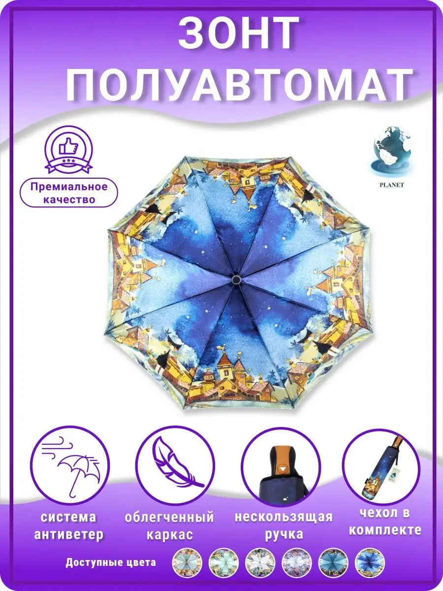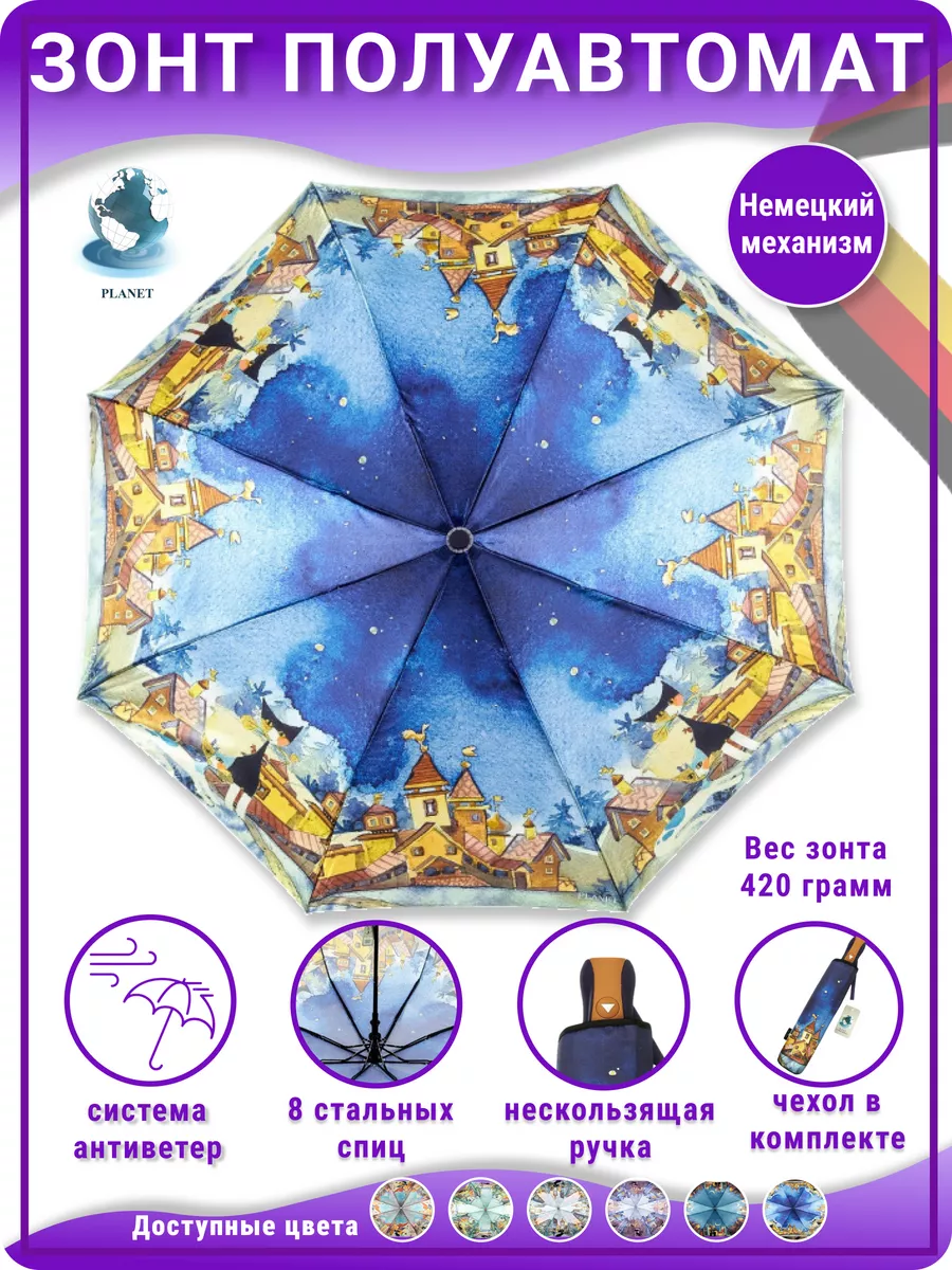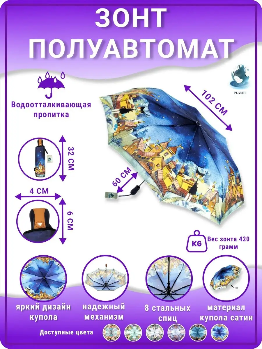Описание: Женский складной зонт полуавтоматический тм Planet – невероятно красивый, прочный, компактный, а значит очень удобный аксессуар, который всегда защитит вас от мокрого снега, дождя, знойного солнца или ветра. Стильный зонт имеет небольшой размер и свободно помещается в женской сумочке (сумку) или рюкзаке, что делает его идеальным выбором для девушек и женщин любого возраста. Благодаря небольшому весу и габаритам им сможет пользоваться девушка подросток (подростковый) и женщина любого возраста. Зонтики Planet имеют яркий оригинальный рисунок, что существенно отличает его от аналогичных зонтов других производителей. Такой дизайн всегда будет выделять вас на улице, и привлекать внимание прохожих. В плохую погоду будет поднимать вам настроение своим ярким дизайном. Сам купол изготовлен из мягкого, но прочного материала - сатин, его приятно держать в руках и использовать во время дождя. Дополнительно материал купола – сатин имеет водоотталкивающую пропитку, что позволяет зонту не впитывать влагу, во время дождя он не становится тяжелее и быстрее сохнет после дождя. Для производства каркаса полуавтоматического зонта мы используем усиленный механизм немецкого производителя, благодаря которому зонт прослужит вам очень долгое время даря комфорт и радость использования. Облегченный механизм зонта с системой Антиветер / Антишторм, который не дает зонту сломаться даже в самый сильный ветер или ураган. При максимальном давлении на купол, спицы зонта рассчитаны на то, что бы перевернуть купол в обратную стороны. Эта система не дает сломать спицы или порвать купол. В комплект к зонту входит удобный чехлом для хранения, который выполнен в одном дизайне с куполом зонта. Купив красивый и качественный зонт один раз, вы будете испытывать комфорт использования зонта каждый раз при необходимости. Зонтик аксессуар складной подойдет на зиму, весну, лето и осень, защитит от мокрого снега, дождя, ветра и знойного солнца. Благодаря компактным размерам и удобной ручке зонт можно взять с собой на прогулку, повседневной поездки на работу, путешествию, в машину, в поход, дальнюю дорогу, прогулке на улице в парке и на даче в саду. Такой зонт это отличный и презентабельный подарок любимому человеку, близким людям, партнерам по бизнесу, коллегам. Выбрав zont в качестве подарка вы подчеркнете элегантный вкус, а так же важность и заботу по отношению к близким. Зонт Planet от мирового производителя Dolphin - Planet известного поставщика качественных зонтов по всему миру. Компания Долфин имеет представителей по всему миру, таким странам как Россия, Япония, США, Индия, Китай, европейские страны. Компания производит зонты уже более 30 лет и имеет огромный опыт в производстве. В ассортименте огромное количество зонтов с разным дизайном на выбор и мужчинам, и женщинам. Не упустите свой шанс приобрести качественный и надежный женский зонт, который будет не только защищать вас от непогоды, но и станет прекрасным дополнением к вашему стилю. Как важно испытывать удобство и комфорт даже в плохую непогоду. Сделайте заказ прямо сейчас и получите еще один аксессуар для комфортной и уютной повседневной жизни!