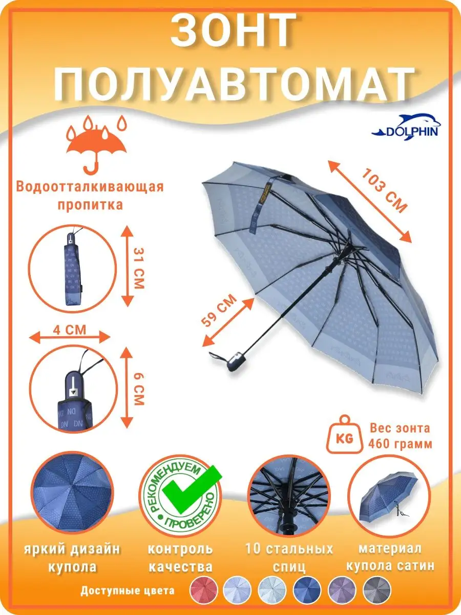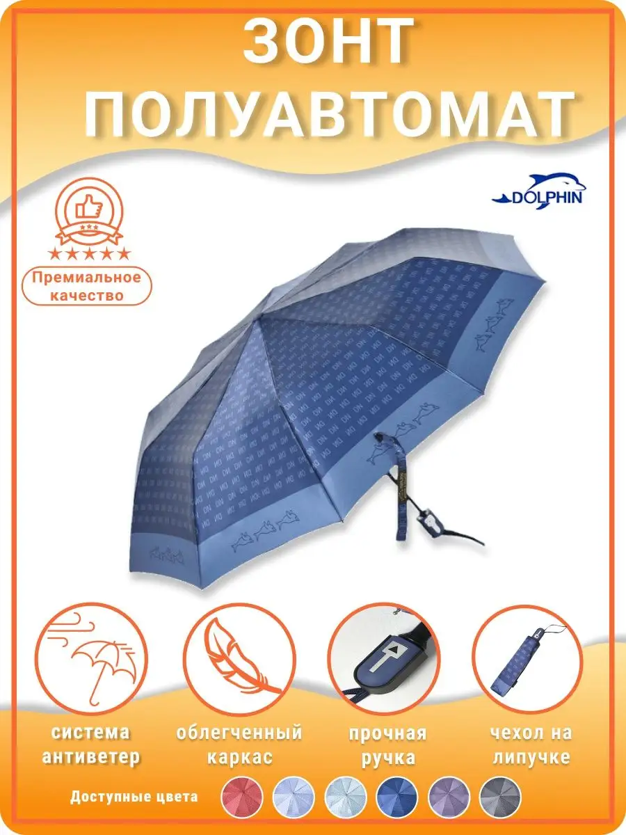 Описание: Женский складной зонт полуавтоматический тм Dolphin - ккрасивый, прочный, компактный, а значит очень удобный аксессуар, который всегда защитит вас от мокрого снега, дождя, знойного солнца или ветра. Стильный зонт имеет небольшой размер и свободно помещается в женской сумочке (в сумку) или рюкзаке, что делает его идеальным выбором для девушек и женщин любого возраста. Благодаря небольшому весу и габаритам им сможет пользоваться девушка подросток (подростковый) и женщина любого возраста. Зонтики женские полуавтомат Dolphin имеют яркий оригинальный рисунок, что существенно отличает его от аналогичных зонтов других производителей. Такой дизайн всегда будет выделять вас на улице, и привлекать внимание прохожих. В плохую погоду будет поднимать вам настроение своим ярким дизайном. Сам купол большой изготовлен из мягкого, но прочного материала - сатин, его приятно держать в руках и использовать во время дождя. Дополнительно материал купола – сатин имеет водоотталкивающую пропитку, что позволяет зонту не впитывать влагу, во время дождя он не становится тяжелее и быстрее сохнет после дождя. Для производства каркаса полуавтоматического зонта мы используем усиленный механизм немецкого производителя, благодаря которому зонт прослужит вам очень долгое время даря комфорт и радость использования. Облегченный механизм зонта с системой Антиветер / Антишторм, который не дает зонту сломаться даже в самый сильный ветер или ураган. При максимальном давлении на купол, спицы зонта рассчитаны на то, что бы перевернуть купол в обратную стороны. Эта система не дает сломать спицы или порвать купол. Зонт полный полуавтомат. В комплект к зонту входит удобный чехлом для хранения в сложенном виде, который выполнен в одном дизайне с куполом зонта. Купив ккрасивый и качественный зонт один раз, вы будете испытывать комфорт использования зонта каждый раз при необходимости. Зонтик аксессуар складной подойдет на зиму, весну, лето и осень, защитит от мокрого снега, дождя, ветра и знойного солнца. Благодаря компактным размерам и удобной ручке маленький зонт можно взять с собой на прогулку, повседневной поездки на работу, путешествию, в машину, в поход, дальнюю дорогу, прогулке на улице в парке и на даче в саду. Такой зонт это отличный и презентабельный подарок любимому человеку, близким людям, партнерам по бизнесу, коллегам. Выбрав zont в качестве подарка вы подчеркнете элегантный вкус, а так же важность и заботу по отношению к близким. Легкие женские зонты Dolphin от мирового производителя Dolphin - Planet известного поставщика качественных зонтов из стали по всему миру. Компания Долфин имеет представителей по всему миру, таким странам как Россия, Япония, США, Индия, Китай, европейские страны. Компания производит зонты уже более 30 лет и имеет огромный опыт в производстве. В ассортименте огромное количество зонтов с разным дизайном на выбор и мужчинам, и женщинам. Не упустите свой шанс приобрести качественный и надежный женский зонт, который будет не только защищать вас от непогоды, но и станет прекрасным дополнением к вашему стилю. Как важно испытывать удобство и комфорт даже в плохую непогоду. Сделайте заказ прямо сейчас и получите еще один аксессуар для комфортной и уютной повседневной жизни!