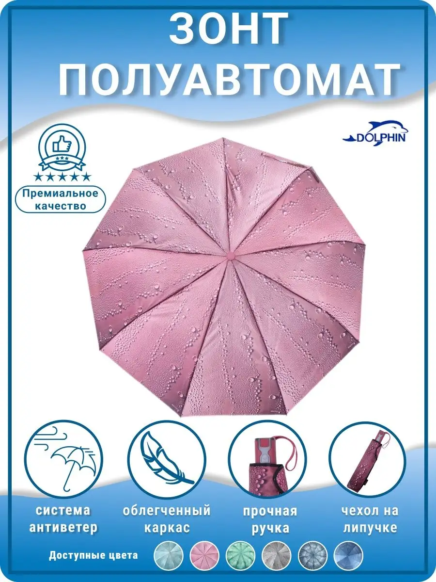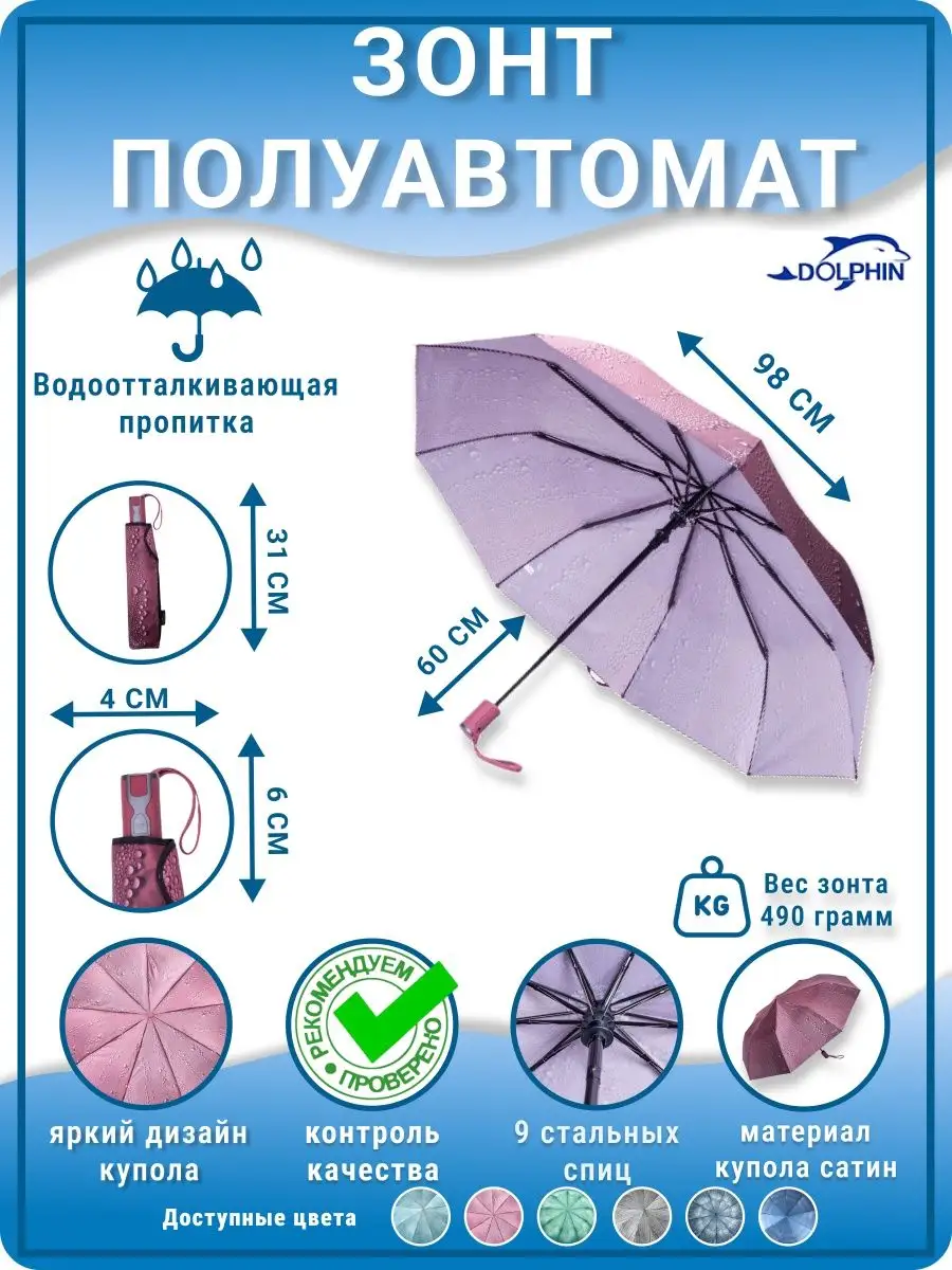 Описание: Женский складной зонт полуавтоматический тм Dolphin - ккрасивый, прочный, компактный, а значит очень удобный аксессуар, который всегда защитит вас от мокрого снега, дождя, знойного солнца или ветра. Стильный зонт имеет небольшой размер и свободно помещается в женской сумочке (в сумку) или рюкзаке, что делает его идеальным выбором для девушек и женщин любого возраста. Благодаря небольшому весу и габаритам им сможет пользоваться девушка подросток (подростковый) и женщина любого возраста. Зонтики женские полуавтомат Dolphin имеют яркий оригинальный рисунок, что существенно отличает его от аналогичных зонтов других производителей. Такой дизайн всегда будет выделять вас на улице, и привлекать внимание прохожих. В плохую погоду будет поднимать вам настроение своим ярким дизайном. Сам купол большой изготовлен из мягкого, но прочного материала - сатин, его приятно держать в руках и использовать во время дождя. Дополнительно материал купола – сатин имеет водоотталкивающую пропитку, что позволяет зонту не впитывать влагу, во время дождя он не становится тяжелее и быстрее сохнет после дождя. Для производства каркаса полуавтоматического зонта мы используем усиленный механизм немецкого производителя, благодаря которому зонт прослужит вам очень долгое время даря комфорт и радость использования. Облегченный механизм зонта с системой Антиветер / Антишторм, который не дает зонту сломаться даже в самый сильный ветер или ураган. При максимальном давлении на купол, спицы зонта рассчитаны на то, что бы перевернуть купол в обратную стороны. Эта система не дает сломать спицы или порвать купол. Зонт полный полуавтомат. В комплект к зонту входит удобный чехлом для хранения в сложенном виде, который выполнен в одном дизайне с куполом зонта. Купив ккрасивый и качественный зонт один раз, вы будете испытывать комфорт использования зонта каждый раз при необходимости. Зонтик аксессуар складной подойдет на зиму, весну, лето и осень, защитит от мокрого снега, дождя, ветра и знойного солнца. Благодаря компактным размерам и удобной ручке маленький зонт можно взять с собой на прогулку, повседневной поездки на работу, путешествию, в машину, в поход, дальнюю дорогу, прогулке на улице в парке и на даче в саду. Такой зонт это отличный и презентабельный подарок любимому человеку, близким людям, партнерам по бизнесу, коллегам. Выбрав zont в качестве подарка вы подчеркнете элегантный вкус, а так же важность и заботу по отношению к близким. Легкие женские зонты Dolphin от мирового производителя Dolphin - Planet известного поставщика качественных зонтов из стали по всему миру. Компания Долфин имеет представителей по всему миру, таким странам как Россия, Япония, США, Индия, Китай, европейские страны. Компания производит зонты уже более 30 лет и имеет огромный опыт в производстве. В ассортименте огромное количество зонтов с разным дизайном на выбор и мужчинам, и женщинам. Не упустите свой шанс приобрести качественный и надежный женский зонт, который будет не только защищать вас от непогоды, но и станет прекрасным дополнением к вашему стилю. Как важно испытывать удобство и комфорт даже в плохую непогоду. Сделайте заказ прямо сейчас и получите еще один аксессуар для комфортной и уютной повседневной жизни!
