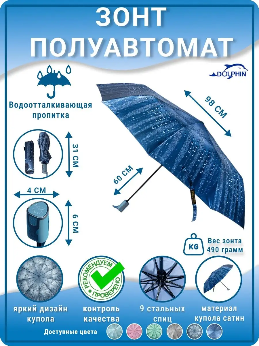 Описание: Женский складной зонт полуавтоматический тм Dolphin - ккрасивый, прочный, компактный, а значит очень удобный аксессуар, который всегда защитит вас от мокрого снега, дождя, знойного солнца или ветра. Стильный зонт имеет небольшой размер и свободно помещается в женской сумочке (в сумку) или рюкзаке, что делает его идеальным выбором для девушек и женщин любого возраста. Благодаря небольшому весу и габаритам им сможет пользоваться девушка подросток (подростковый) и женщина любого возраста. Зонтики женские полуавтомат Dolphin имеют яркий оригинальный рисунок, что существенно отличает его от аналогичных зонтов других производителей. Такой дизайн всегда будет выделять вас на улице, и привлекать внимание прохожих. В плохую погоду будет поднимать вам настроение своим ярким дизайном. Сам купол большой изготовлен из мягкого, но прочного материала - сатин, его приятно держать в руках и использовать во время дождя. Дополнительно материал купола – сатин имеет водоотталкивающую пропитку, что позволяет зонту не впитывать влагу, во время дождя он не становится тяжелее и быстрее сохнет после дождя. Для производства каркаса полуавтоматического зонта мы используем усиленный механизм немецкого производителя, благодаря которому зонт прослужит вам очень долгое время даря комфорт и радость использования. Облегченный механизм зонта с системой Антиветер / Антишторм, который не дает зонту сломаться даже в самый сильный ветер или ураган. При максимальном давлении на купол, спицы зонта рассчитаны на то, что бы перевернуть купол в обратную стороны. Эта система не дает сломать спицы или порвать купол. Зонт полный полуавтомат. В комплект к зонту входит удобный чехлом для хранения в сложенном виде, который выполнен в одном дизайне с куполом зонта. Купив ккрасивый и качественный зонт один раз, вы будете испытывать комфорт использования зонта каждый раз при необходимости. Зонтик аксессуар складной подойдет на зиму, весну, лето и осень, защитит от мокрого снега, дождя, ветра и знойного солнца. Благодаря компактным размерам и удобной ручке маленький зонт можно взять с собой на прогулку, повседневной поездки на работу, путешествию, в машину, в поход, дальнюю дорогу, прогулке на улице в парке и на даче в саду. Такой зонт это отличный и презентабельный подарок любимому человеку, близким людям, партнерам по бизнесу, коллегам. Выбрав zont в качестве подарка вы подчеркнете элегантный вкус, а так же важность и заботу по отношению к близким. Легкие женские зонты Dolphin от мирового производителя Dolphin - Planet известного поставщика качественных зонтов из стали по всему миру. Компания Долфин имеет представителей по всему миру, таким странам как Россия, Япония, США, Индия, Китай, европейские страны. Компания производит зонты уже более 30 лет и имеет огромный опыт в производстве. В ассортименте огромное количество зонтов с разным дизайном на выбор и мужчинам, и женщинам. Не упустите свой шанс приобрести качественный и надежный женский зонт, который будет не только защищать вас от непогоды, но и станет прекрасным дополнением к вашему стилю. Как важно испытывать удобство и комфорт даже в плохую непогоду. Сделайте заказ прямо сейчас и получите еще один аксессуар для комфортной и уютной повседневной жизни!