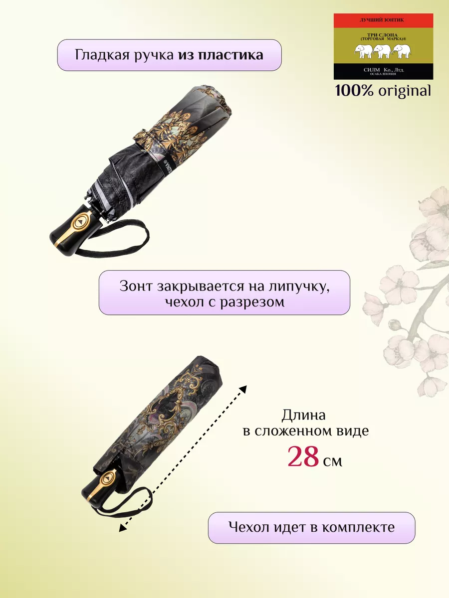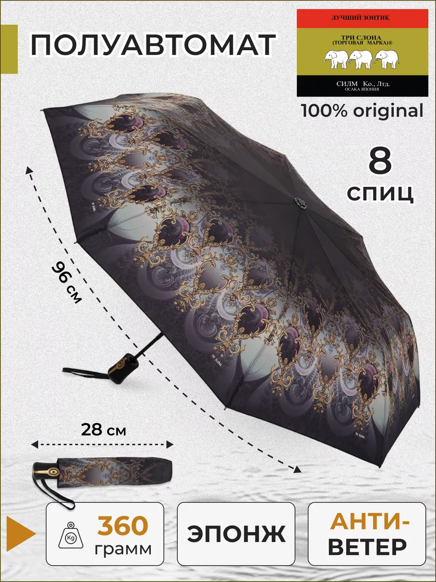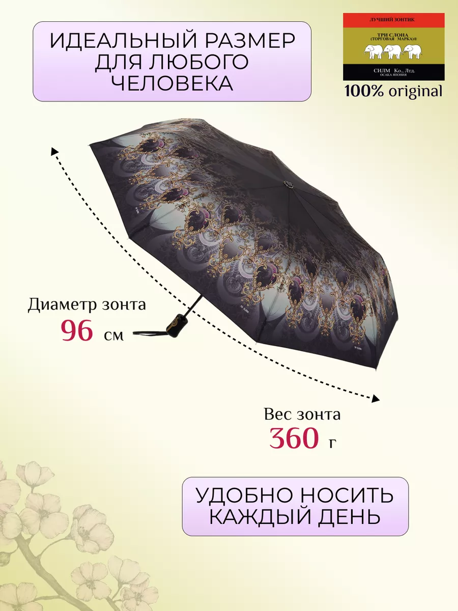 Описание: Женский складной зонт от бренда Три Слона подойдет для защиты от дождя и солнца и станет отличным подарком для любимой, жены, мамы, дочки, учителя. Характеристики: полный автомат, 8 спиц, вес 360 г, 3 сложения, длина в сложенном виде 28 см, фактический диаметр купола 96 см (по низу от спицы до спицы), материал купола Эпонж (100% Полиэстер), материал ручки пластик, длина ручки 6 см, зонт закрывается на липучку, чехол без застежки. Каркас и спицы выполнены из стали, алюминия, фибергласса. В комплекте зонт и чехол. Во все наши зонты встроена система антиветер, при сильных порывах ветра зонт выворачивается, амортизируя спицы и защищая их от поломки. На зонты бренда Три Слона действует гарантия 6 месяцев, гарантия распространяется на производственный брак и не распространяется на механические повреждения, в том числе на поломку спиц в процессе эксплуатации. Несмотря на самые современные материалы и конструктивные решения, при очень сильных порывах ветра спицы могут сломаться, вечных вещей человечество еще не изобрело. Зонтик станет лучшим помощником в непогоду, в отпуске, на пляже, в поездке, на прогулке, в авто, в багажник или бардачок машины. Благодаря тефлоновой пропитке, зонт не только отталкивает воду, но и защищает от вредного воздействия ультрафиолета, от солнца, а значит его можно использовать как пляжный зонт. Вы сможете сделать действительно нужный подарок на день рождения, 8 марта, 23 февраля, 14 февраля, день влюбленных, новый год, день учителя, 1 сентября, день матери, благодаря фирменному подарочному пакету, который вы получите при покупке зонта. Три Слона-это знаменитый во всем мире и постсоветском пространстве бренд зонтов, качество которых проверено годами, он обеспечит долгую службу и станет незаменимым защитником от дождя. Мы являемся официальным представителем бренда Три Слона, у нас вы можете купить 100% оригинальную продукцию, которая имеет фирменные навесные и вшивные бирки, заводскую выштамповку на стержне, голографическую наклейку, что подтверждает безупречное качество. В нашем ассортименте представлено большое количество разнообразных и стильных зонтов на любой вкус.