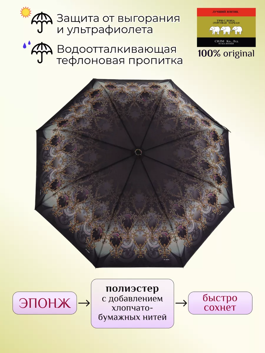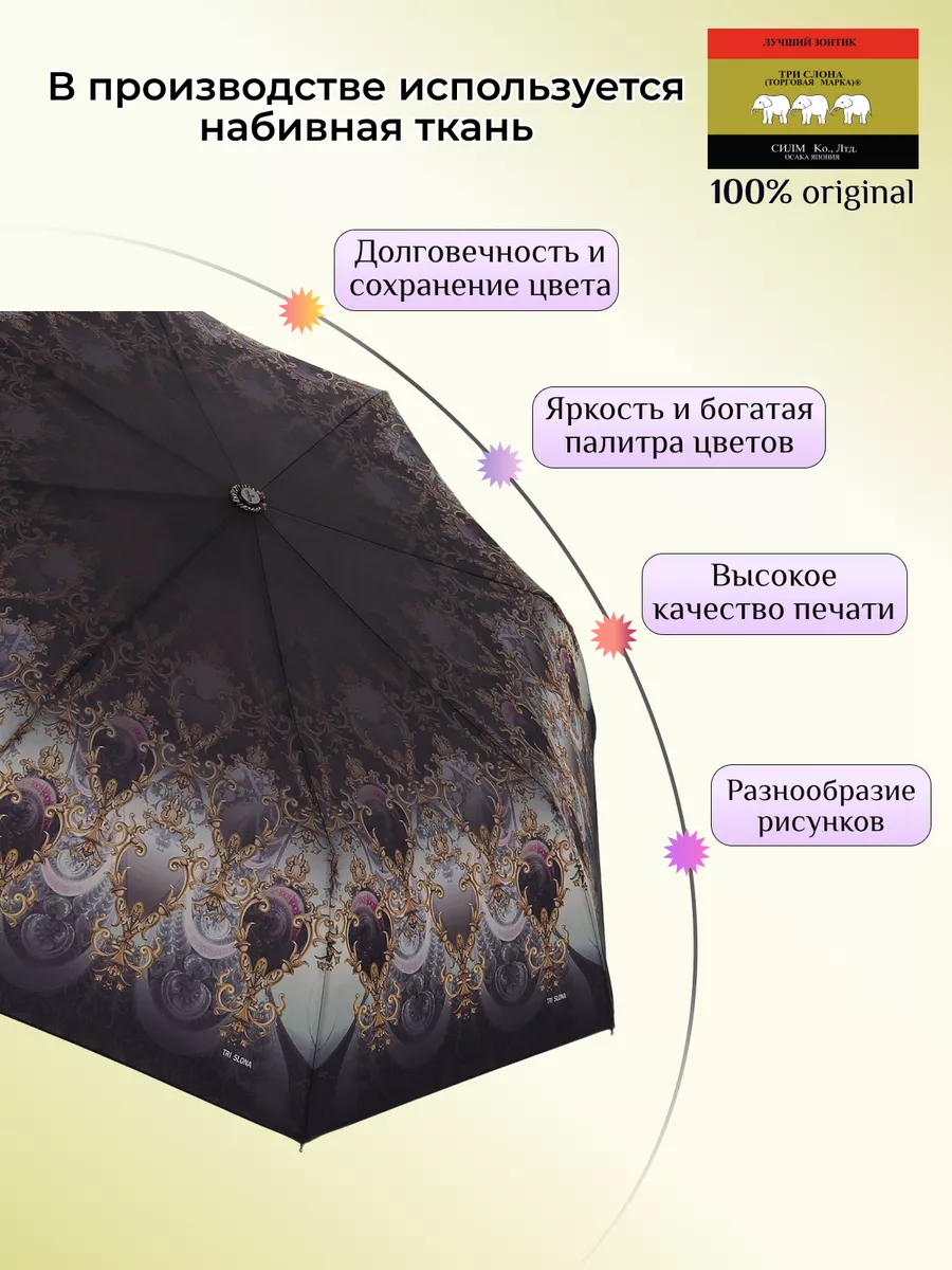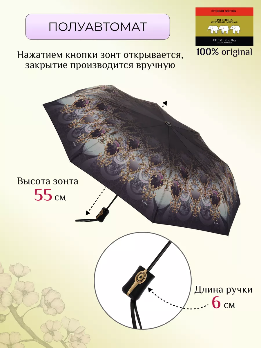 Описание: Женский складной зонт от бренда Три Слона подойдет для защиты от дождя и солнца и станет отличным подарком для любимой, жены, мамы, дочки, учителя. Характеристики: полный автомат, 8 спиц, вес 360 г, 3 сложения, длина в сложенном виде 28 см, фактический диаметр купола 96 см (по низу от спицы до спицы), материал купола Эпонж (100% Полиэстер), материал ручки пластик, длина ручки 6 см, зонт закрывается на липучку, чехол без застежки. Каркас и спицы выполнены из стали, алюминия, фибергласса. В комплекте зонт и чехол. Во все наши зонты встроена система антиветер, при сильных порывах ветра зонт выворачивается, амортизируя спицы и защищая их от поломки. На зонты бренда Три Слона действует гарантия 6 месяцев, гарантия распространяется на производственный брак и не распространяется на механические повреждения, в том числе на поломку спиц в процессе эксплуатации. Несмотря на самые современные материалы и конструктивные решения, при очень сильных порывах ветра спицы могут сломаться, вечных вещей человечество еще не изобрело. Зонтик станет лучшим помощником в непогоду, в отпуске, на пляже, в поездке, на прогулке, в авто, в багажник или бардачок машины. Благодаря тефлоновой пропитке, зонт не только отталкивает воду, но и защищает от вредного воздействия ультрафиолета, от солнца, а значит его можно использовать как пляжный зонт. Вы сможете сделать действительно нужный подарок на день рождения, 8 марта, 23 февраля, 14 февраля, день влюбленных, новый год, день учителя, 1 сентября, день матери, благодаря фирменному подарочному пакету, который вы получите при покупке зонта. Три Слона-это знаменитый во всем мире и постсоветском пространстве бренд зонтов, качество которых проверено годами, он обеспечит долгую службу и станет незаменимым защитником от дождя. Мы являемся официальным представителем бренда Три Слона, у нас вы можете купить 100% оригинальную продукцию, которая имеет фирменные навесные и вшивные бирки, заводскую выштамповку на стержне, голографическую наклейку, что подтверждает безупречное качество. В нашем ассортименте представлено большое количество разнообразных и стильных зонтов на любой вкус.