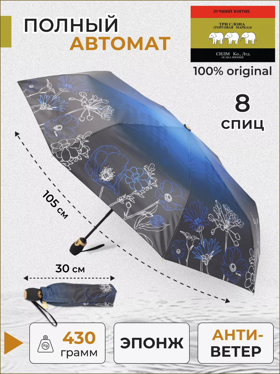 Описание: Женский складной зонт от бренда Три Слона подойдет для защиты от дождя и солнца и станет отличным подарком для любимой, жены, мамы, дочки. Характеристики: полный автомат, 8 спиц, вес 430 г, 3 сложения, длина в сложенном виде 30 см, фактический диаметр купола 105 см (по низу от спицы до спицы), материал купола Эпонж (100% Полиэстер), материал ручки пластик (soft-touch), длина ручки 6 см, зонт закрывается на кнопку, чехол закрывается на молнию. Каркас и спицы выполнены из стали, алюминия, фибергласса. В комплекте зонт и чехол. Во все наши зонты встроена система антиветер, при сильных порывах ветра зонт выворачивается, амортизируя спицы и защищая их от поломки. На зонты бренда Три Слона действует гарантия 6 месяцев, гарантия распространяется на производственный брак и не распространяется на механические повреждения, в том числе на поломку спиц в процессе эксплуатации. Несмотря на самые современные материалы и конструктивные решения, при очень сильных порывах ветра спицы могут сломаться, вечных вещей человечество еще не изобрело. Зонтик станет лучшим помощником в непогоду, в отпуске, на пляже, в поездке, на прогулке, в авто, в багажник или бардачок машины. Благодаря тефлоновой пропитке, зонт не только отталкивает воду, но и защищает от вредного воздействия ультрафиолета, от солнца, а значит его можно использовать как пляжный зонт. Вы сможете сделать действительно нужный подарок на день рождения, 8 марта, 23 февраля, 14 февраля, день влюбленных, новый год, день учителя, 1 сентября, день матери, благодаря фирменному подарочному пакету, который вы получите при покупке зонта. Три Слона-это знаменитый во всем мире и постсоветском пространстве бренд зонтов, качество которых проверено годами, он обеспечит долгую службу и станет незаменимым защитником от дождя. Мы являемся официальным представителем бренда Три Слона, у нас вы можете купить 100% оригинальную продукцию, которая имеет фирменные навесные и вшивные бирки, заводскую выштамповку на стержне, голографическую наклейку, что подтверждает безупречное качество. В нашем ассортименте представлено большое количество разнообразных и стильных зонтов на любой вкус.