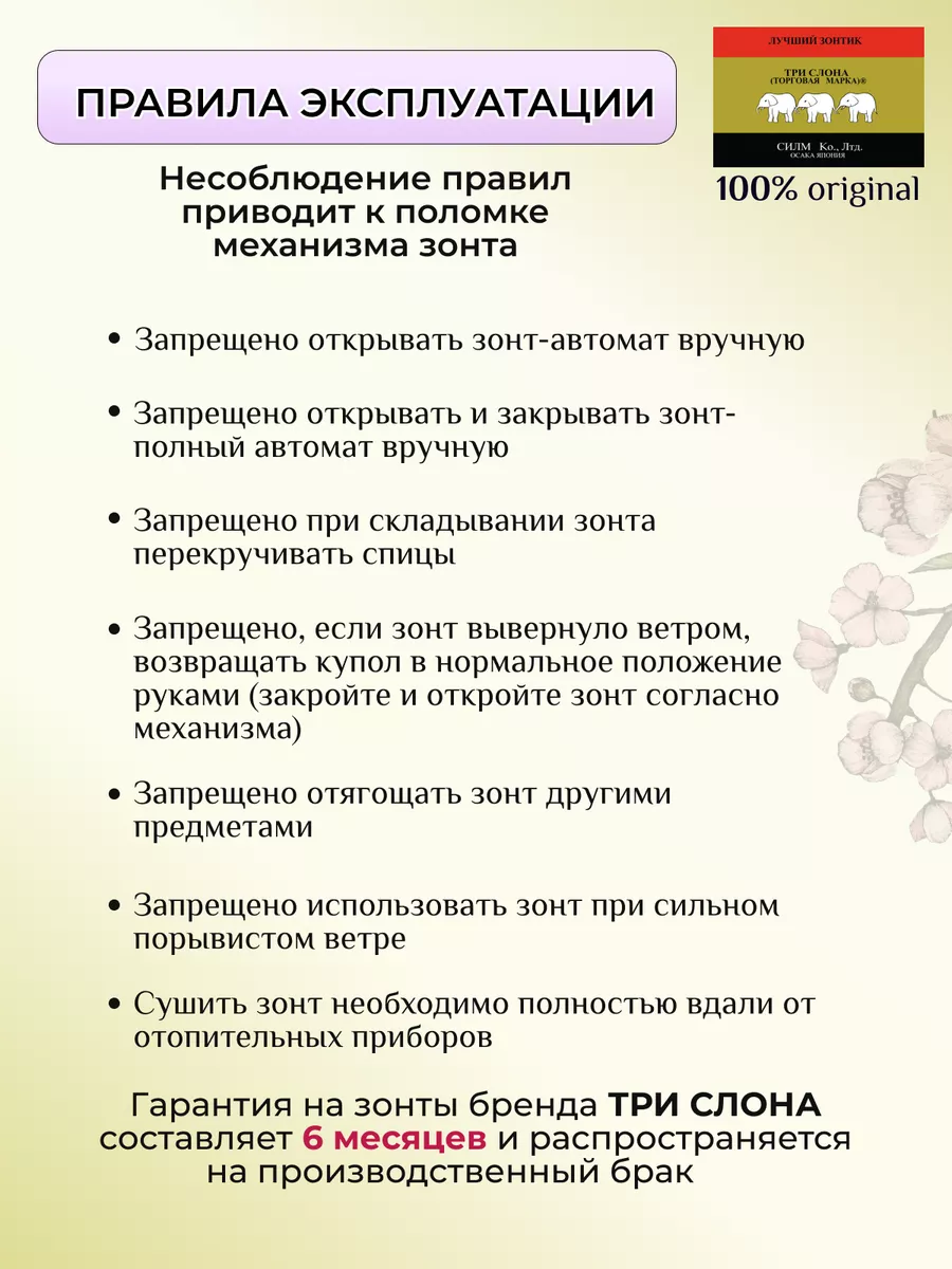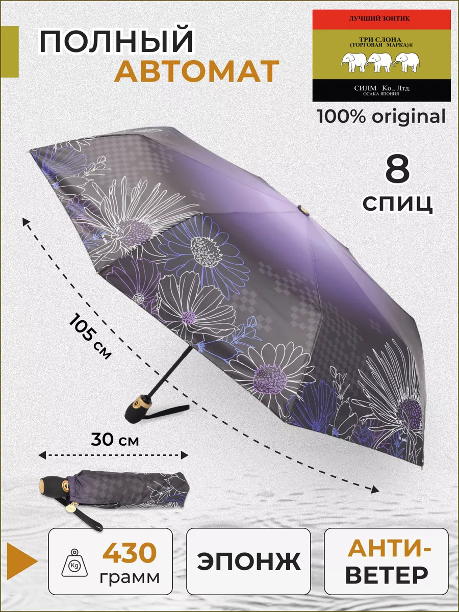 Описание: Женский складной зонт от бренда Три Слона подойдет для защиты от дождя и солнца и станет отличным подарком для любимой, жены, мамы, дочки. Характеристики: полный автомат, 8 спиц, вес 430 г, 3 сложения, длина в сложенном виде 30 см, фактический диаметр купола 105 см (по низу от спицы до спицы), материал купола Эпонж (100% Полиэстер), материал ручки пластик (soft-touch), длина ручки 6 см, зонт закрывается на кнопку, чехол закрывается на молнию. Каркас и спицы выполнены из стали, алюминия, фибергласса. В комплекте зонт и чехол. Во все наши зонты встроена система антиветер, при сильных порывах ветра зонт выворачивается, амортизируя спицы и защищая их от поломки. На зонты бренда Три Слона действует гарантия 6 месяцев, гарантия распространяется на производственный брак и не распространяется на механические повреждения, в том числе на поломку спиц в процессе эксплуатации. Несмотря на самые современные материалы и конструктивные решения, при очень сильных порывах ветра спицы могут сломаться, вечных вещей человечество еще не изобрело. Зонтик станет лучшим помощником в непогоду, в отпуске, на пляже, в поездке, на прогулке, в авто, в багажник или бардачок машины. Благодаря тефлоновой пропитке, зонт не только отталкивает воду, но и защищает от вредного воздействия ультрафиолета, от солнца, а значит его можно использовать как пляжный зонт. Вы сможете сделать действительно нужный подарок на день рождения, 8 марта, 23 февраля, 14 февраля, день влюбленных, новый год, день учителя, 1 сентября, день матери, благодаря фирменному подарочному пакету, который вы получите при покупке зонта. Три Слона-это знаменитый во всем мире и постсоветском пространстве бренд зонтов, качество которых проверено годами, он обеспечит долгую службу и станет незаменимым защитником от дождя. Мы являемся официальным представителем бренда Три Слона, у нас вы можете купить 100% оригинальную продукцию, которая имеет фирменные навесные и вшивные бирки, заводскую выштамповку на стержне, голографическую наклейку, что подтверждает безупречное качество. В нашем ассортименте представлено большое количество разнообразных и стильных зонтов на любой вкус.