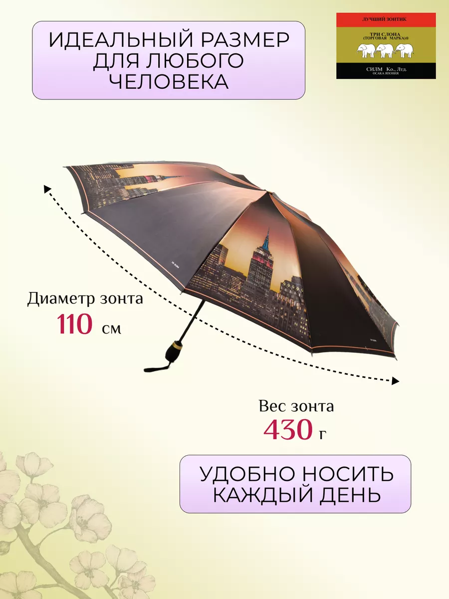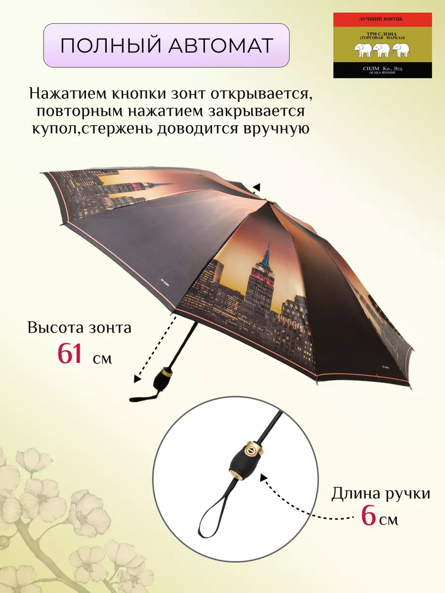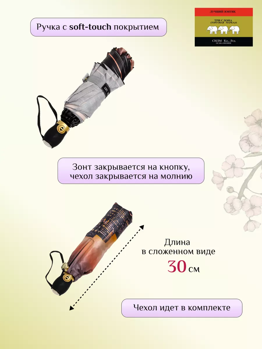 Описание: Женский складной зонт от бренда Три Слона подойдет для защиты от дождя и солнца и станет отличным подарком для любимой, жены, мамы, дочки, учителя. Характеристики: полный автомат, 10 спиц, вес 430 г, 3 сложения, длина в сложенном виде 30 см, фактический диаметр купола 110 см (по низу от спицы до спицы), материал купола Сатин (100% Полиэстер), материал ручки пластик (soft-touch), длина ручки 6 см, зонт закрывается на кнопку, чехол закрывается на молнию. Каркас и спицы выполнены из стали, алюминия, фибергласса. В комплекте зонт и чехол. Во все наши зонты встроена система антиветер, при сильных порывах ветра зонт выворачивается, амортизируя спицы и защищая их от поломки. На зонты бренда Три Слона действует гарантия 6 месяцев, гарантия распространяется на производственный брак и не распространяется на механические повреждения, в том числе на поломку спиц в процессе эксплуатации. Несмотря на самые современные материалы и конструктивные решения, при очень сильных порывах ветра спицы могут сломаться, вечных вещей человечество еще не изобрело. Зонтик станет лучшим помощником в непогоду, в отпуске, на пляже, в поездке, на прогулке, в авто, в багажник или бардачок машины. Благодаря тефлоновой пропитке, зонт не только отталкивает воду, но и защищает от вредного воздействия ультрафиолета, от солнца, а значит его можно использовать как пляжный зонт. Вы сможете сделать действительно нужный подарок на день рождения, 8 марта, 23 февраля, 14 февраля, день влюбленных, новый год, день учителя, 1 сентября, день матери, благодаря фирменному подарочному пакету, который вы получите при покупке зонта. Три Слона — это знаменитый во всем мире и постсоветском пространстве бренд зонтов, качество которых проверено годами, он обеспечит долгую службу и станет незаменимым защитником от дождя. Мы являемся официальным представителем бренда Три Слона, у нас вы можете купить 100% оригинальную продукцию, которая имеет фирменные навесные и вшивные бирки, заводскую выштамповку на стержне, голографическую наклейку, что подтверждает безупречное качество. В нашем ассортименте представлено большое количество разнообразных и стильных зонтов на любой вкус.