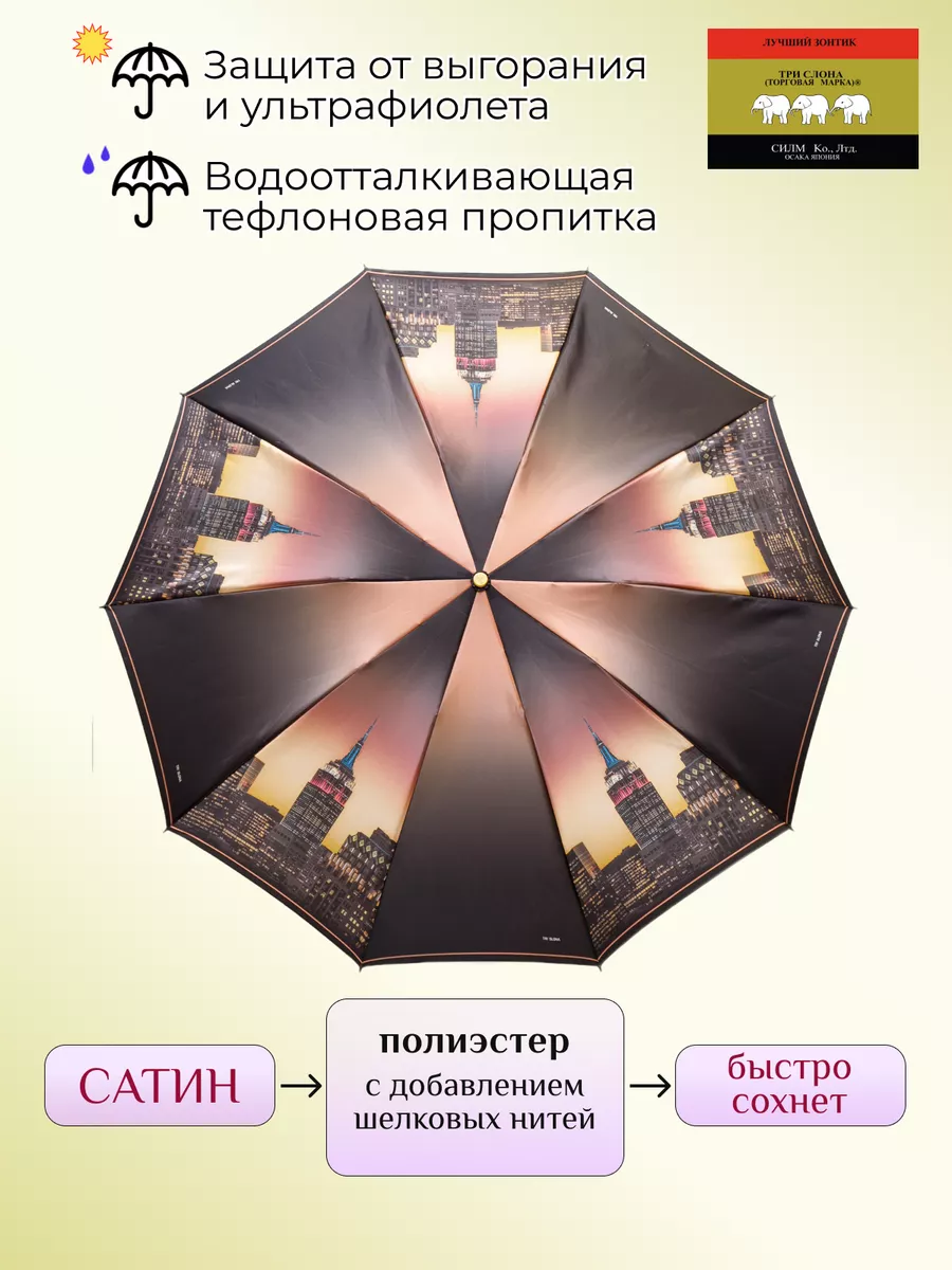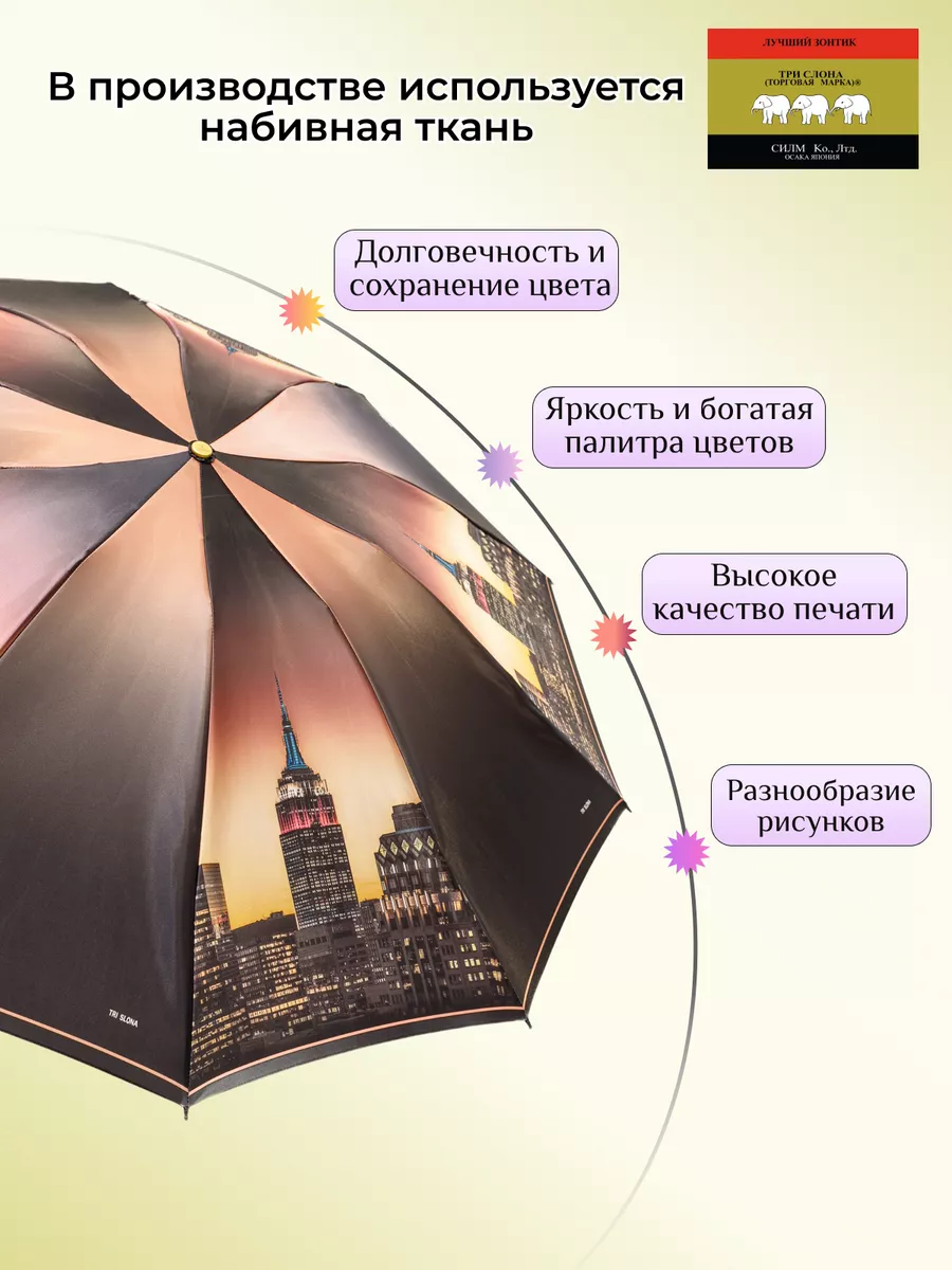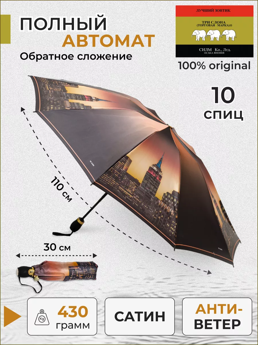 Описание: Женский складной зонт от бренда Три Слона подойдет для защиты от дождя и солнца и станет отличным подарком для любимой, жены, мамы, дочки, учителя. Характеристики: полный автомат, 10 спиц, вес 430 г, 3 сложения, длина в сложенном виде 30 см, фактический диаметр купола 110 см (по низу от спицы до спицы), материал купола Сатин (100% Полиэстер), материал ручки пластик (soft-touch), длина ручки 6 см, зонт закрывается на кнопку, чехол закрывается на молнию. Каркас и спицы выполнены из стали, алюминия, фибергласса. В комплекте зонт и чехол. Во все наши зонты встроена система антиветер, при сильных порывах ветра зонт выворачивается, амортизируя спицы и защищая их от поломки. На зонты бренда Три Слона действует гарантия 6 месяцев, гарантия распространяется на производственный брак и не распространяется на механические повреждения, в том числе на поломку спиц в процессе эксплуатации. Несмотря на самые современные материалы и конструктивные решения, при очень сильных порывах ветра спицы могут сломаться, вечных вещей человечество еще не изобрело. Зонтик станет лучшим помощником в непогоду, в отпуске, на пляже, в поездке, на прогулке, в авто, в багажник или бардачок машины. Благодаря тефлоновой пропитке, зонт не только отталкивает воду, но и защищает от вредного воздействия ультрафиолета, от солнца, а значит его можно использовать как пляжный зонт. Вы сможете сделать действительно нужный подарок на день рождения, 8 марта, 23 февраля, 14 февраля, день влюбленных, новый год, день учителя, 1 сентября, день матери, благодаря фирменному подарочному пакету, который вы получите при покупке зонта. Три Слона — это знаменитый во всем мире и постсоветском пространстве бренд зонтов, качество которых проверено годами, он обеспечит долгую службу и станет незаменимым защитником от дождя. Мы являемся официальным представителем бренда Три Слона, у нас вы можете купить 100% оригинальную продукцию, которая имеет фирменные навесные и вшивные бирки, заводскую выштамповку на стержне, голографическую наклейку, что подтверждает безупречное качество. В нашем ассортименте представлено большое количество разнообразных и стильных зонтов на любой вкус.