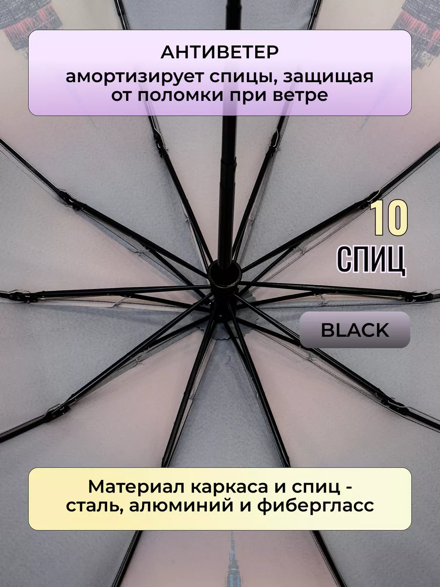 Доп. опции зонта антиветер; 10 спиц; зонт закрывается на кнопку, чехол закрывается на молнию