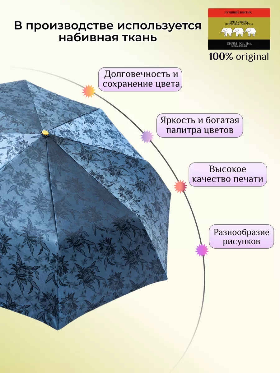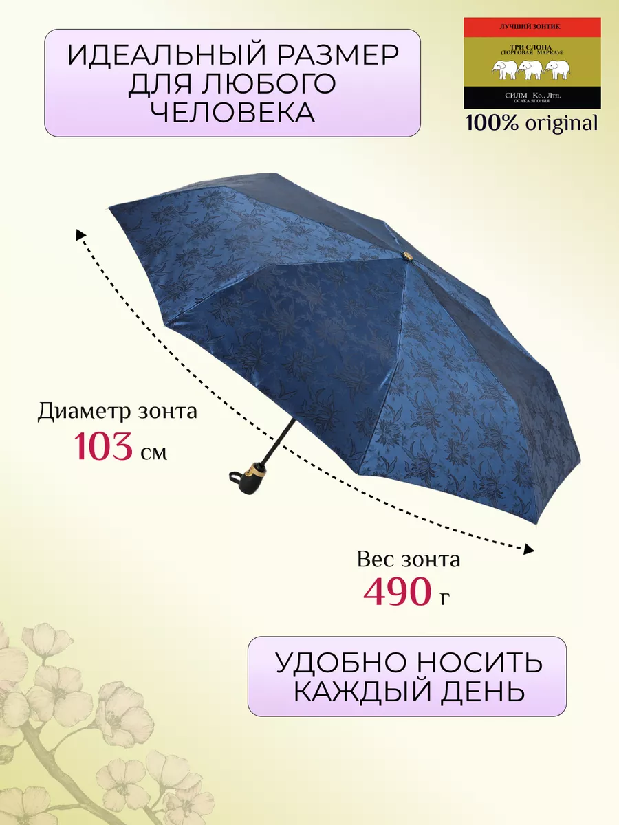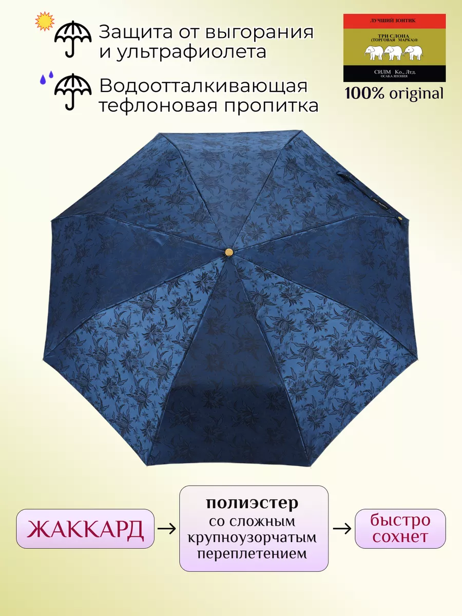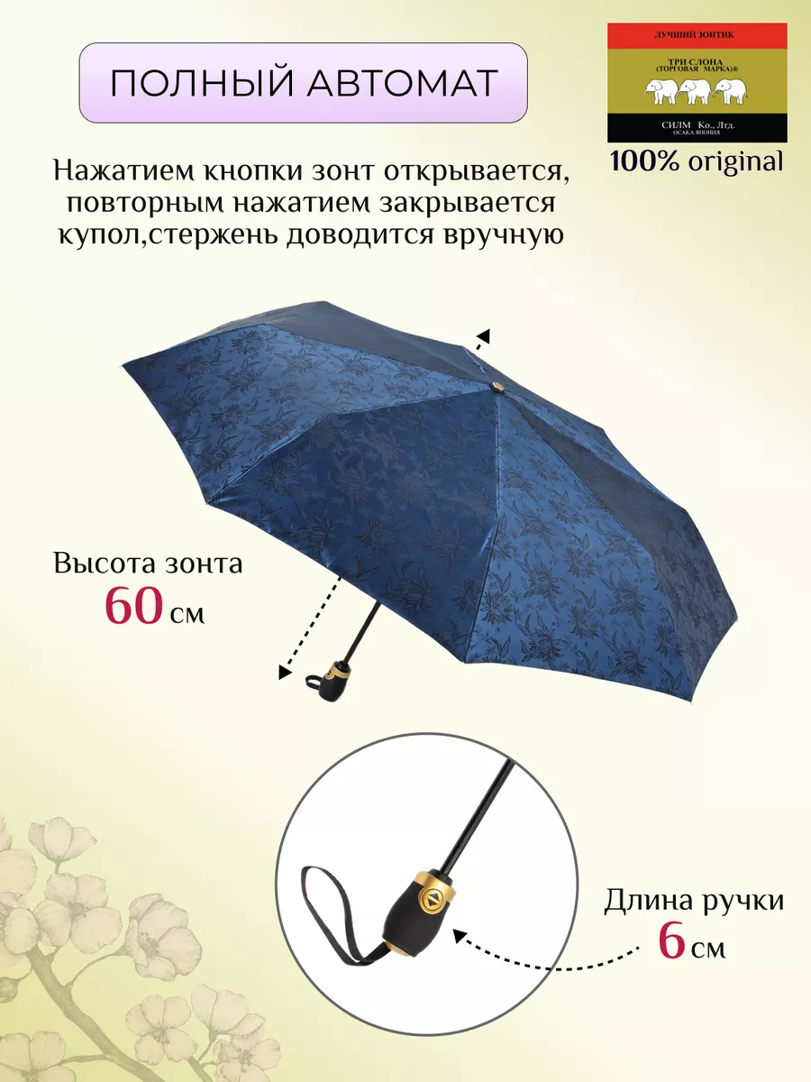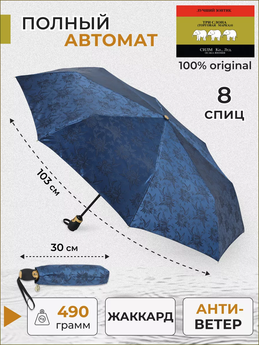 Описание: Женский складной зонт от бренда Три Слона подойдет для защиты от дождя и солнца и станет отличным подарком для любимой, жены, мамы, дочки, учителя. Характеристики: полный автомат, 8 спиц, вес 490 г, 3 сложения, длина в сложенном виде 30 см, фактический диаметр купола 103 см (по низу от спицы до спицы), материал купола Жаккард (100% Полиэстер), материал ручки пластик (soft-touch), длина ручки 6 см, зонт закрывается на кнопку, чехол закрывается на молнию. Каркас и спицы выполнены из стали, алюминия, фибергласса. В комплекте зонт и чехол. Во все наши зонты встроена система антиветер, при сильных порывах ветра зонт выворачивается, амортизируя спицы и защищая их от поломки. На зонты бренда Три Слона действует гарантия 6 месяцев, гарантия распространяется на производственный брак и не распространяется на механические повреждения, в том числе на поломку спиц в процессе эксплуатации. Несмотря на самые современные материалы и конструктивные решения, при очень сильных порывах ветра спицы могут сломаться, вечных вещей человечество еще не изобрело. Зонтик станет лучшим помощником в непогоду, в отпуске, на пляже, в поездке, на прогулке, в авто, в багажник или бардачок машины. Благодаря тефлоновой пропитке, зонт не только отталкивает воду, но и защищает от вредного воздействия ультрафиолета, от солнца, а значит его можно использовать как пляжный зонт. Вы сможете сделать действительно нужный подарок на день рождения, 8 марта, 23 февраля, 14 февраля, день влюбленных, новый год, день учителя, 1 сентября, день матери, благодаря фирменному подарочному пакету, который вы получите при покупке зонта. Три Слона-это знаменитый во всем мире и постсоветском пространстве бренд зонтов, качество которых проверено годами, он обеспечит долгую службу и станет незаменимым защитником от дождя. Мы являемся официальным представителем бренда Три Слона, у нас вы можете купить 100% оригинальную продукцию, которая имеет фирменные навесные и вшивные бирки, заводскую выштамповку на стержне, голографическую наклейку, что подтверждает безупречное качество. В нашем ассортименте представлено большое количество разнообразных и стильных зонтов на любой вкус.