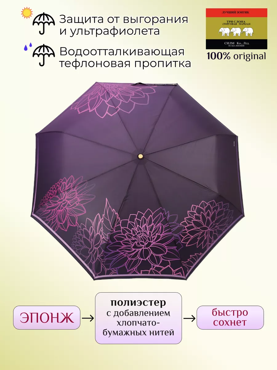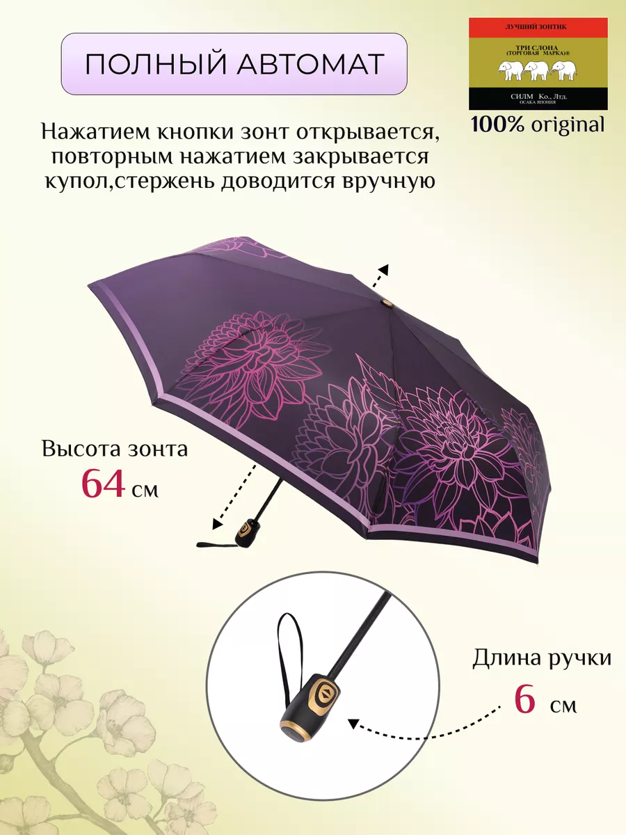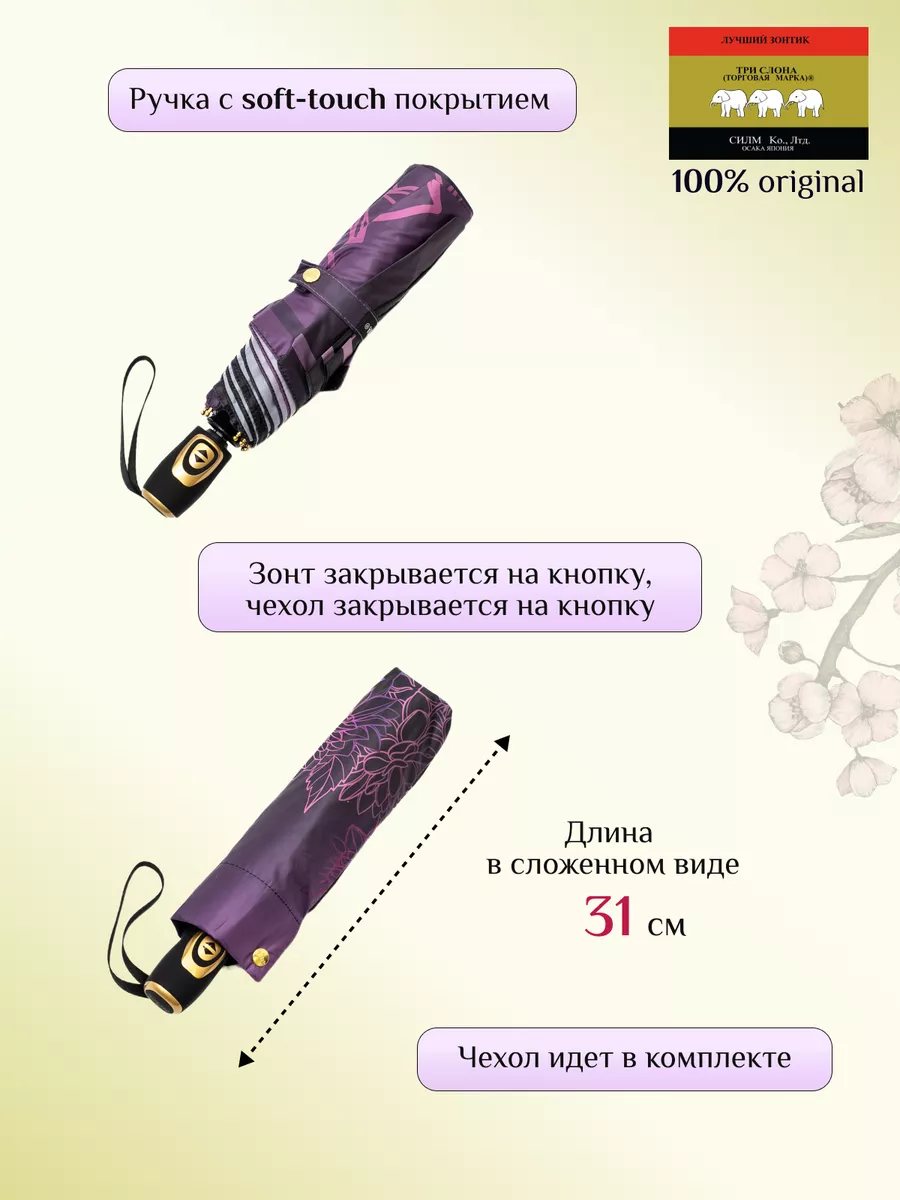 Описание: Женский складной зонт от бренда Три Слона подойдет для защиты от дождя и солнца и станет отличным подарком для любимой, жены, мамы, дочки, учителя. Характеристики: полный автомат, 8 спиц, вес 430 г, 3 сложения, длина в сложенном виде 31 см, фактический диаметр купола 109 см (по низу от спицы до спицы), материал купола Эпонж (100% Полиэстер), материал ручки пластик (soft-touch), длина ручки 6 см, зонт закрывается на кнопку, чехол закрывается на кнопку. Каркас и спицы выполнены из стали, алюминия, фибергласса. В комплекте зонт и чехол. Во все наши зонты встроена система антиветер, при сильных порывах ветра зонт выворачивается, амортизируя спицы и защищая их от поломки. На зонты бренда Три Слона действует гарантия 6 месяцев, гарантия распространяется на производственный брак и не распространяется на механические повреждения, в том числе на поломку спиц в процессе эксплуатации. Несмотря на самые современные материалы и конструктивные решения, при очень сильных порывах ветра спицы могут сломаться, вечных вещей человечество еще не изобрело. Зонтик станет лучшим помощником в непогоду, в отпуске, на пляже, в поездке, на прогулке, в авто, в багажник или бардачок машины. Благодаря тефлоновой пропитке, зонт не только отталкивает воду, но и защищает от вредного воздействия ультрафиолета, от солнца, а значит его можно использовать как пляжный зонт. Вы сможете сделать действительно нужный подарок на день рождения, 8 марта, 23 февраля, 14 февраля, день влюбленных, новый год, день учителя, 1 сентября, день матери, благодаря фирменному подарочному пакету, который вы получите при покупке зонта. Три Слона-это знаменитый во всем мире и постсоветском пространстве бренд зонтов, качество которых проверено годами, он обеспечит долгую службу и станет незаменимым защитником от дождя. Мы являемся официальным представителем бренда Три Слона, у нас вы можете купить 100% оригинальную продукцию, которая имеет фирменные навесные и вшивные бирки, заводскую выштамповку на стержне, голографическую наклейку, что подтверждает безупречное качество. В нашем ассортименте представлено большое количество разнообразных и стильных зонтов на любой вкус.
