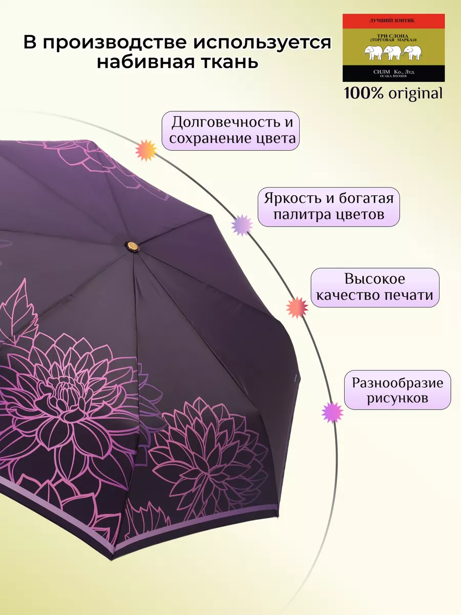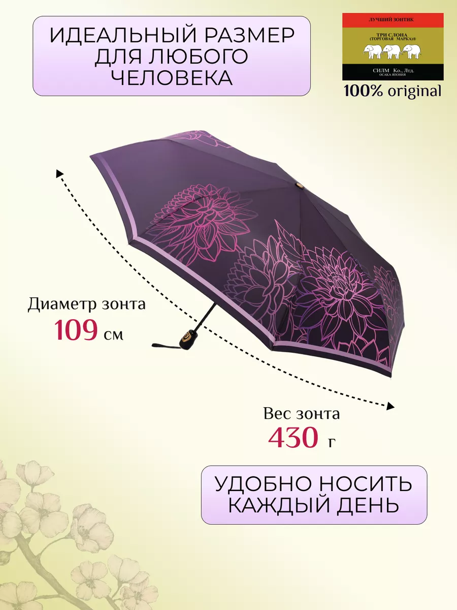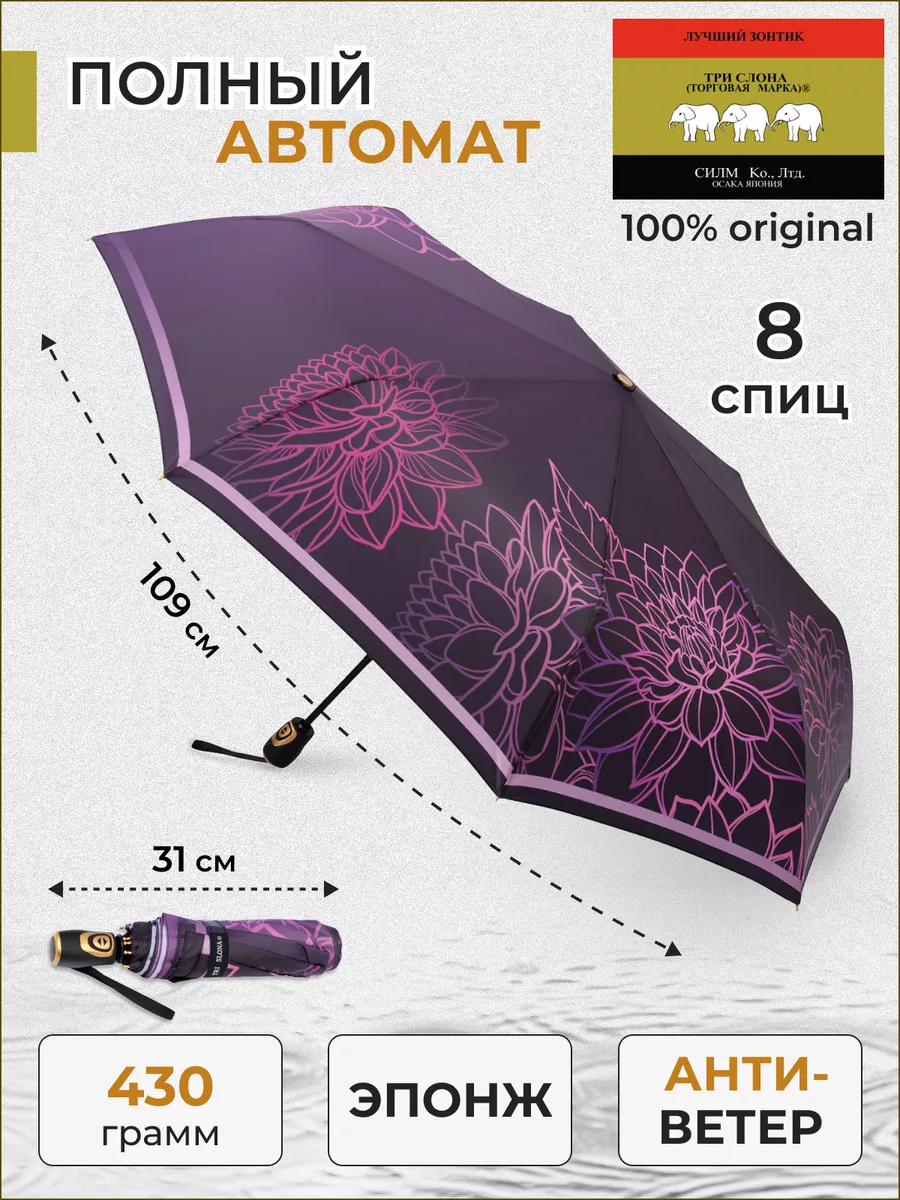Описание: Женский складной зонт от бренда Три Слона подойдет для защиты от дождя и солнца и станет отличным подарком для любимой, жены, мамы, дочки, учителя. Характеристики: полный автомат, 8 спиц, вес 430 г, 3 сложения, длина в сложенном виде 31 см, фактический диаметр купола 109 см (по низу от спицы до спицы), материал купола Эпонж (100% Полиэстер), материал ручки пластик (soft-touch), длина ручки 6 см, зонт закрывается на кнопку, чехол закрывается на кнопку. Каркас и спицы выполнены из стали, алюминия, фибергласса. В комплекте зонт и чехол. Во все наши зонты встроена система антиветер, при сильных порывах ветра зонт выворачивается, амортизируя спицы и защищая их от поломки. На зонты бренда Три Слона действует гарантия 6 месяцев, гарантия распространяется на производственный брак и не распространяется на механические повреждения, в том числе на поломку спиц в процессе эксплуатации. Несмотря на самые современные материалы и конструктивные решения, при очень сильных порывах ветра спицы могут сломаться, вечных вещей человечество еще не изобрело. Зонтик станет лучшим помощником в непогоду, в отпуске, на пляже, в поездке, на прогулке, в авто, в багажник или бардачок машины. Благодаря тефлоновой пропитке, зонт не только отталкивает воду, но и защищает от вредного воздействия ультрафиолета, от солнца, а значит его можно использовать как пляжный зонт. Вы сможете сделать действительно нужный подарок на день рождения, 8 марта, 23 февраля, 14 февраля, день влюбленных, новый год, день учителя, 1 сентября, день матери, благодаря фирменному подарочному пакету, который вы получите при покупке зонта. Три Слона-это знаменитый во всем мире и постсоветском пространстве бренд зонтов, качество которых проверено годами, он обеспечит долгую службу и станет незаменимым защитником от дождя. Мы являемся официальным представителем бренда Три Слона, у нас вы можете купить 100% оригинальную продукцию, которая имеет фирменные навесные и вшивные бирки, заводскую выштамповку на стержне, голографическую наклейку, что подтверждает безупречное качество. В нашем ассортименте представлено большое количество разнообразных и стильных зонтов на любой вкус.