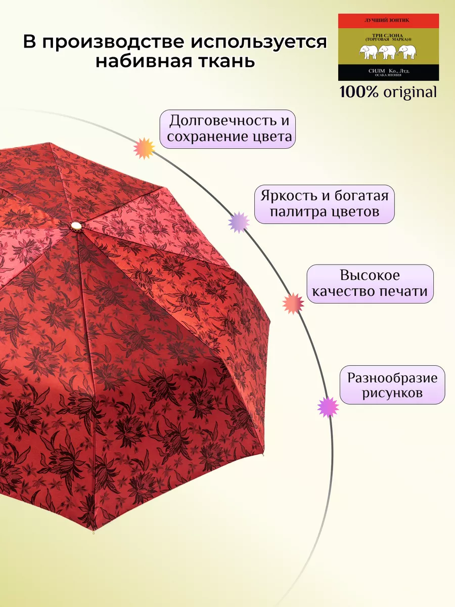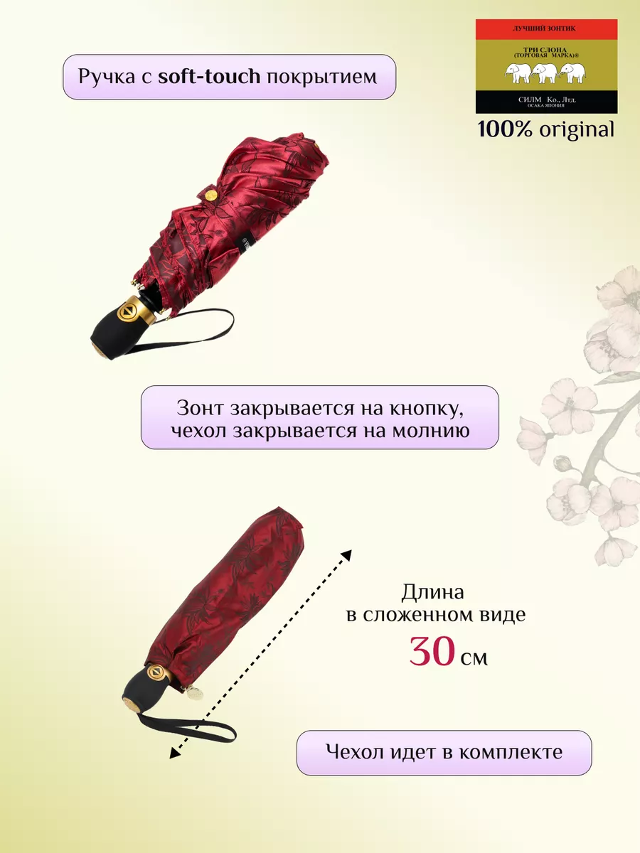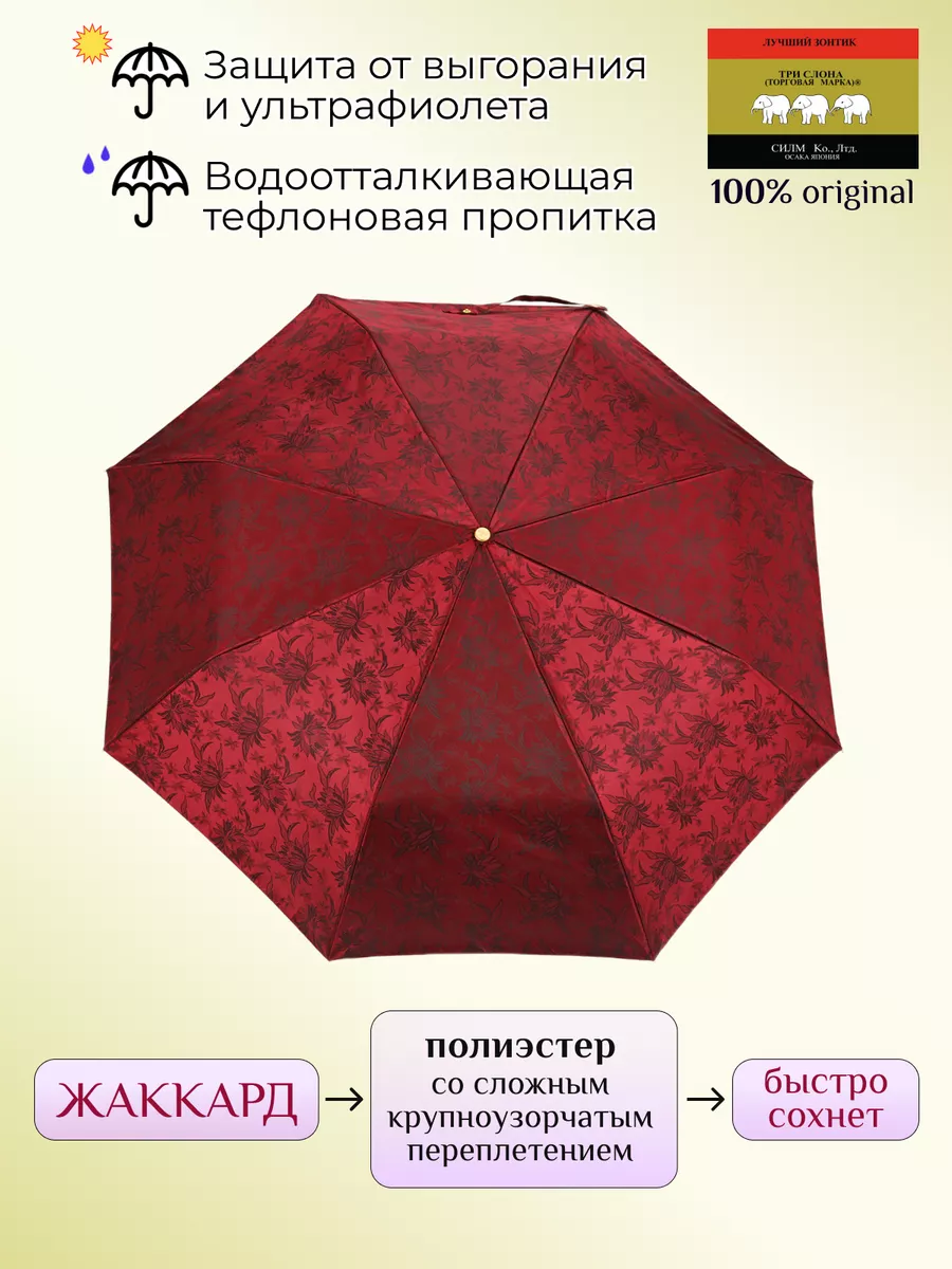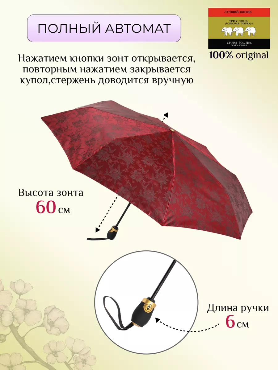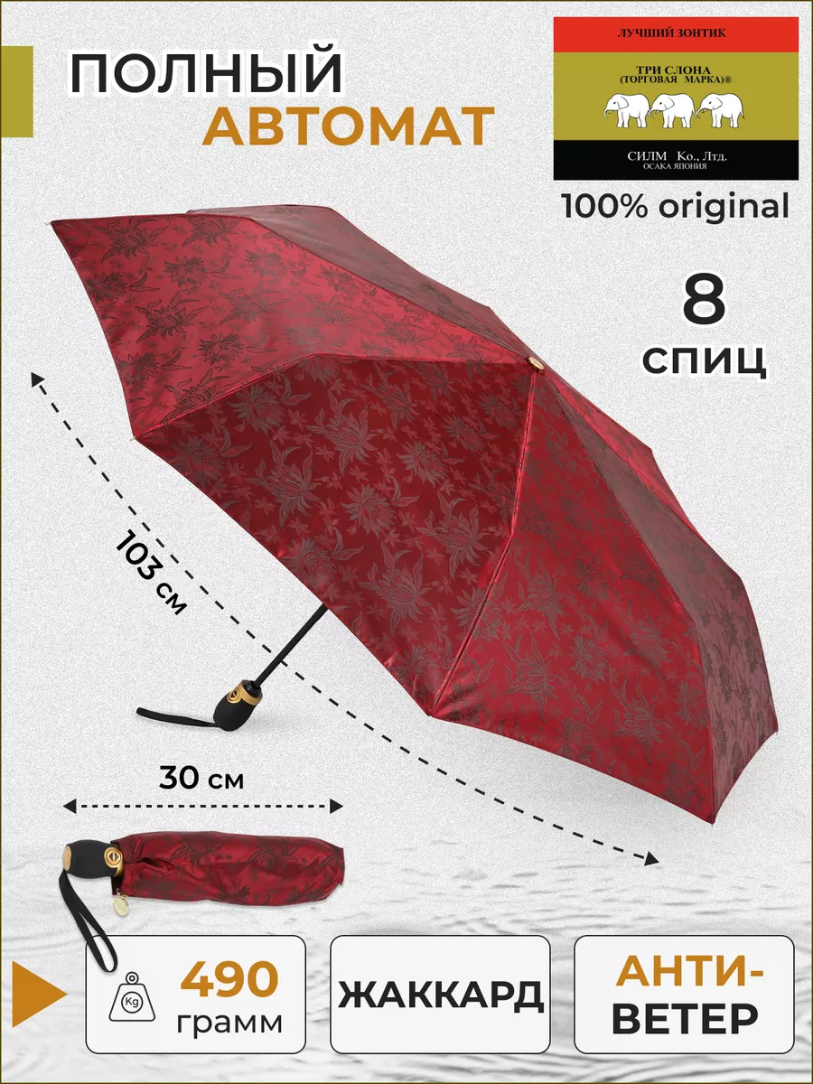 Описание: Женский складной зонт от бренда Три Слона подойдет для защиты от дождя и солнца и станет отличным подарком для любимой, жены, мамы, дочки, учителя. Характеристики: полный автомат, 8 спиц, вес 490 г, 3 сложения, длина в сложенном виде 30 см, фактический диаметр купола 103 см (по низу от спицы до спицы), материал купола Жаккард (100% Полиэстер), материал ручки пластик (soft-touch), длина ручки 6 см, зонт закрывается на кнопку, чехол закрывается на молнию. Каркас и спицы выполнены из стали, алюминия, фибергласса. В комплекте зонт и чехол. Во все наши зонты встроена система антиветер, при сильных порывах ветра зонт выворачивается, амортизируя спицы и защищая их от поломки. На зонты бренда Три Слона действует гарантия 6 месяцев, гарантия распространяется на производственный брак и не распространяется на механические повреждения, в том числе на поломку спиц в процессе эксплуатации. Несмотря на самые современные материалы и конструктивные решения, при очень сильных порывах ветра спицы могут сломаться, вечных вещей человечество еще не изобрело. Зонтик станет лучшим помощником в непогоду, в отпуске, на пляже, в поездке, на прогулке, в авто, в багажник или бардачок машины. Благодаря тефлоновой пропитке, зонт не только отталкивает воду, но и защищает от вредного воздействия ультрафиолета, от солнца, а значит его можно использовать как пляжный зонт. Вы сможете сделать действительно нужный подарок на день рождения, 8 марта, 23 февраля, 14 февраля, день влюбленных, новый год, день учителя, 1 сентября, день матери, благодаря фирменному подарочному пакету, который вы получите при покупке зонта. Три Слона-это знаменитый во всем мире и постсоветском пространстве бренд зонтов, качество которых проверено годами, он обеспечит долгую службу и станет незаменимым защитником от дождя. Мы являемся официальным представителем бренда Три Слона, у нас вы можете купить 100% оригинальную продукцию, которая имеет фирменные навесные и вшивные бирки, заводскую выштамповку на стержне, голографическую наклейку, что подтверждает безупречное качество. В нашем ассортименте представлено большое количество разнообразных и стильных зонтов на любой вкус.