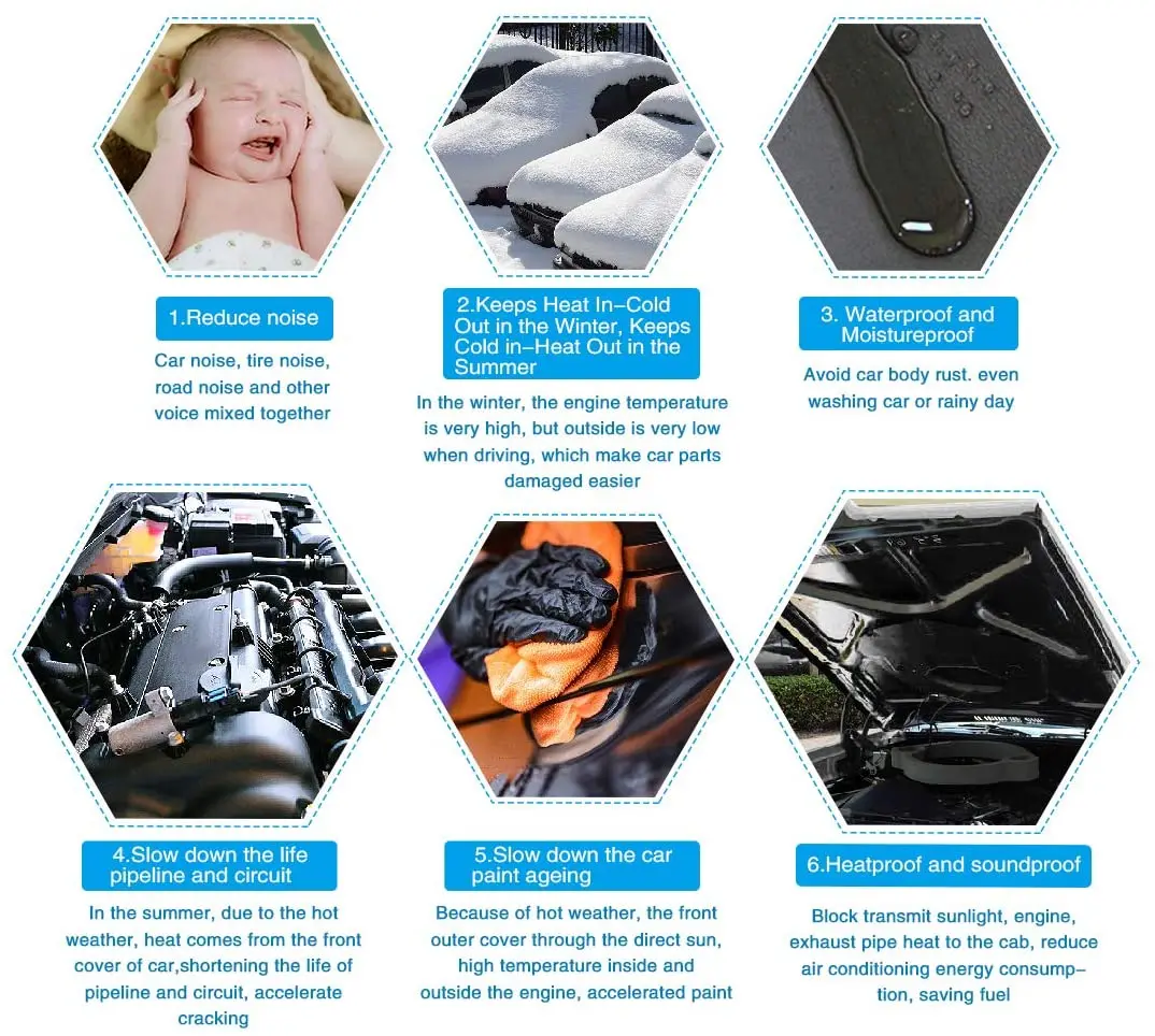 【Усиленная защита 】 1. Замедлить срок службы трубопроводов и цепей. Летом жарко, может помочь передней крышке автомобиля рассеивать тепло, продлить срок службы труб и цепей и не ускорить трещины. 2. Замедляет выдерживание краски на автомобиле. Прямые солнечные лучи в передней части внешнего корпуса, высокая температура внутри и снаружи двигателя, ускоряет старение краски. Защищает краску от старения.