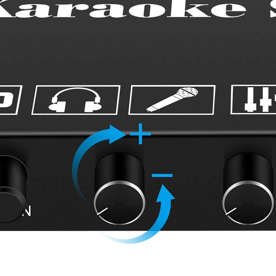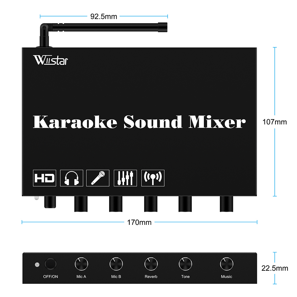 Этот звуковой микшер для караоке с разъемами HDM1/3,5 мм/Spdif упрощает подключение к различным устройствам, включая ТВ-бокс, smartTV, системы домашнего кинотеатра, приемники, динамики, звуковые панели, усилители, ноутбуки, таблетки, и многое другое. Который оснащен поворотными регуляторами регулировки, он может позволить вам легко настроить реверберацию, тон, громкость микрофона до желаемого уровня.