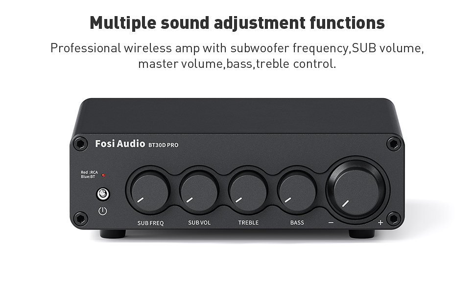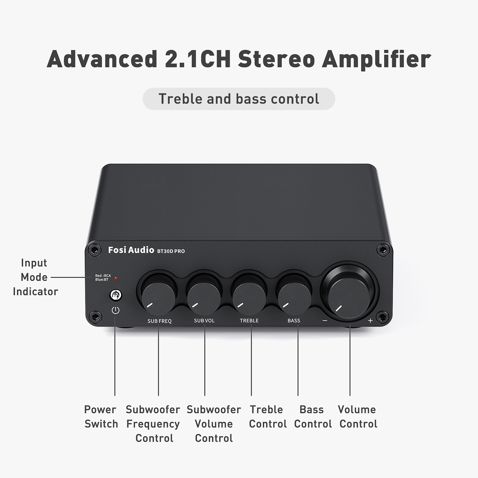 • Fosi Audio BT30D Pro-это обновленная версия BT30D. Все-НОВЫЙ черный алюминиевый внешний вид. BT30D VS BT30D Pro: Максимальная выходная мощность: 50 Вт x2 + 100 Вт VS 165 Вт x2 + 350 Вт, чип усилителя: TPA3116D2 VS TPA3255. Выход: выход RCA для мощных сабвуферов VS Полнодиапазонный выход 3,5 мм для мощных сабвуферов и динамиков. Просто выберите одну модель для ваших нужд.