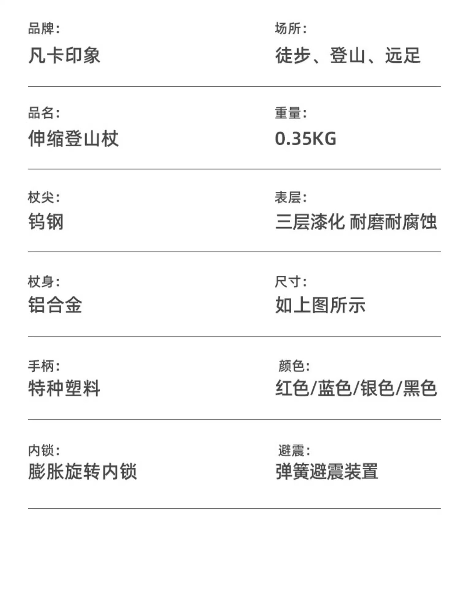 顏色分類 關於登山杖的小知識 四節伸縮50-110CM【彈簧減震】直柄紅色 四節伸縮50-110CM【彈簧減震】直柄黑色 四節伸縮50-110CM【彈簧減震】直柄藍色 四節伸縮50-110CM【彈簧減震】T柄紅色 四節伸縮50-110CM【彈簧減震】T柄黑色 四節伸縮50-110CM【彈簧減震】T柄藍色 三節伸縮65-135CM【彈簧減震】直柄紅色 三節伸縮65-135CM【彈簧減震】直柄黑色 三節伸縮65-135CM【彈簧減震】直柄藍色 三節伸縮65-135CM【彈簧減震】T柄紅色 三節伸縮65-135CM【彈簧減震】T柄黑色 三節伸縮65-135CM【彈簧減震】T柄藍色