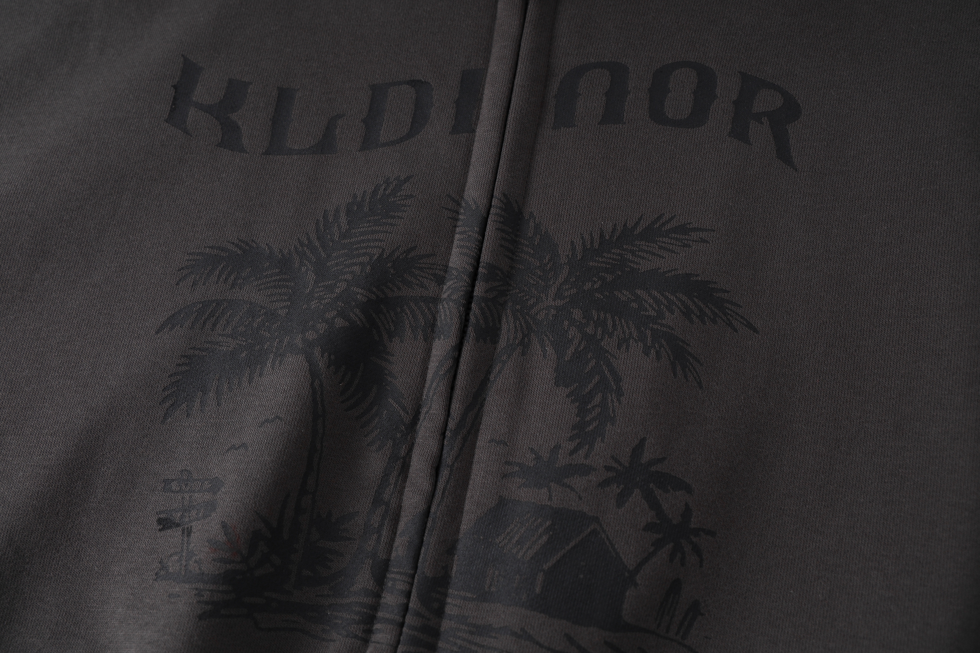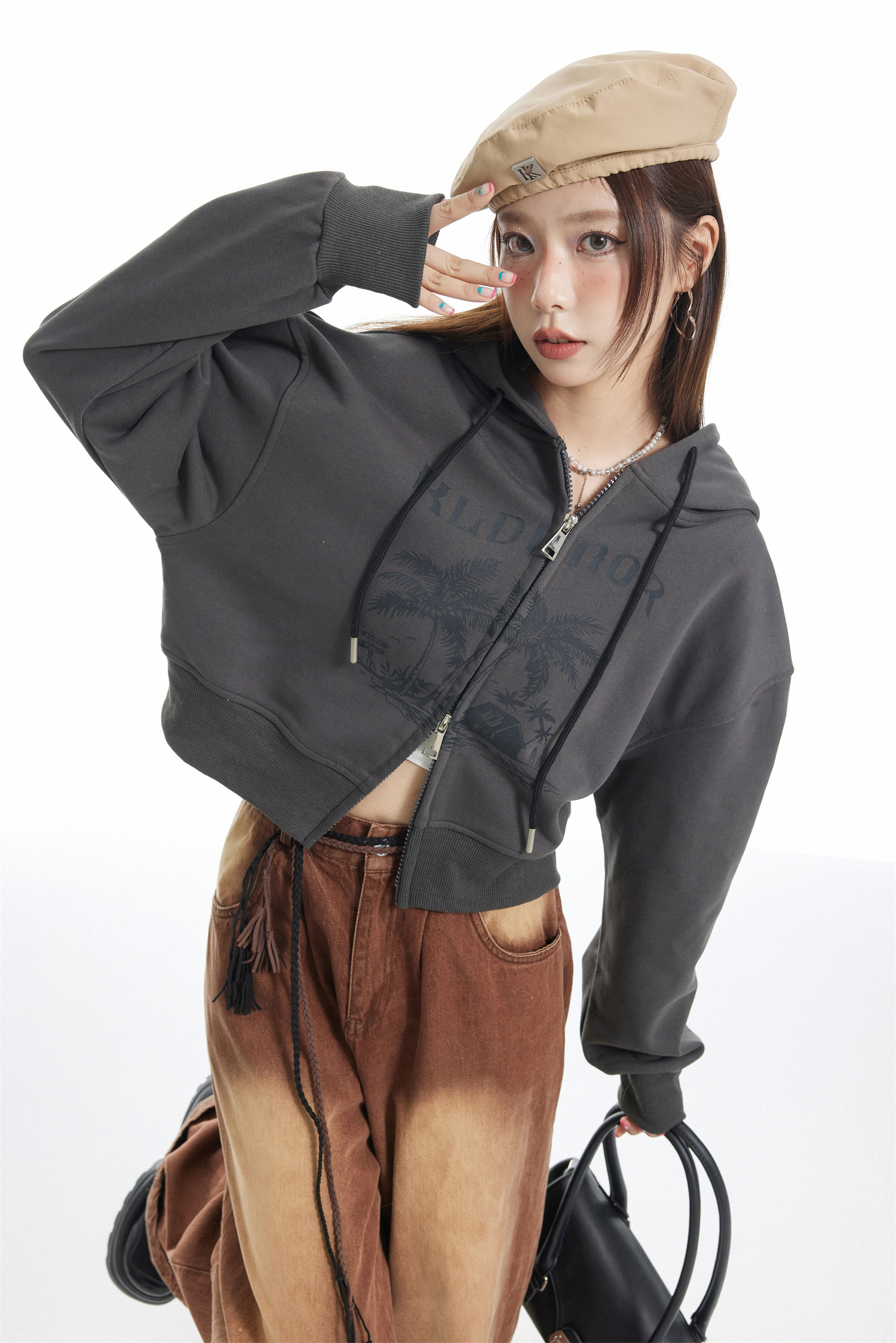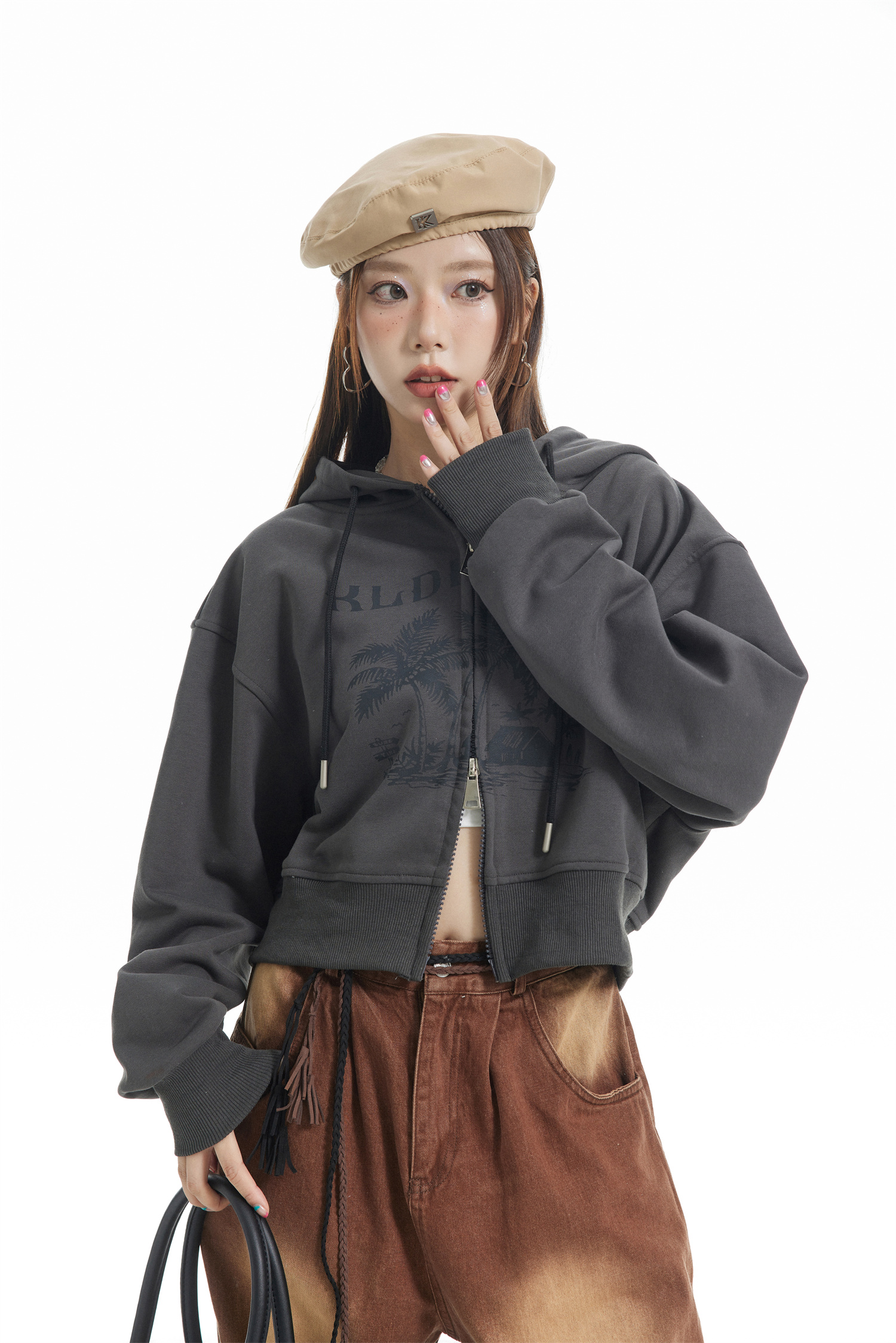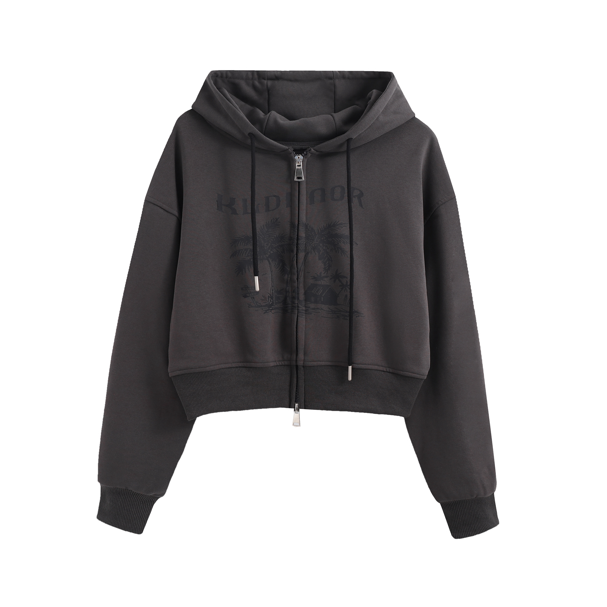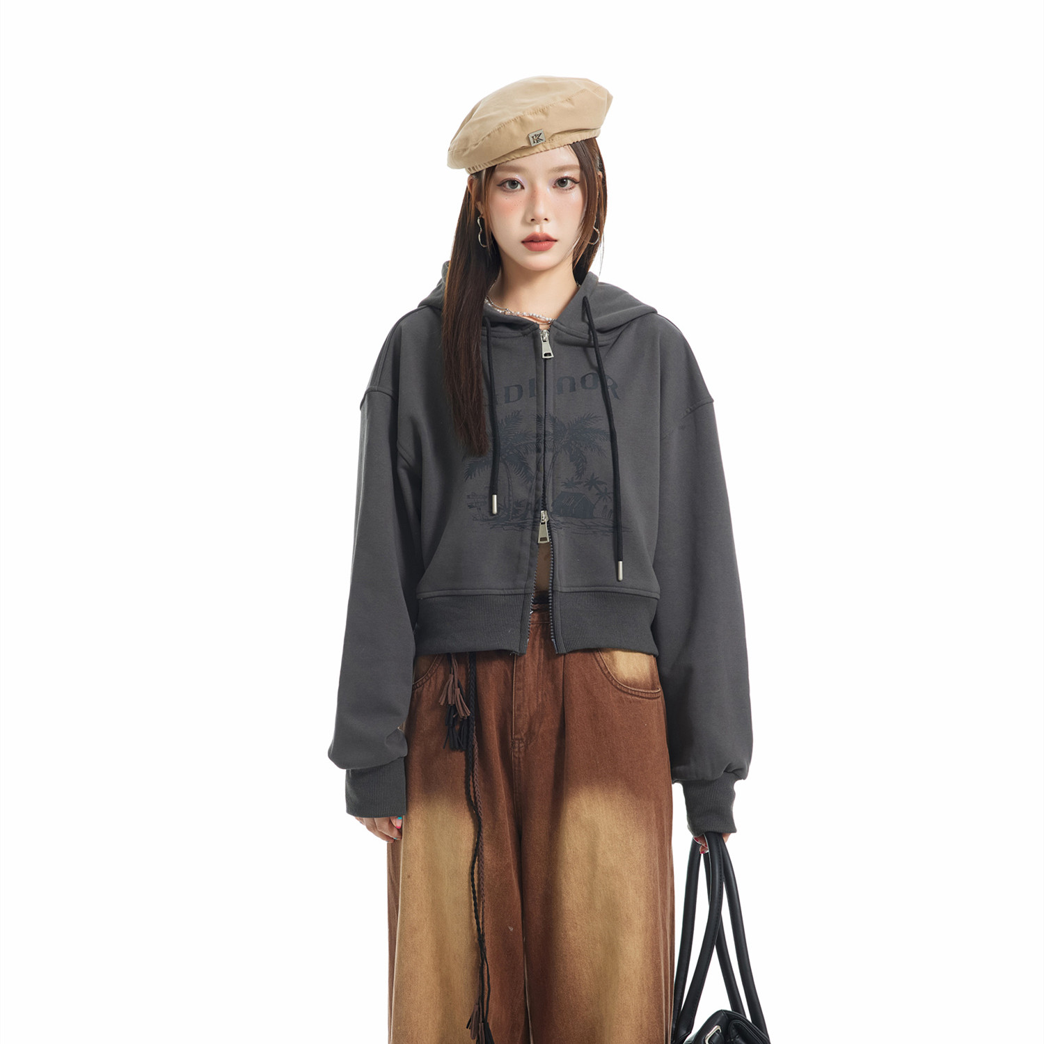 KLDINOR 潮牌美式復古辣妹風椰樹灰色短版拉鍊開衫帽衫衛衣外套秋