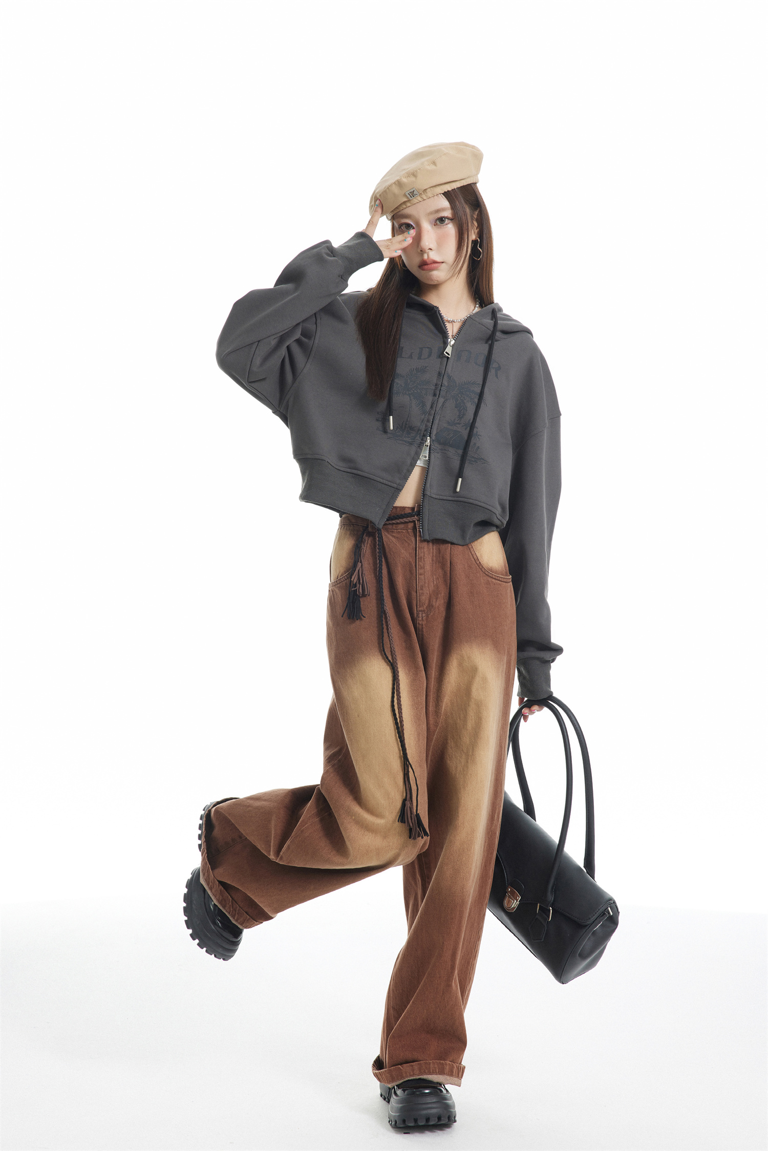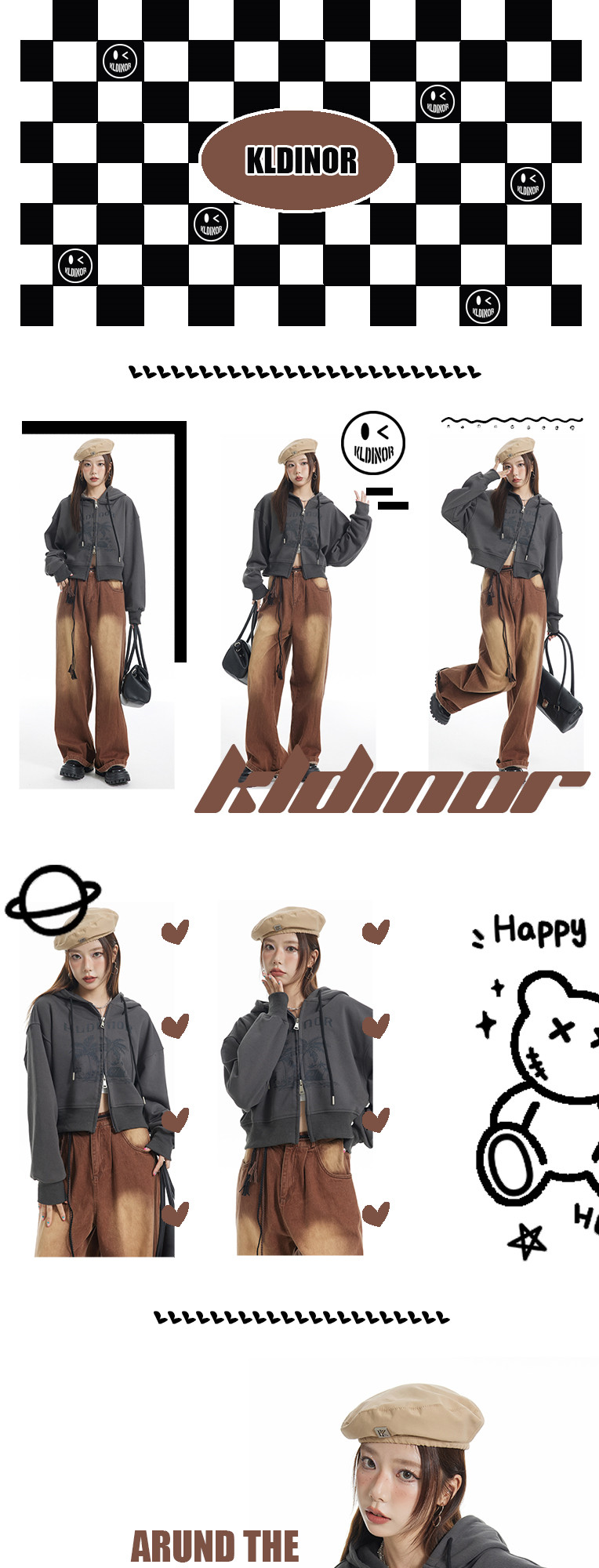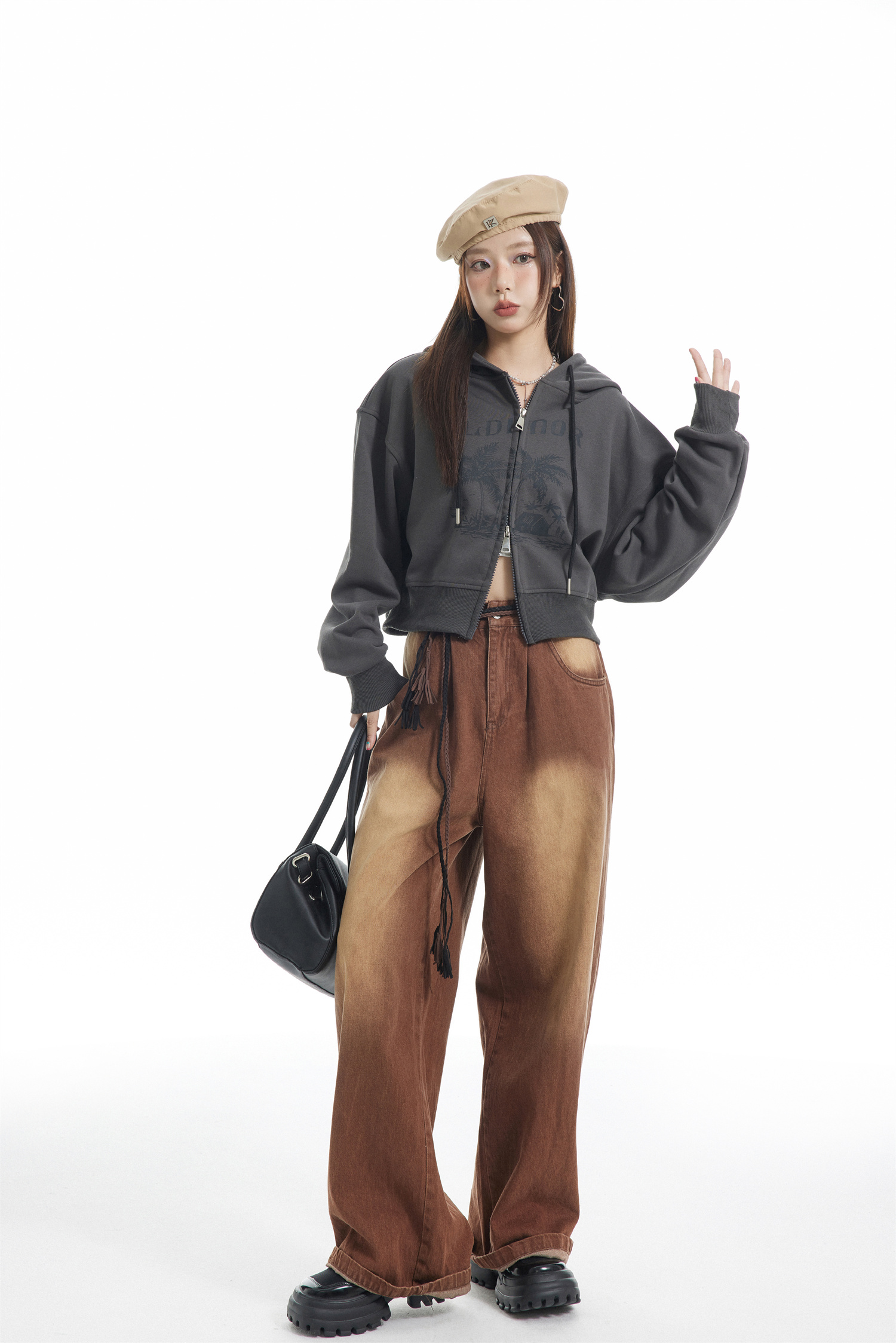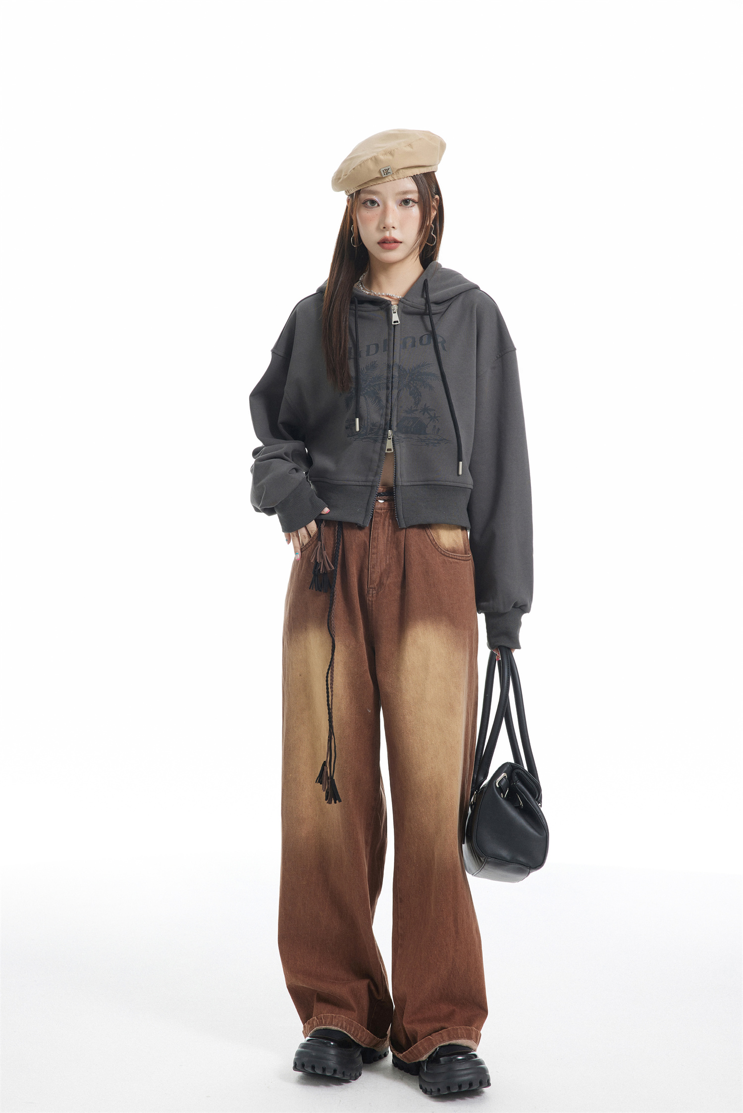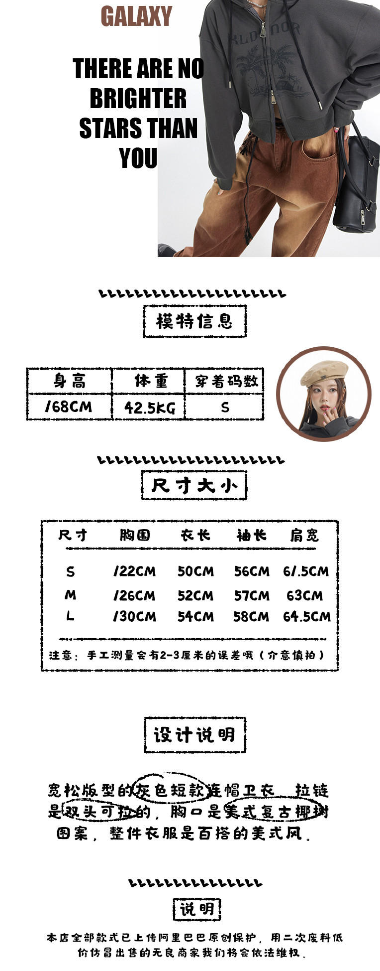 KLDINOR 潮牌美式復古辣妹風椰樹灰色短版拉鍊開衫帽衫衛衣外套秋