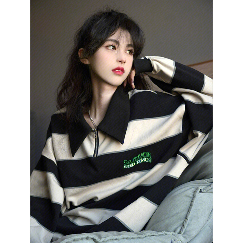 美式復古polo領衛衣女秋季寬鬆長袖拉鍊外套情侶小眾黑白條紋上衣