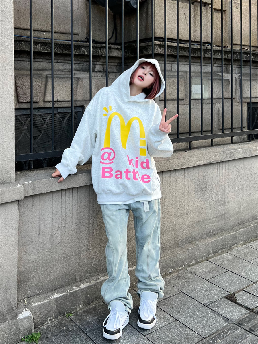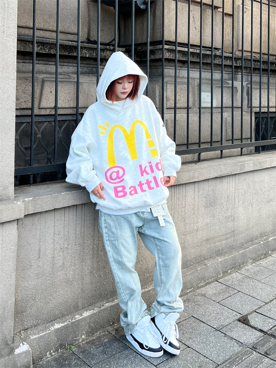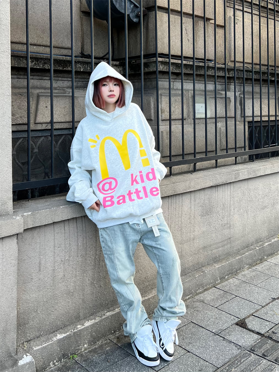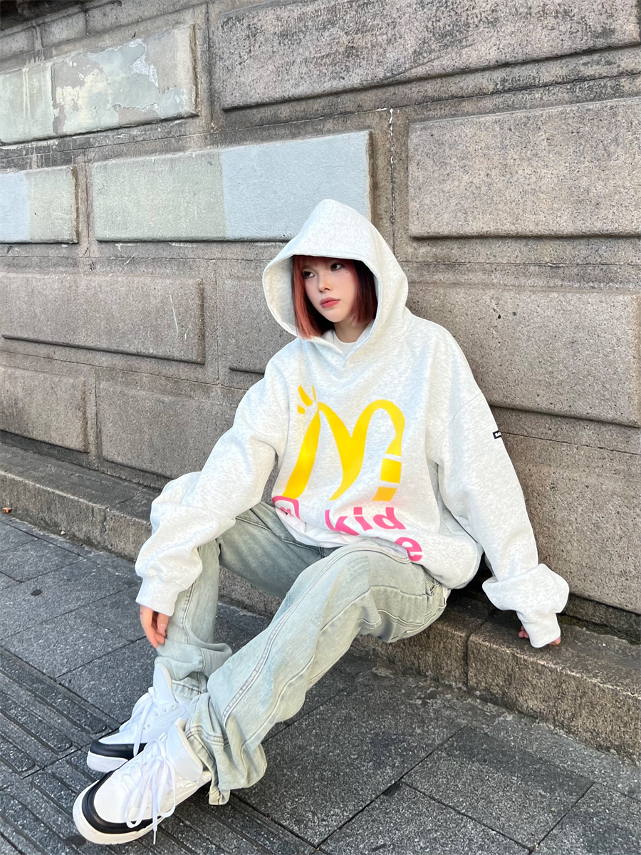 JU403 國潮美式趣味字母印花連帽運動衫秋季寬鬆休閒套頭帽衫男女潮