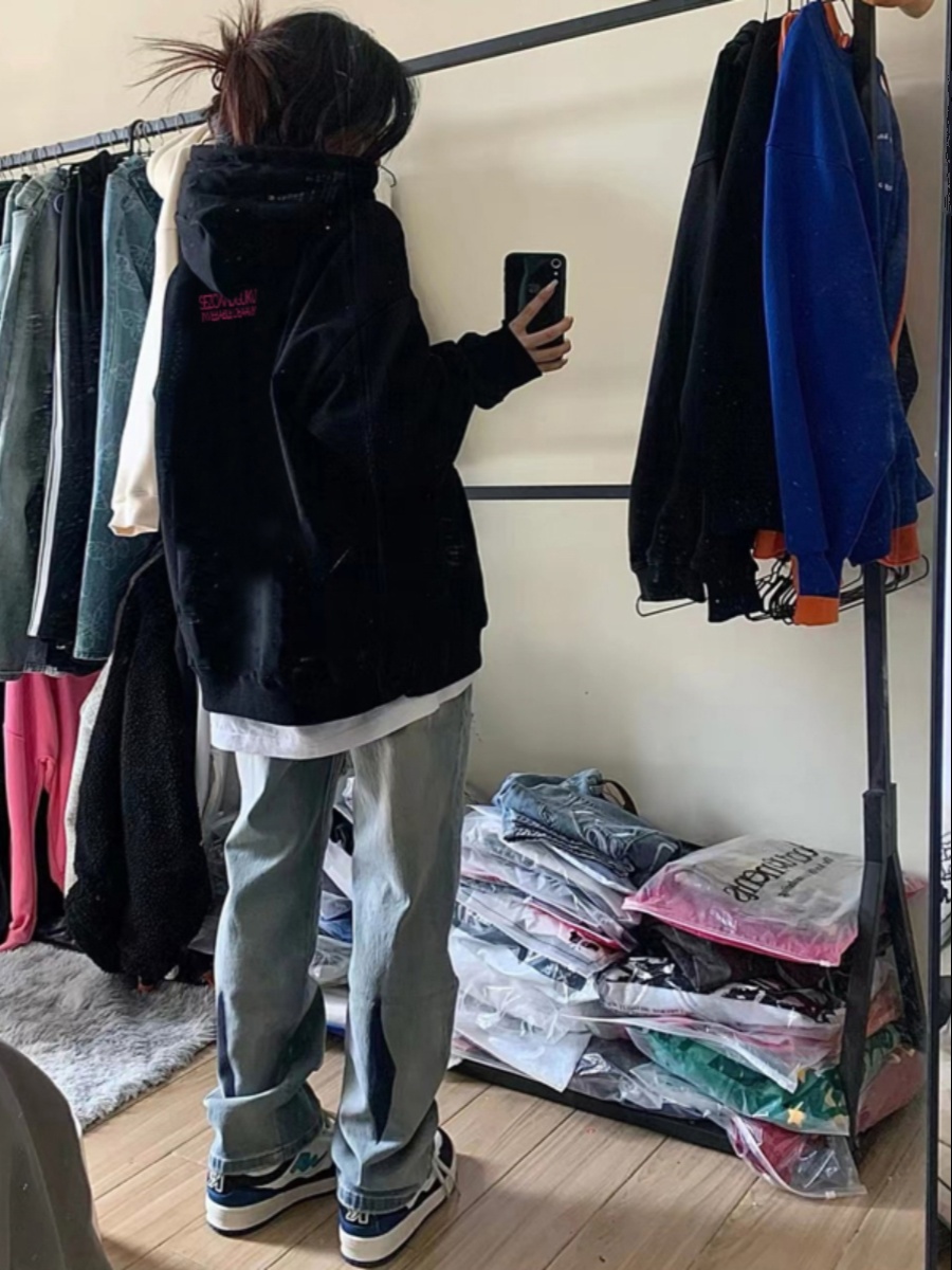 美拉德穿搭秋冬美式重磅黑色連帽運動衫女2023新款潮牌原創簡約外套
