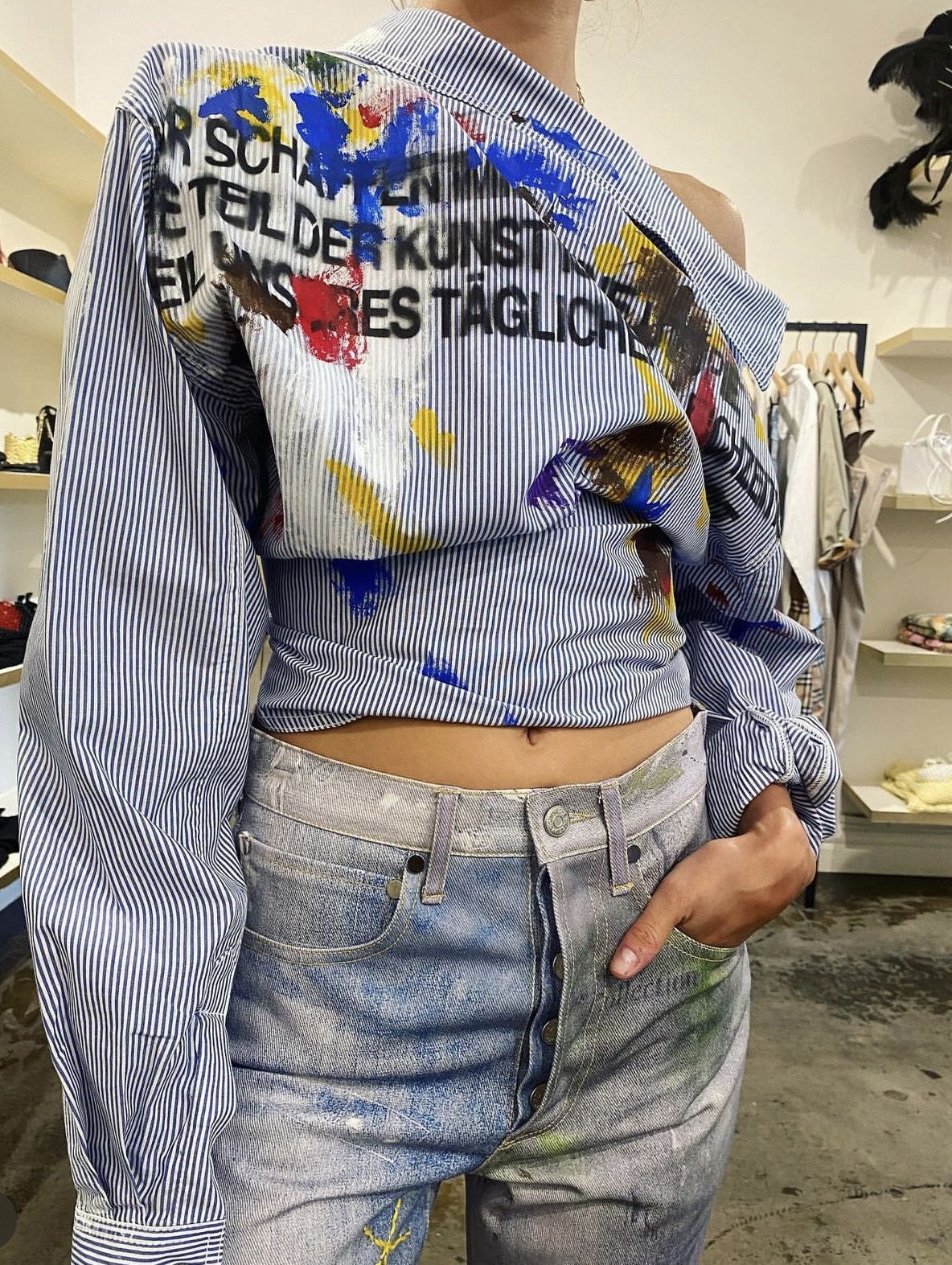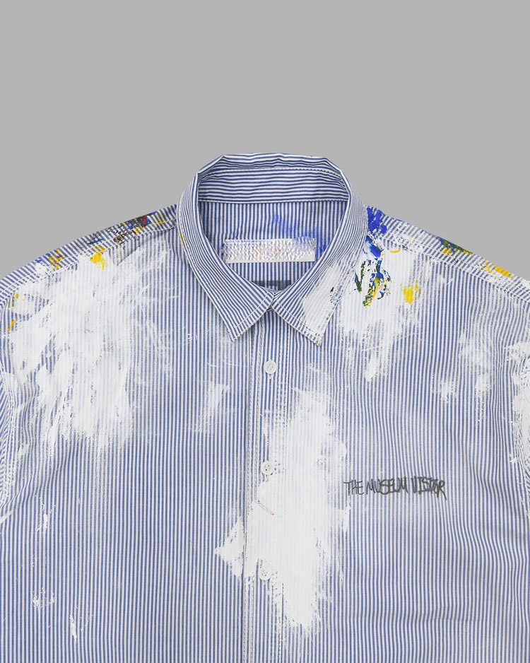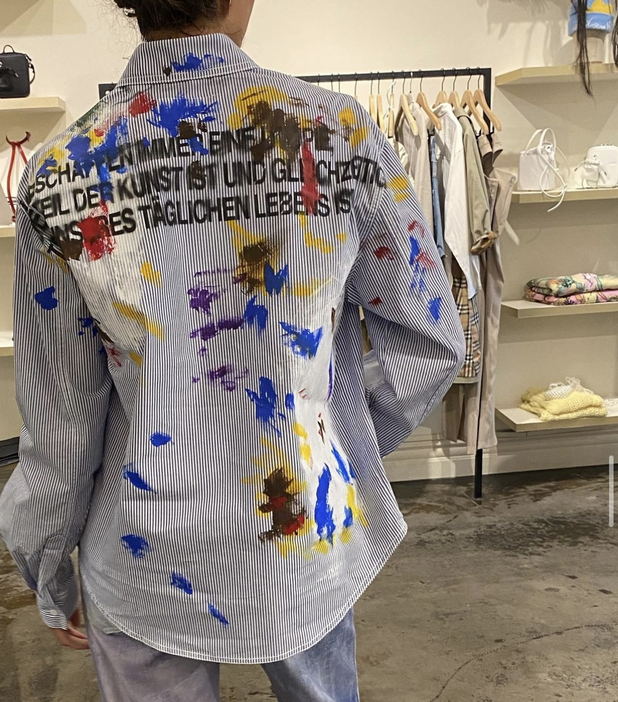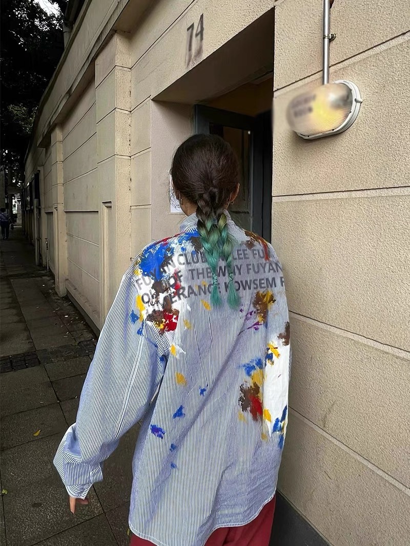 Unique SEI 簡約韓版男女同款寬鬆個性休閒做舊塗鴉彩長袖繪襯衫