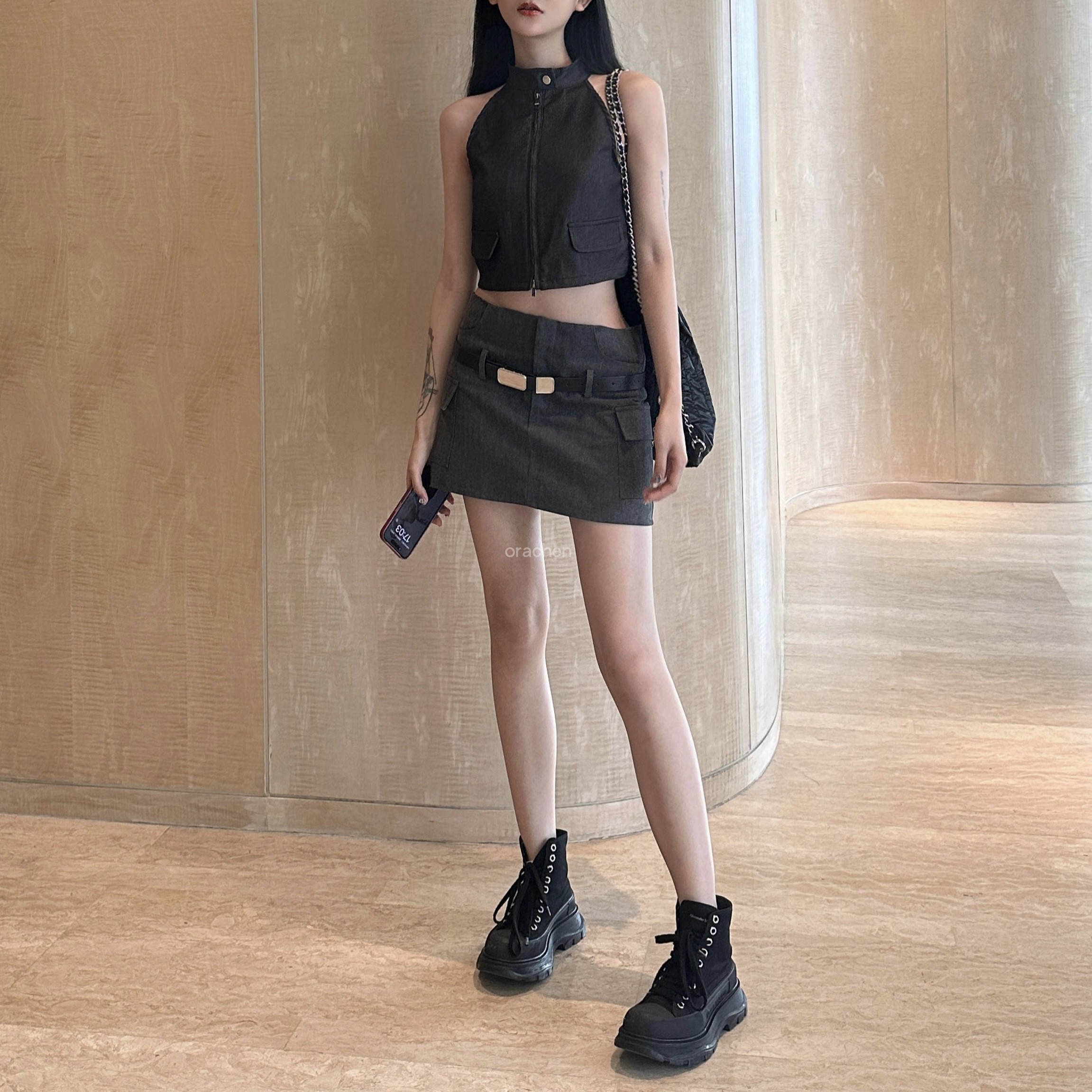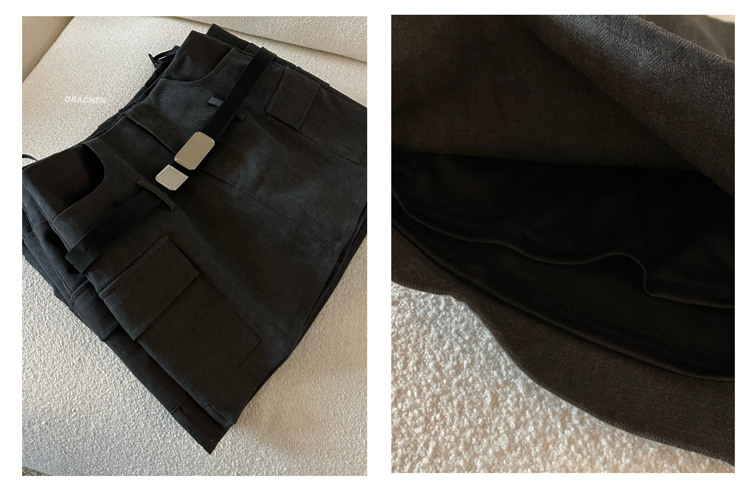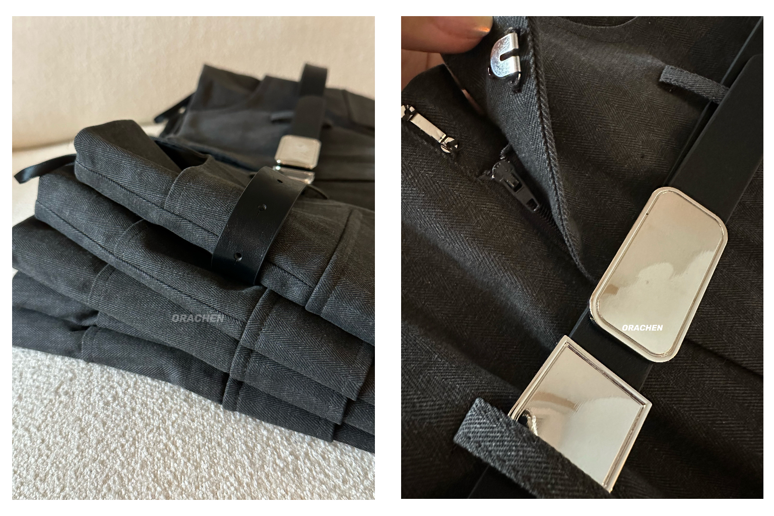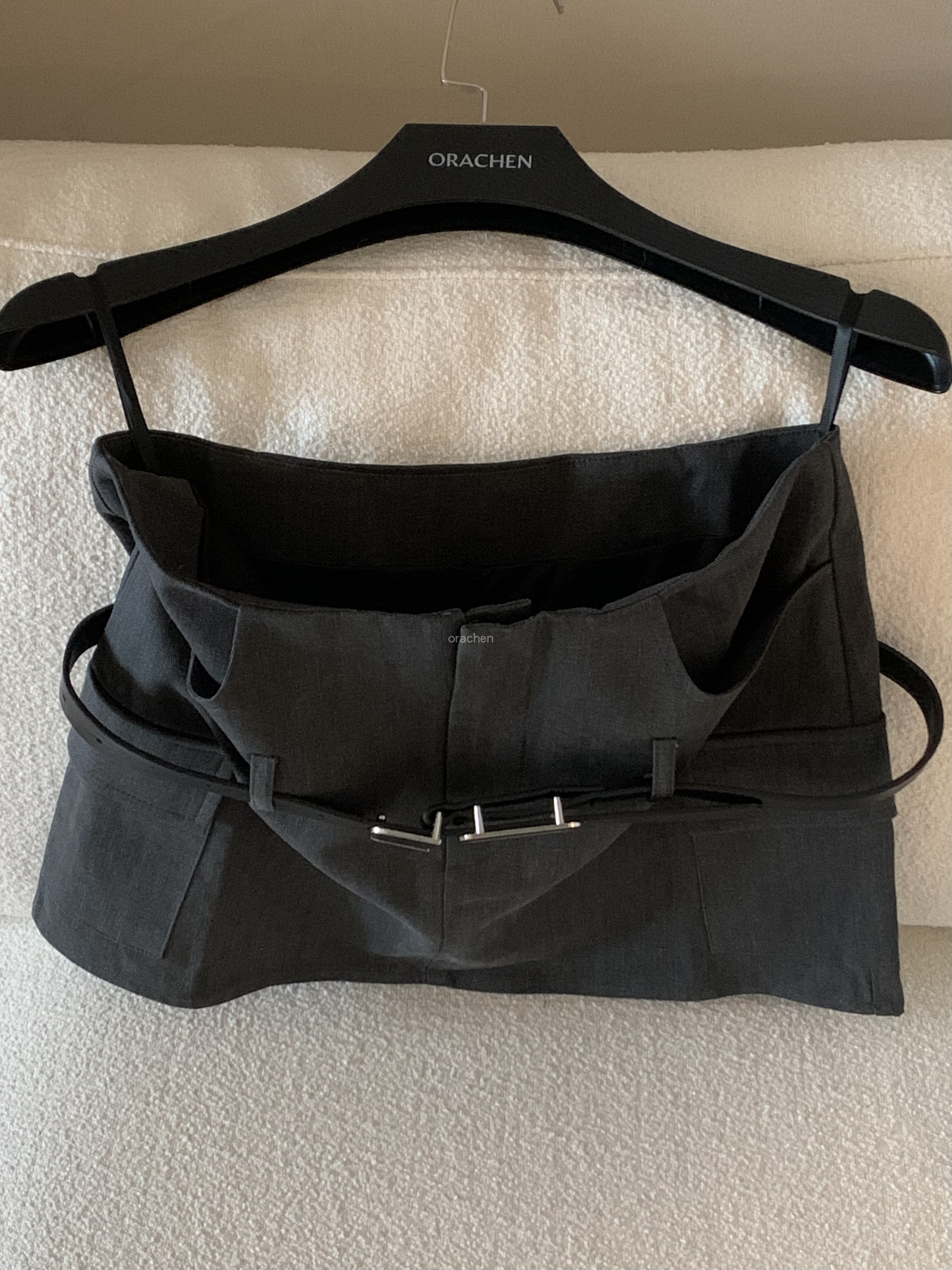 ORACHEN | chao顯瘦 深灰色質感人字紋水洗半身褲裙(帶腰帶 )