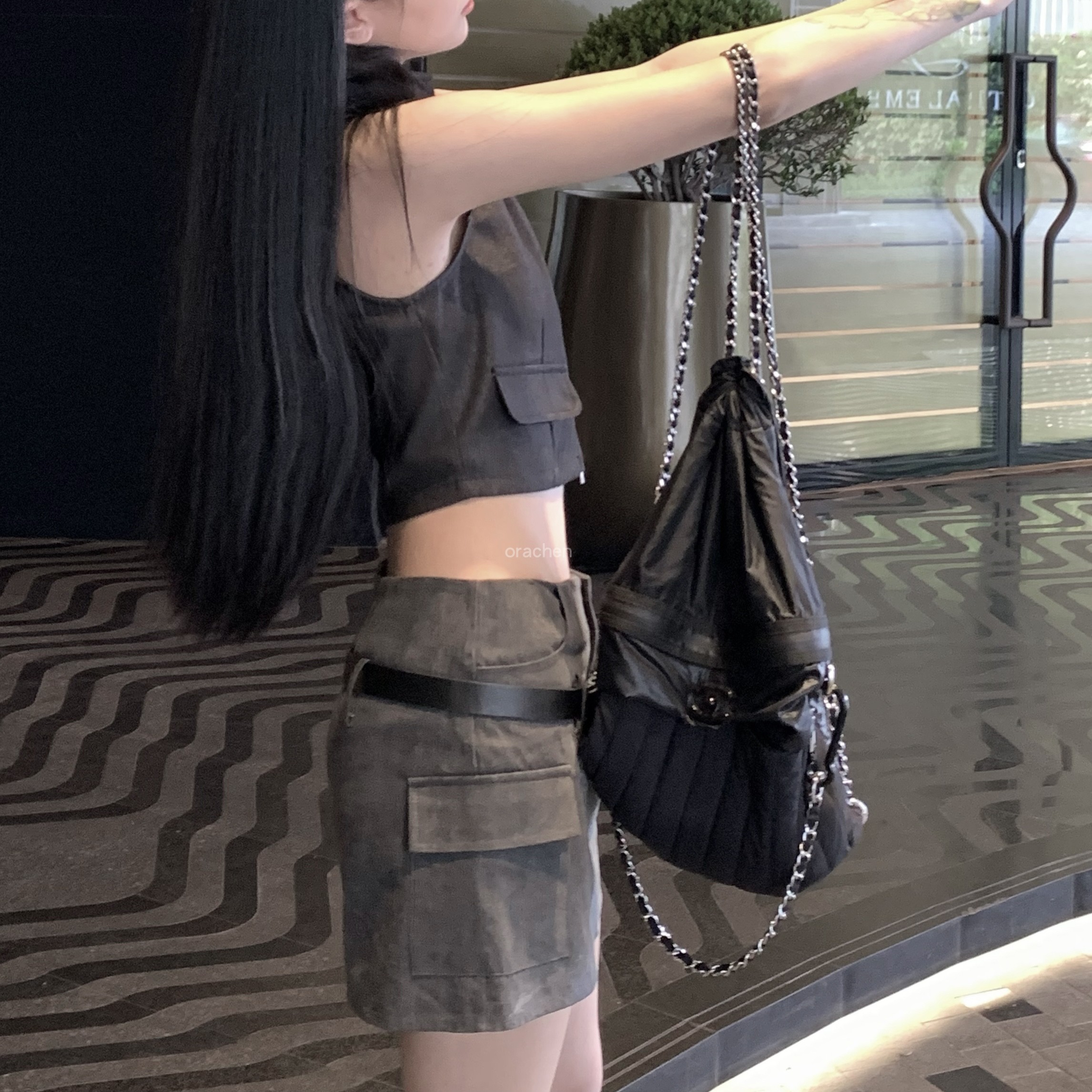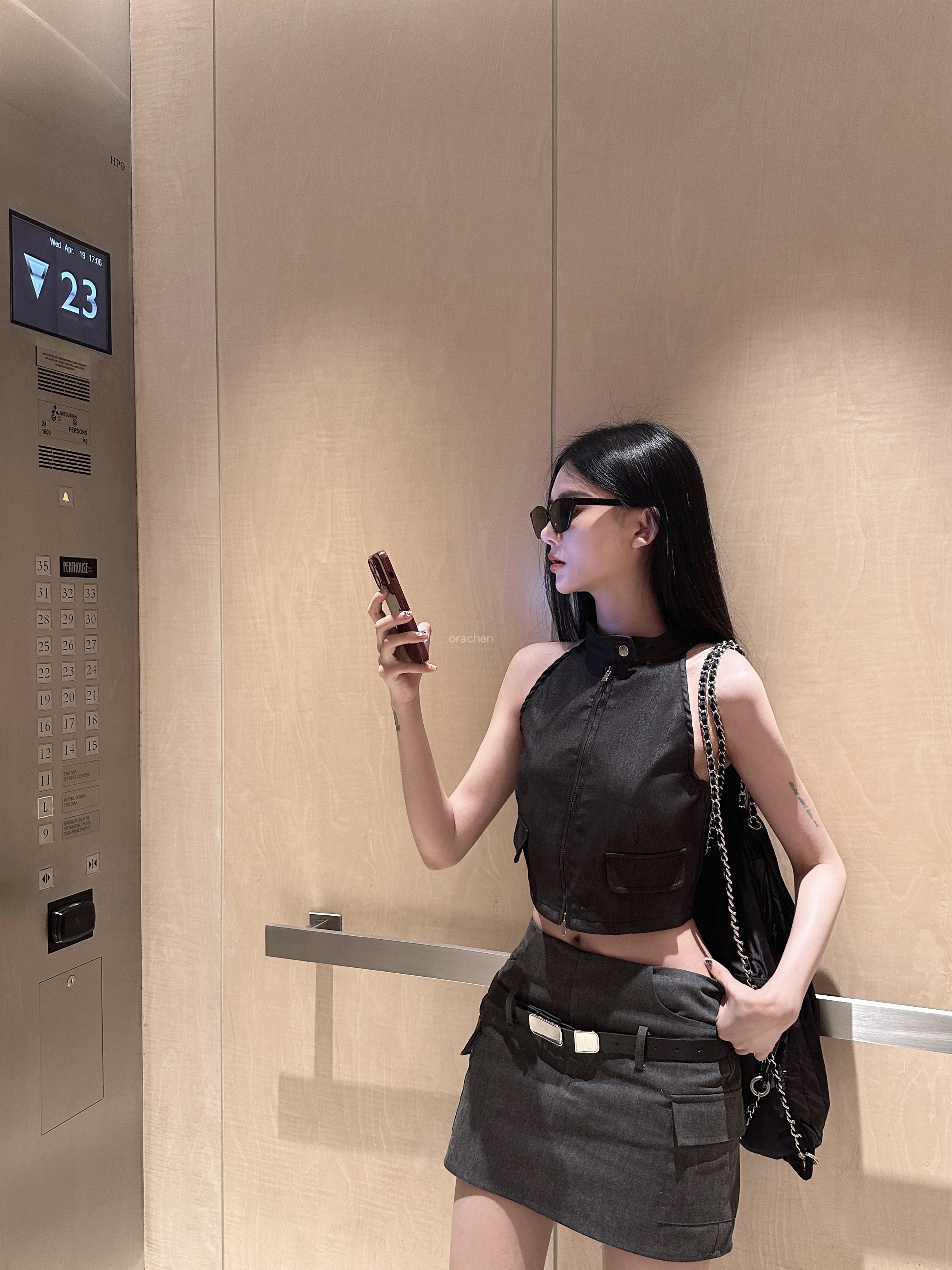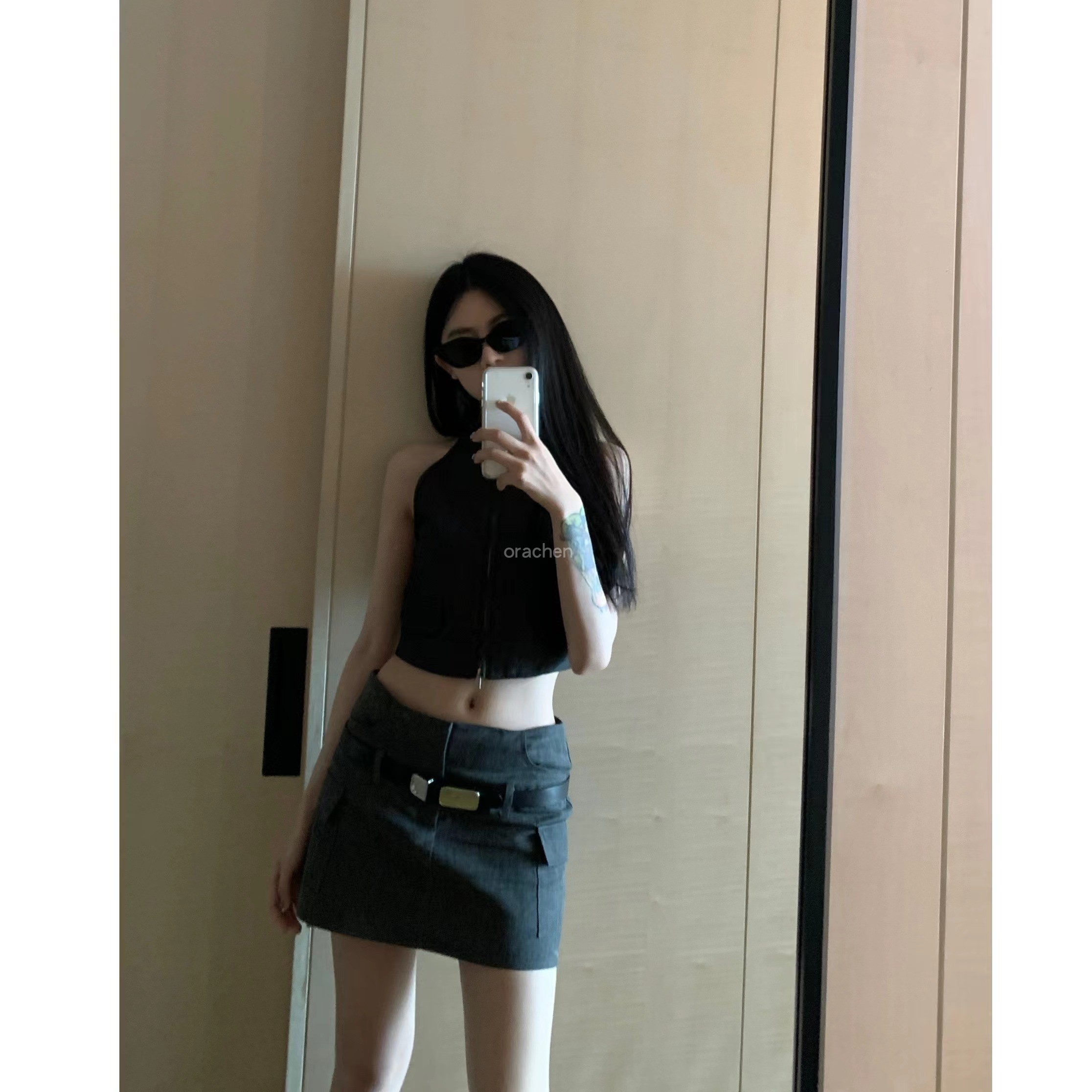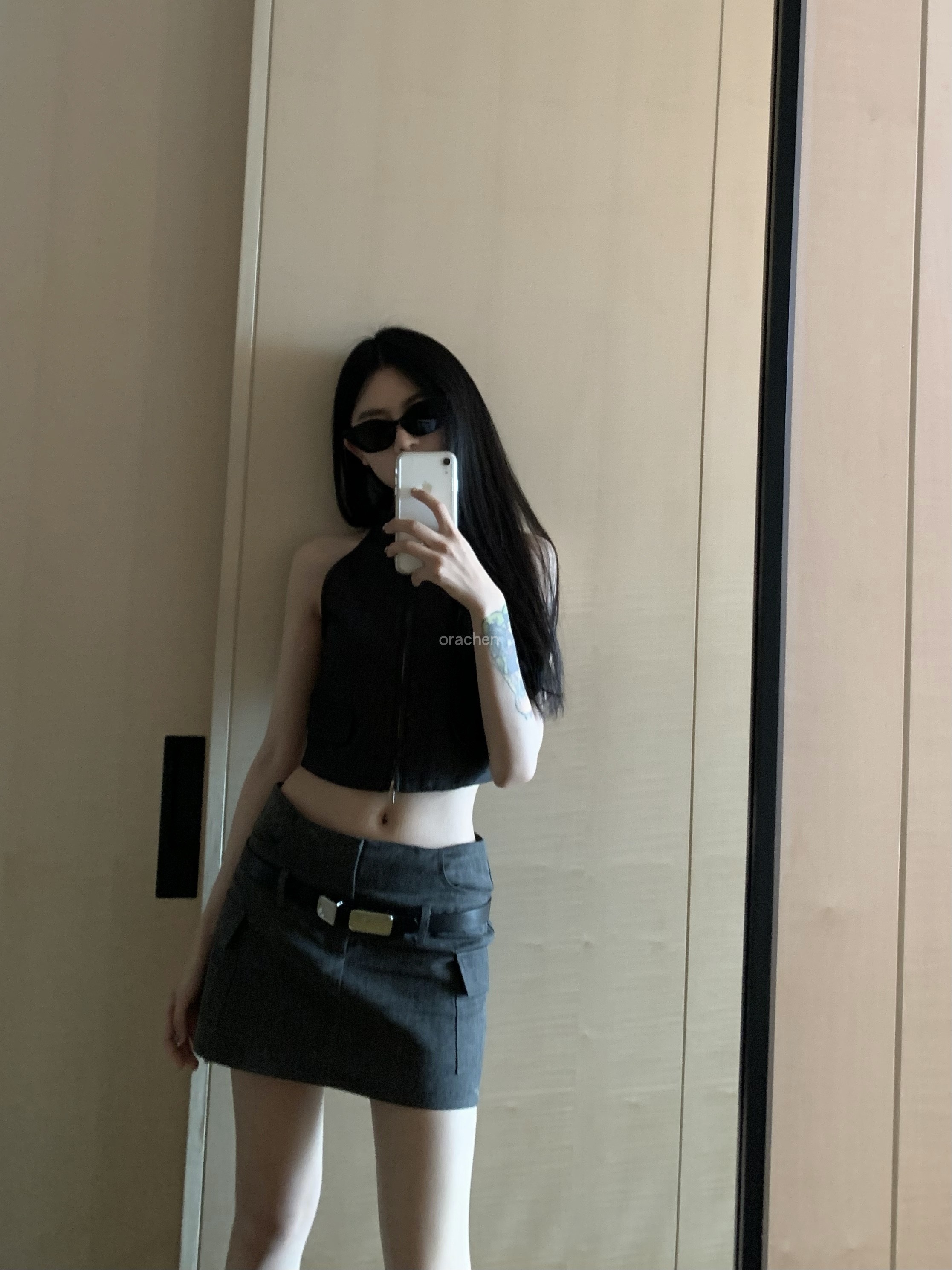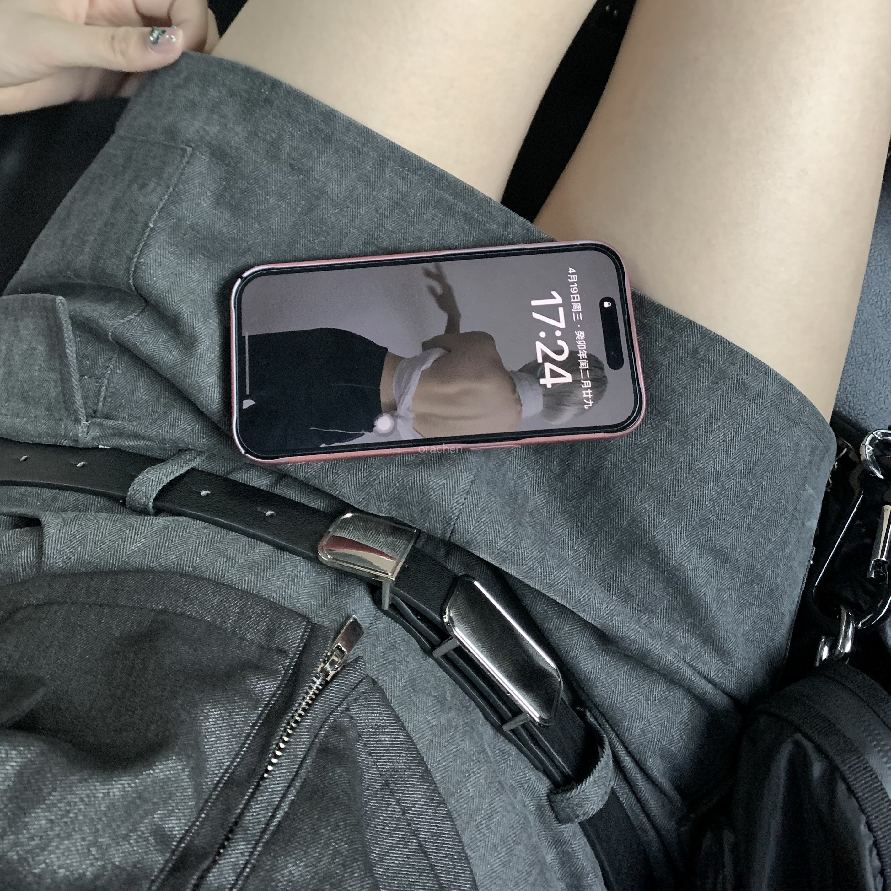 ORACHEN | chao顯瘦 深灰色質感人字紋水洗半身褲裙(帶腰帶 )