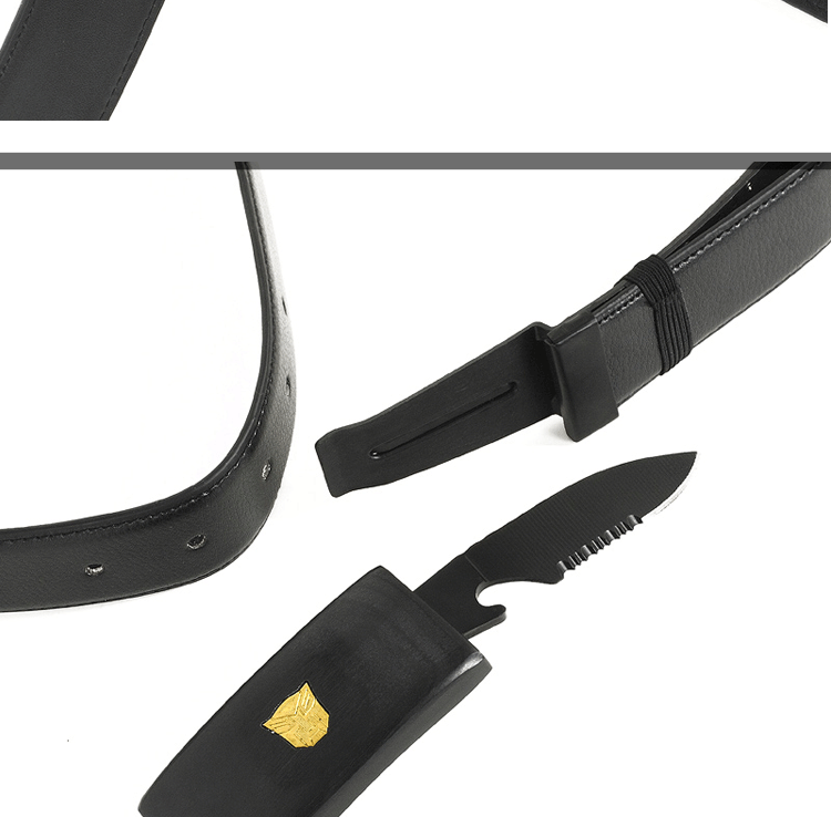 此皮带刀是防卫救生刀与日用皮带的结合品。皮带头同时也是小刀的刀柄,刀刃由不锈钢制作,半齿开刃,可以在任何需要的情况下快速割断绳索和安全带;皮带采用二层牛皮制成,经久耐用,大方得体。