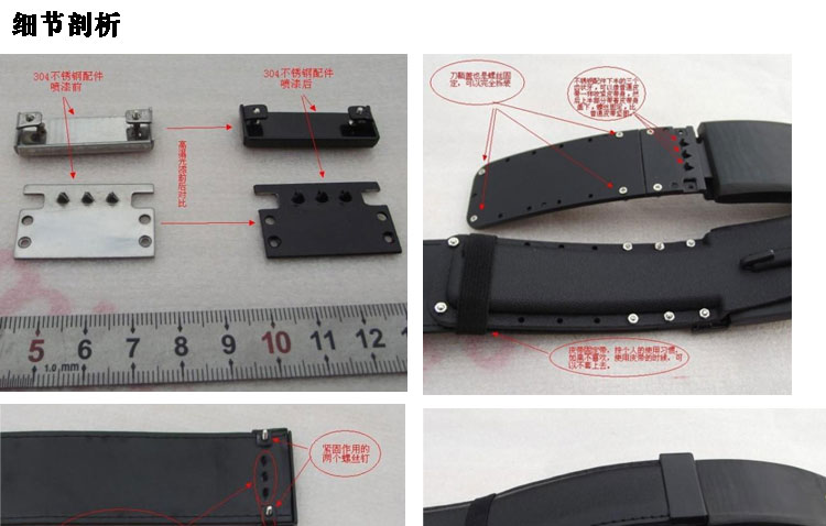 此皮带刀是防卫救生刀与日用皮带的完结合品。皮带头同时也是小刀的刀柄,采用塑料精抛而成,;刀刃由不锈钢制作,半齿开刃,可以在任何需要的情况下快速割断绳索和安全带;皮带采用二层牛皮制成,经久耐用,大方得体。小刀可以在不需松皮带的情况下快速抽出,以便应急使用。同时皮带也可当甩鞭使用,具有远近的攻击和防卫效果。升级版瑞士军刀皮带刀与旧版腰带刀的差别: