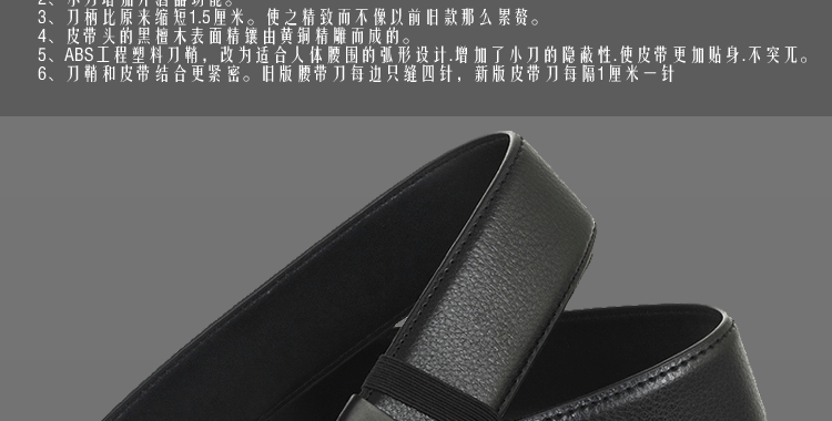 1、腰带由原来的尼龙带改用真皮皮带,美观大方,更广泛地满足顾客穿着各款裤子的搭配。