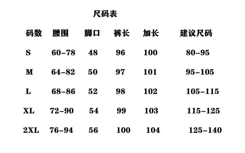 尺码 S80-95,M95-105,L105-115,XL115-125,2XL125-140
