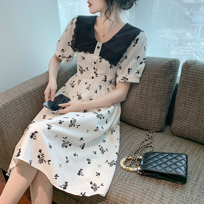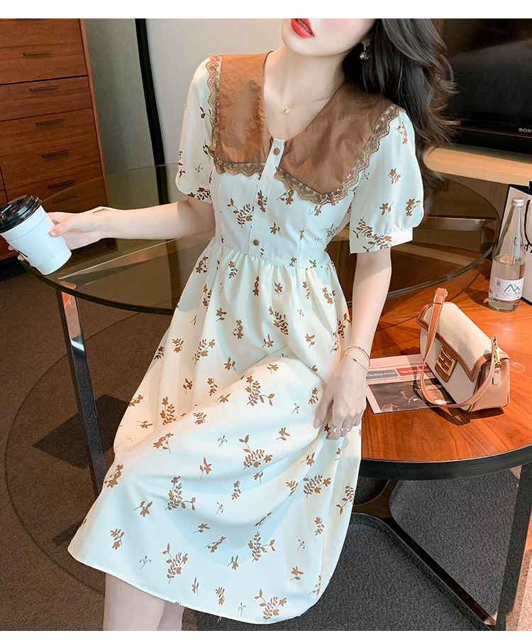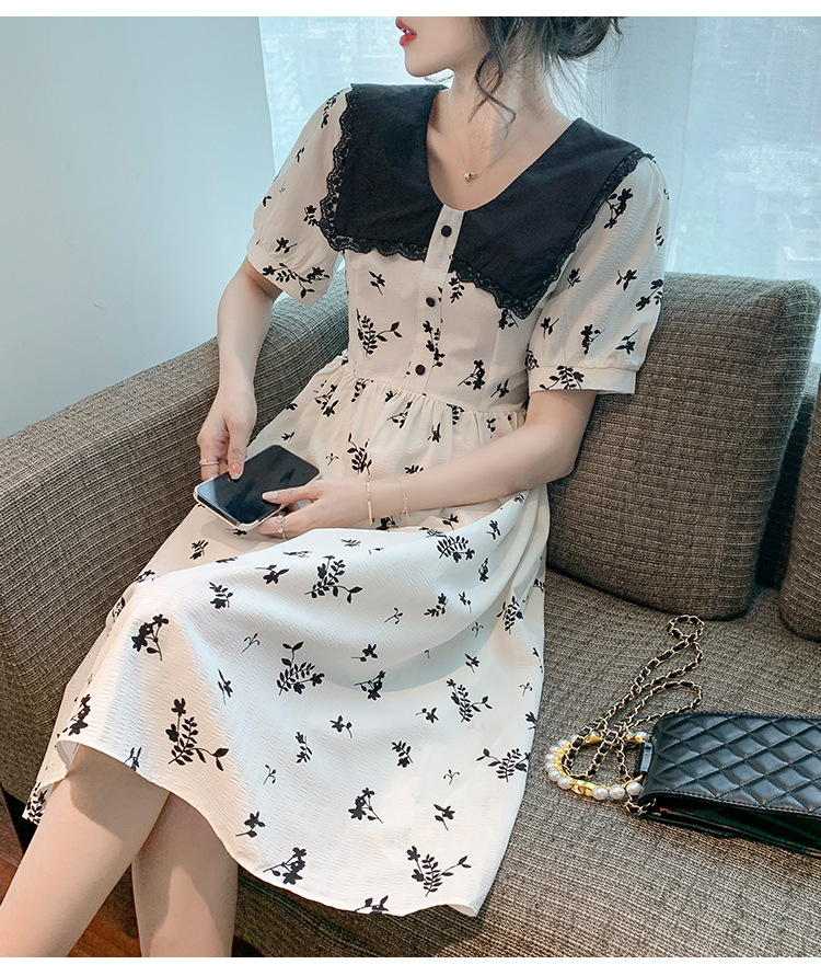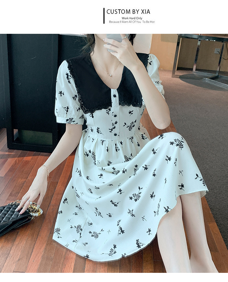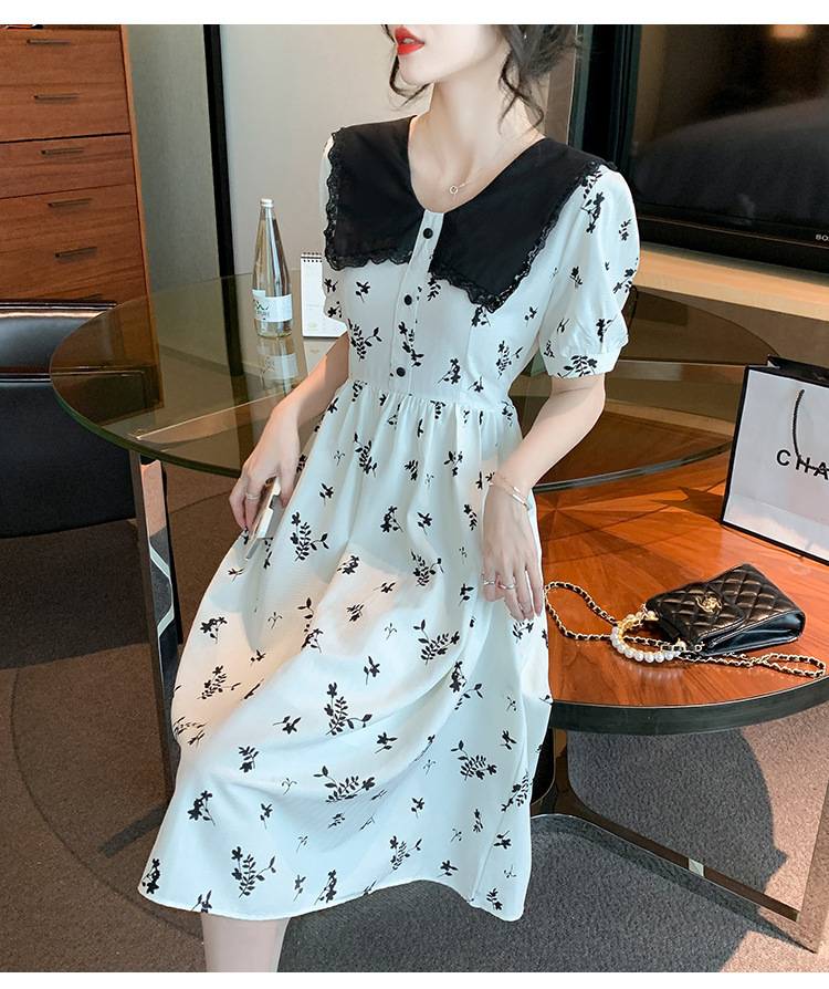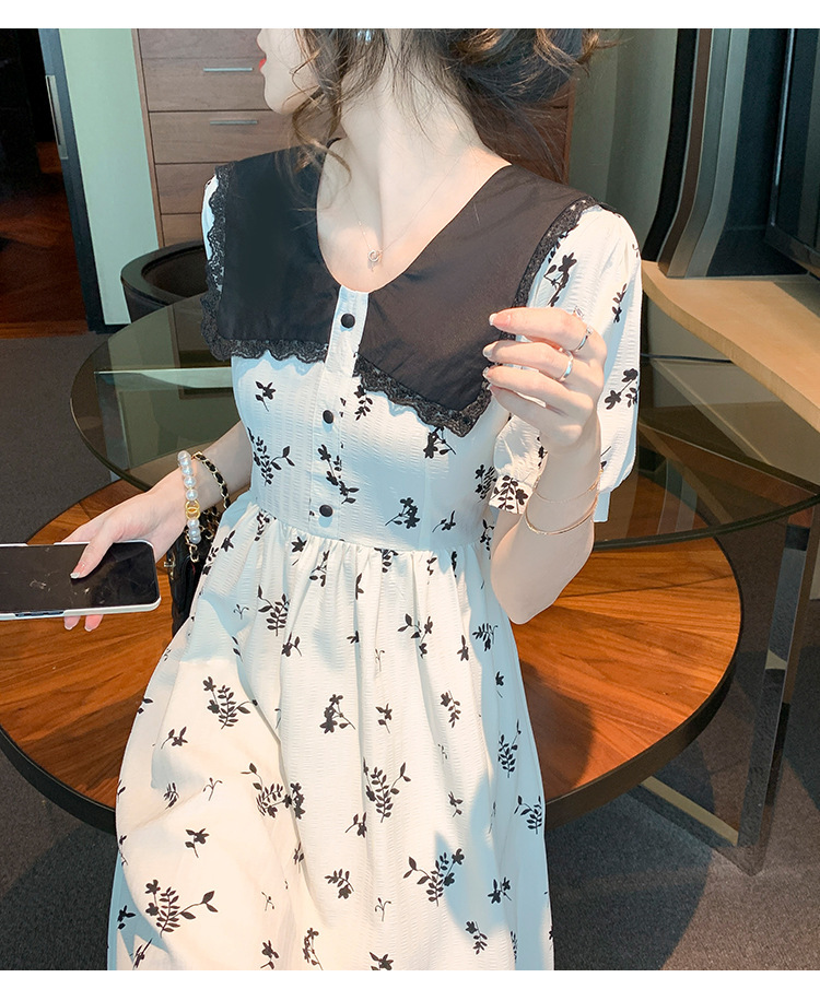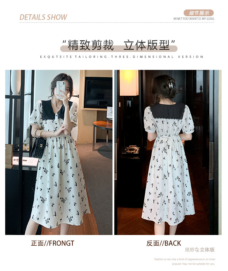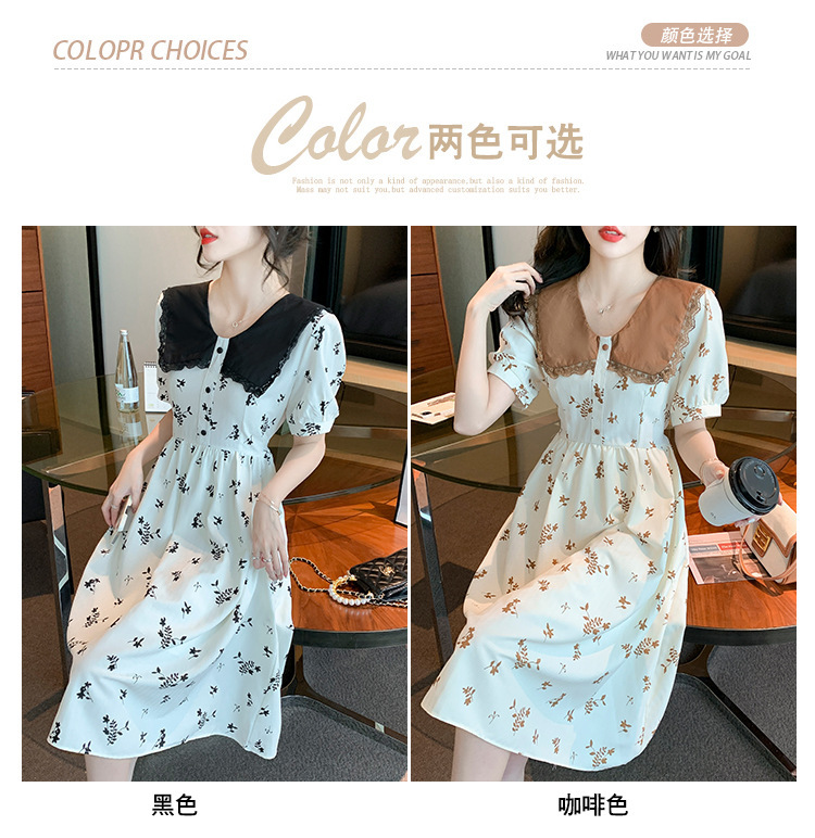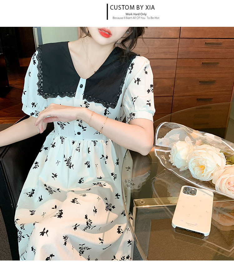 2023夏季新款韩系撞色娃娃领过膝中长裙子收腰显瘦气质碎花连衣裙