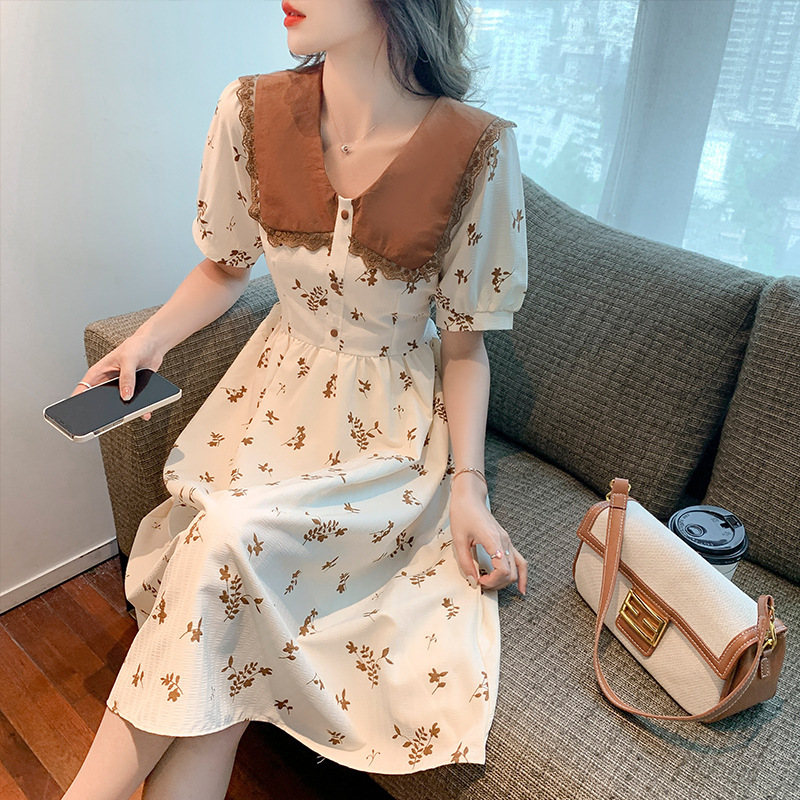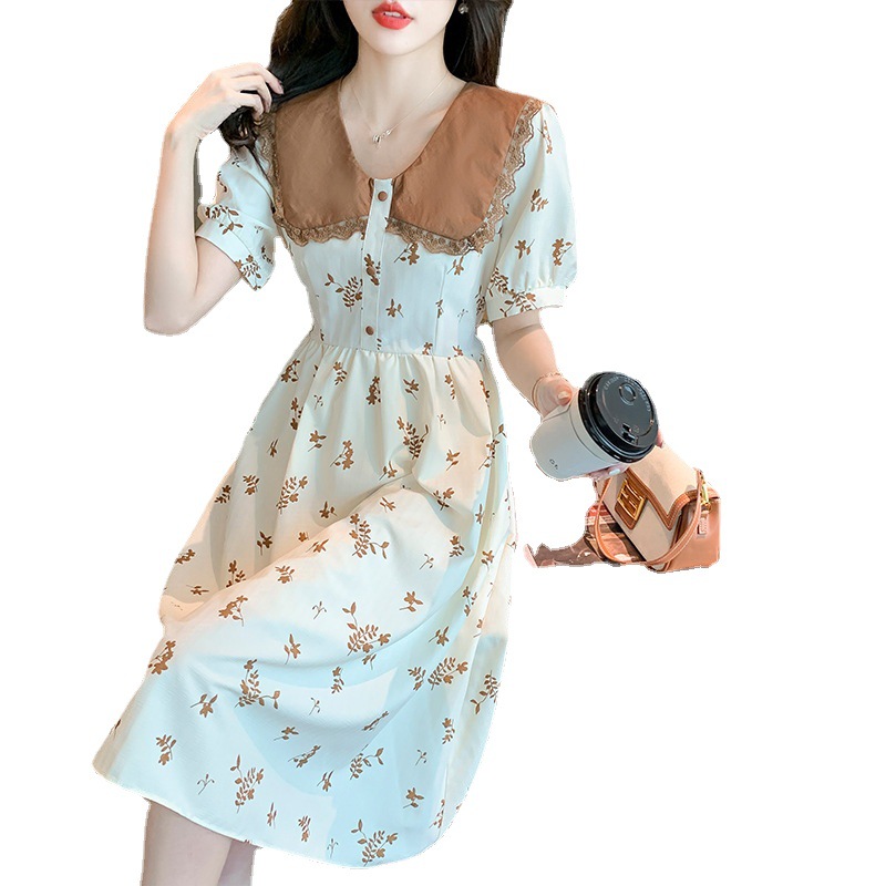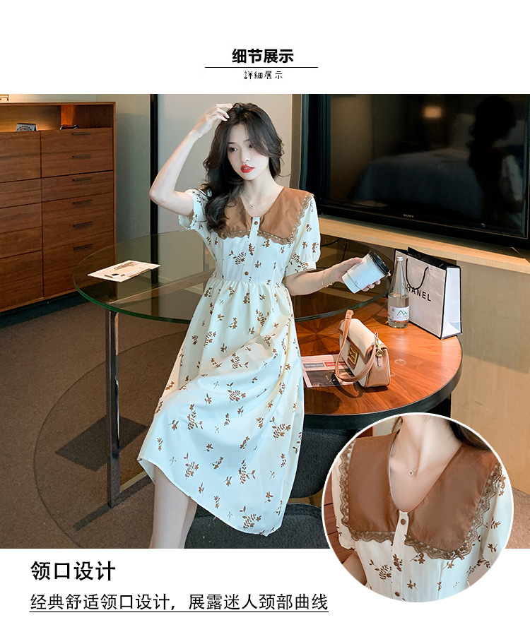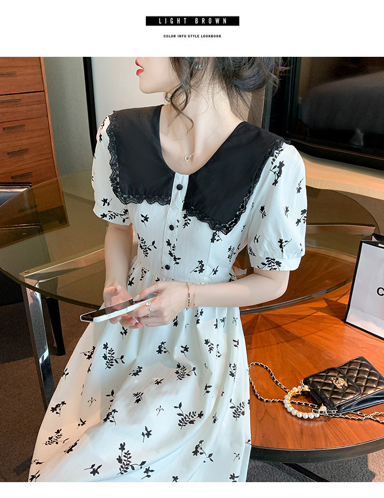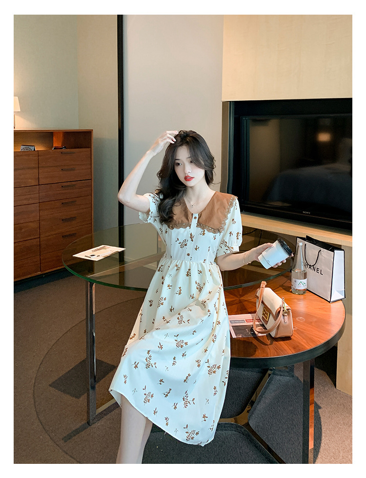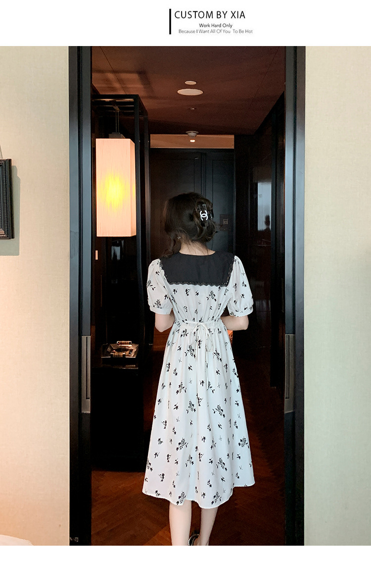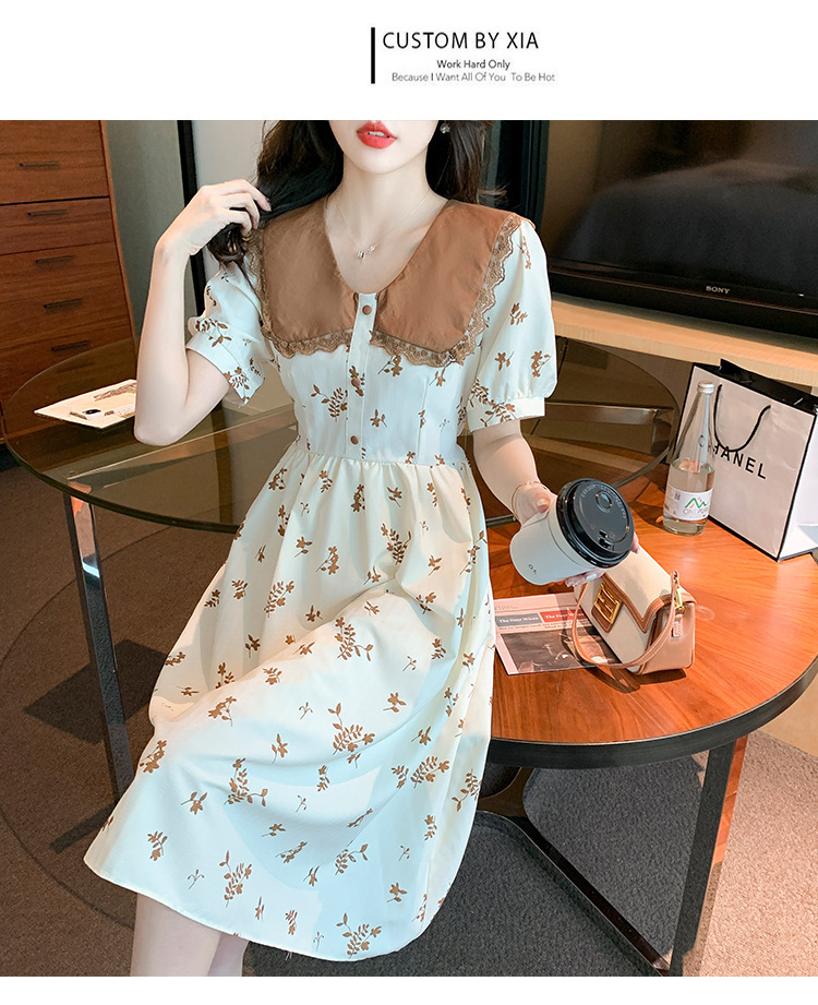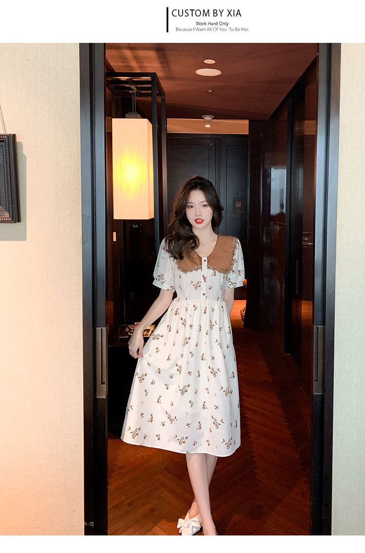 2023夏季新款韩系撞色娃娃领过膝中长裙子收腰显瘦气质碎花连衣裙