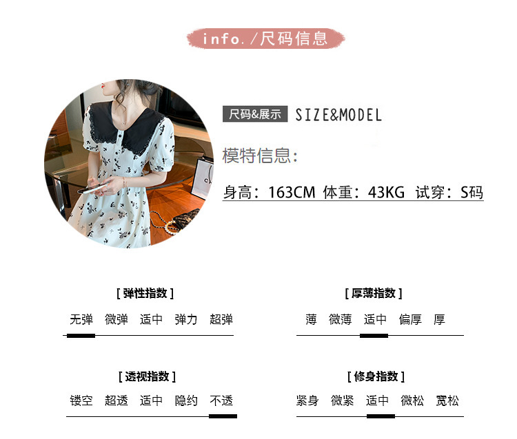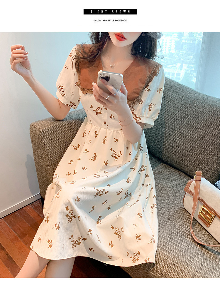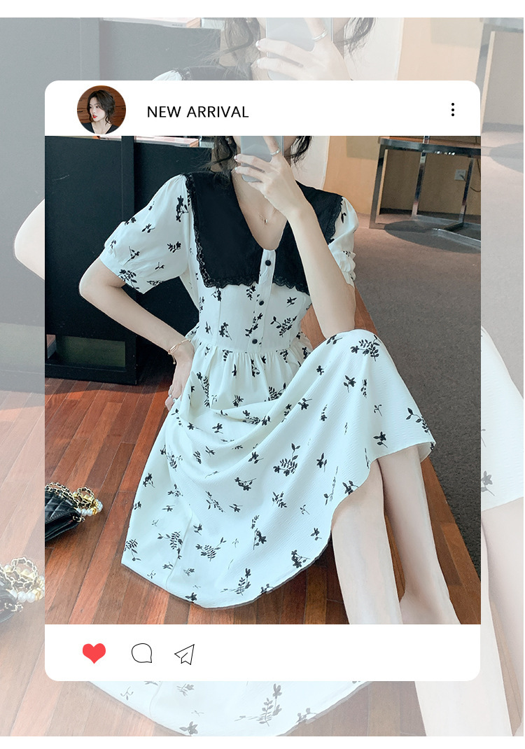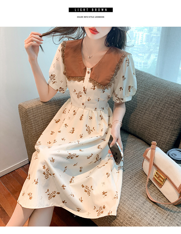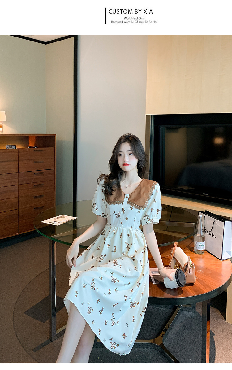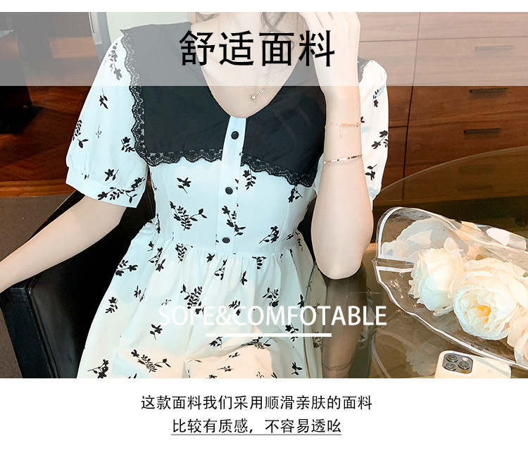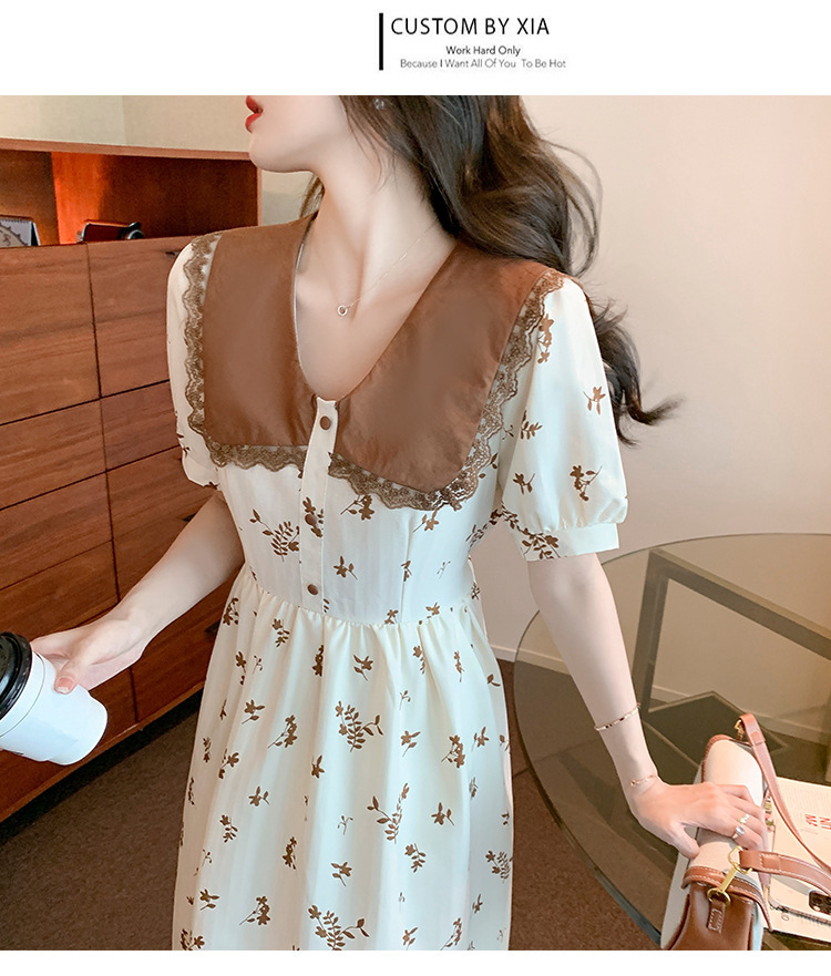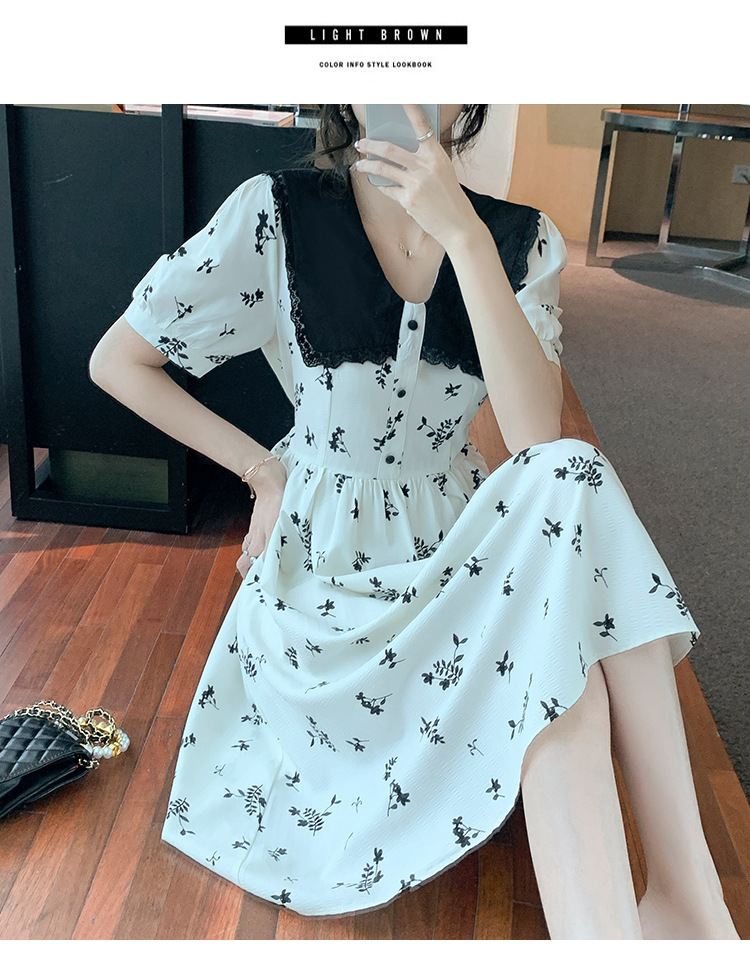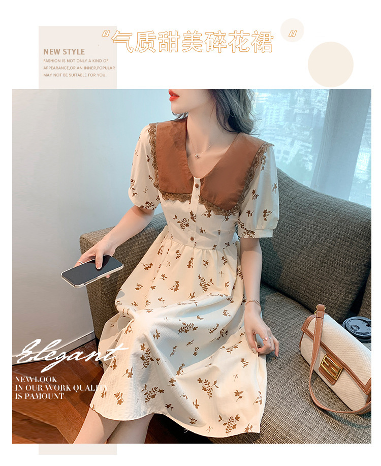 2023夏季新款韩系撞色娃娃领过膝中长裙子收腰显瘦气质碎花连衣裙