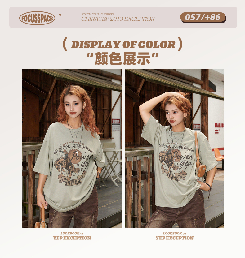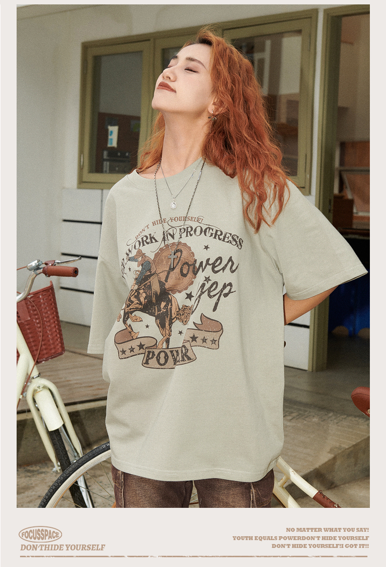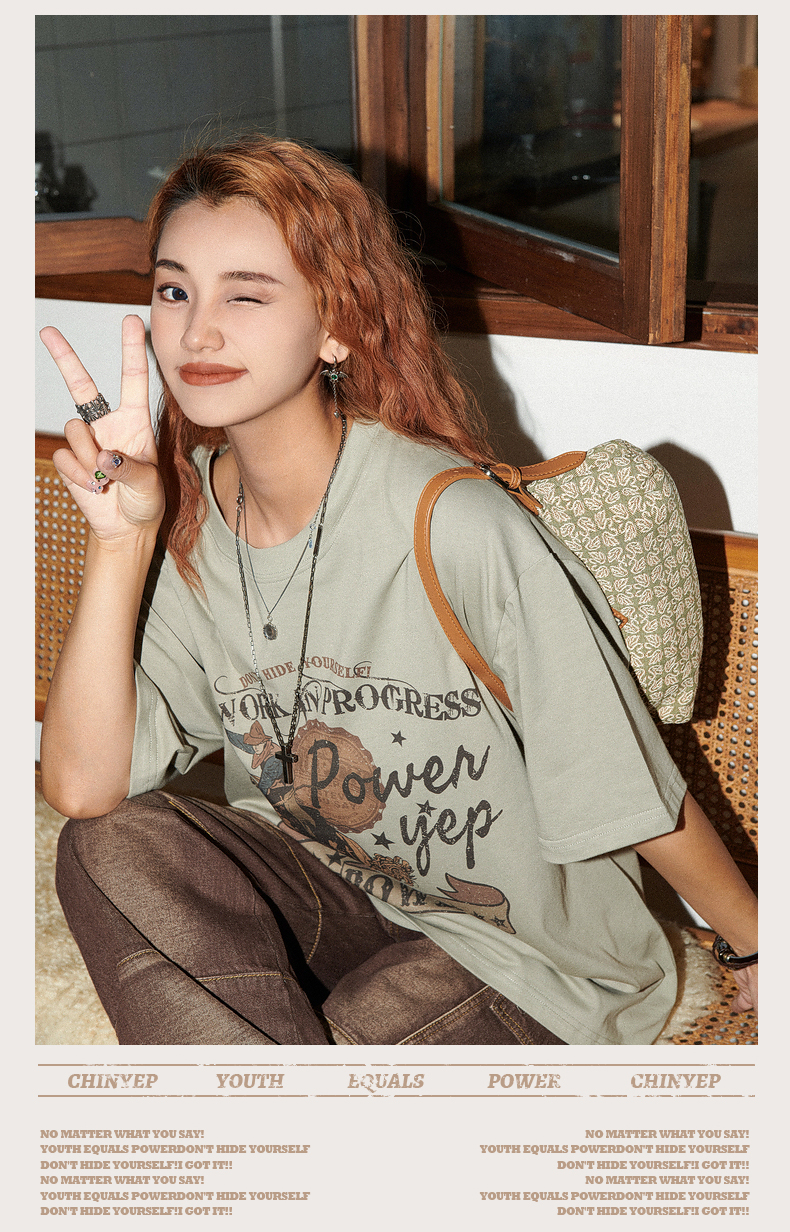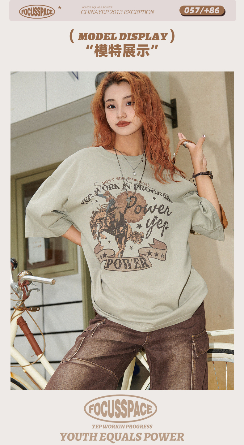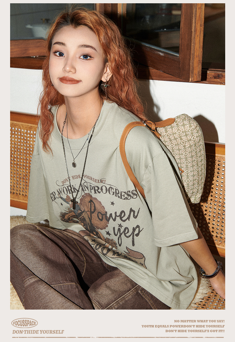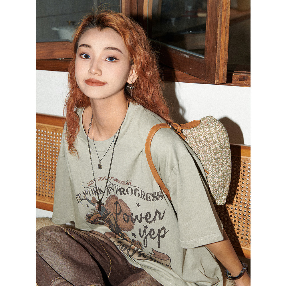 焦點美式復古短袖t恤女夏季ins潮牌oversize設計感寬鬆上衣果綠色