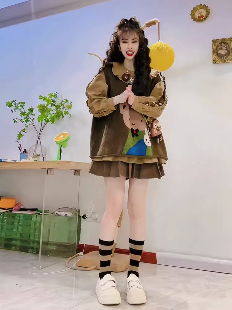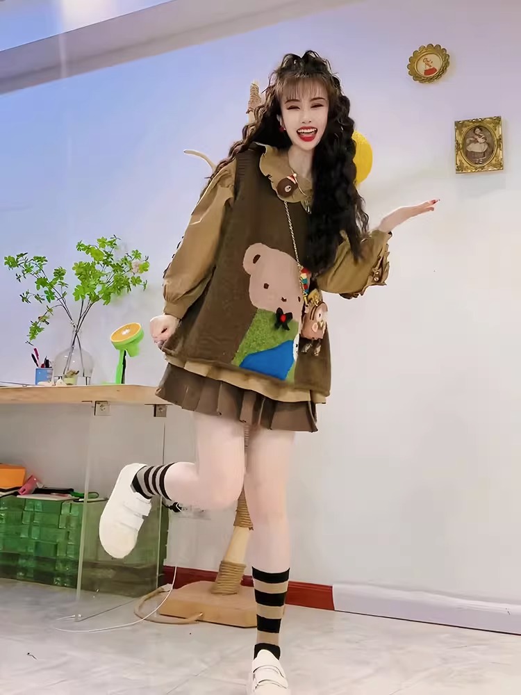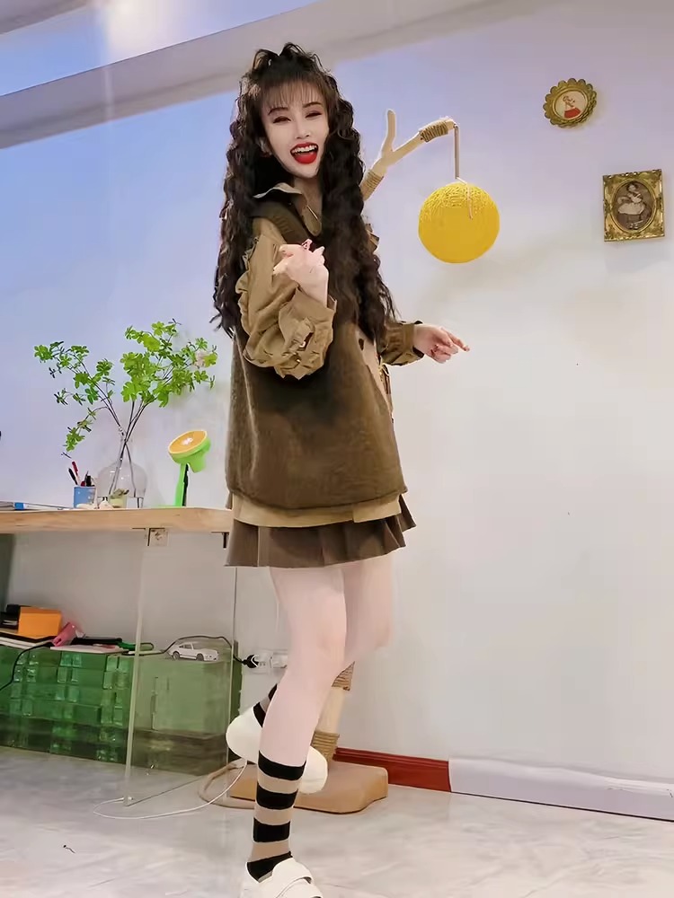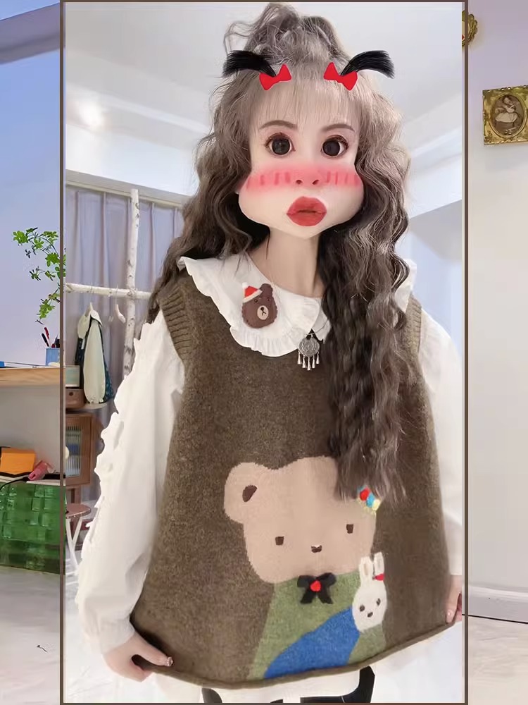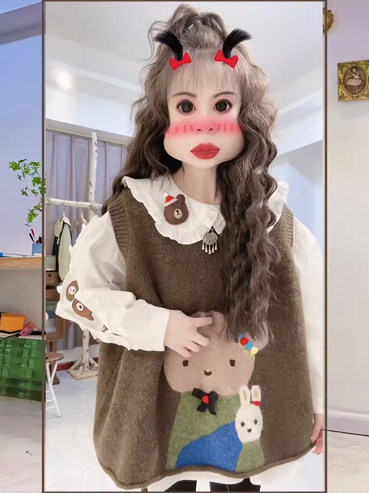 2023年新款秋冬森系針織馬甲毛衣兩件套女秋季娃娃領襯衫上衣套裝