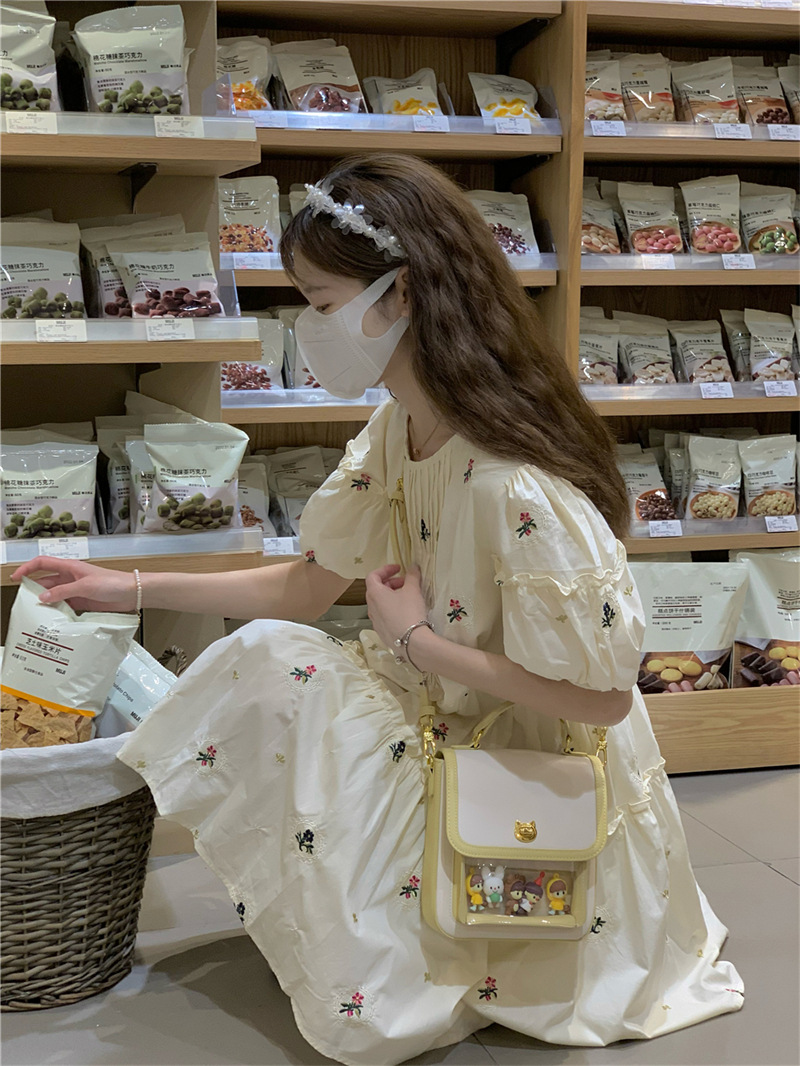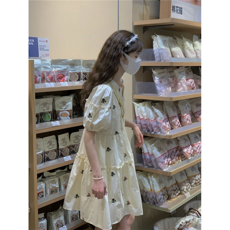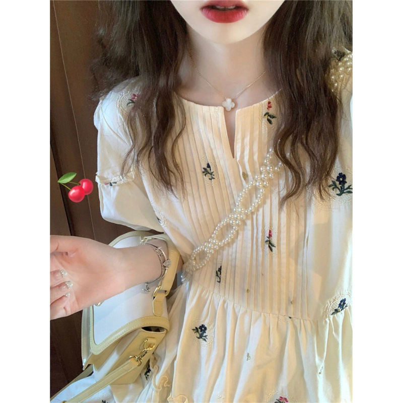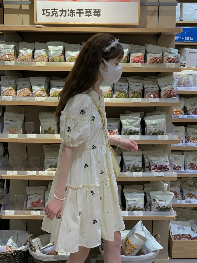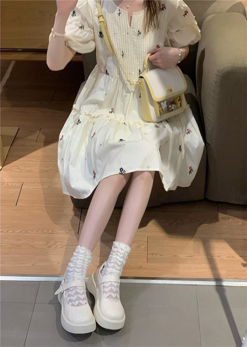 刺绣碎花风琴褶连衣裙女夏小个子温柔木耳边泡泡袖宽松初恋娃娃裙