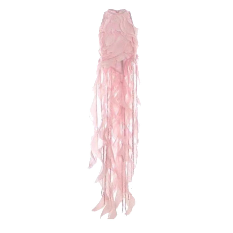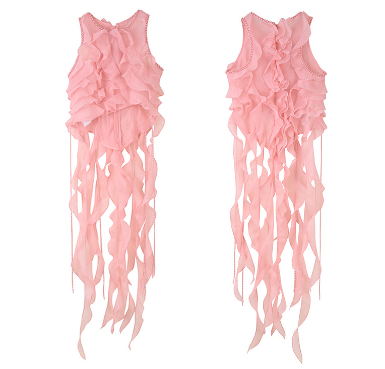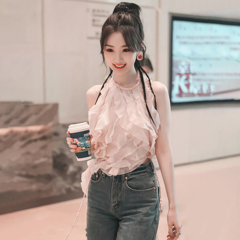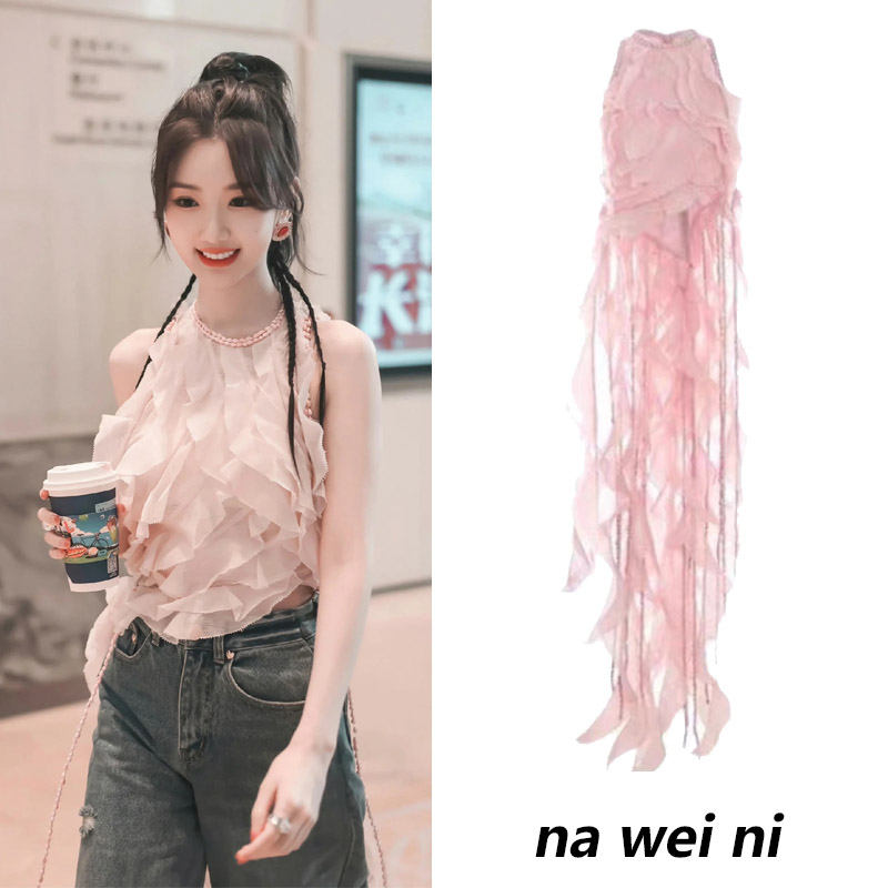 毛曉彤虞書欣同款超仙甜美粉色荷葉邊無袖真絲雪紡襯衫上衣女夏季