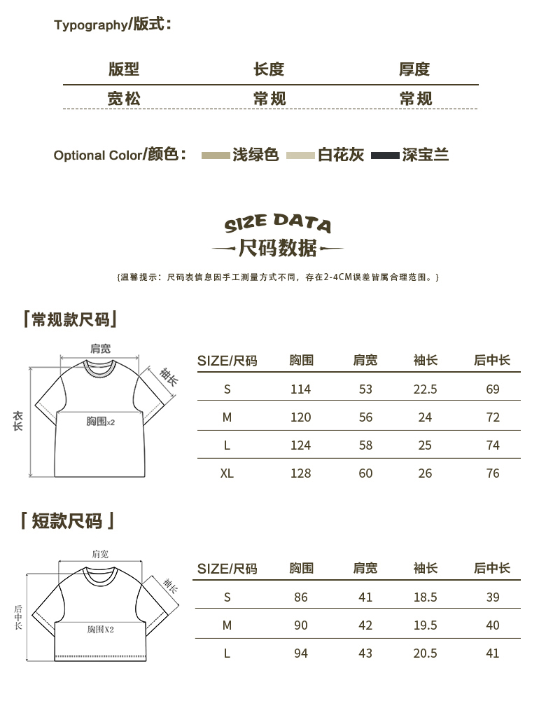 顏色 白花灰常規款 白花灰短款 淺綠色常規款 淺綠色短款 深寶蘭常規款 深寶蘭短款