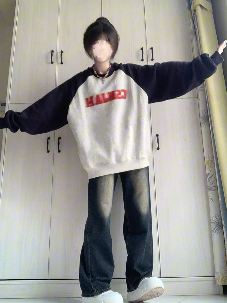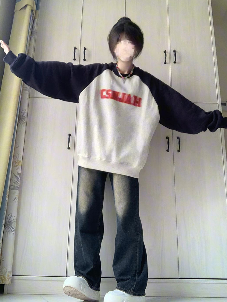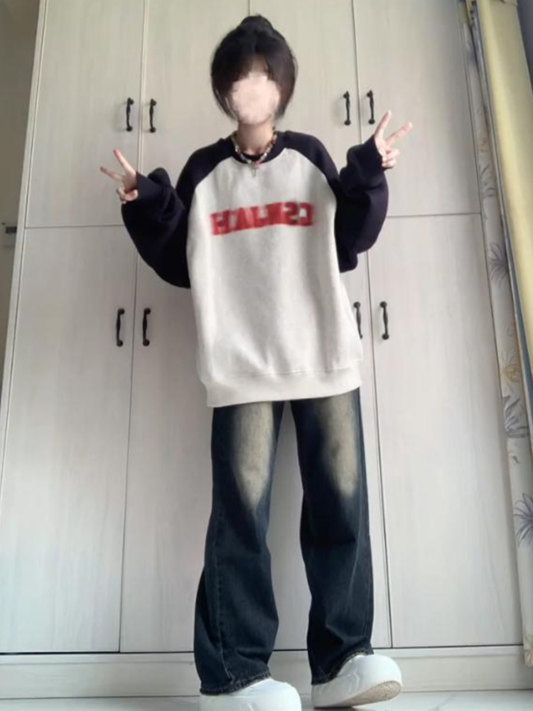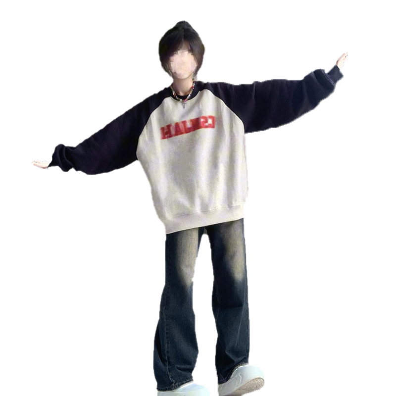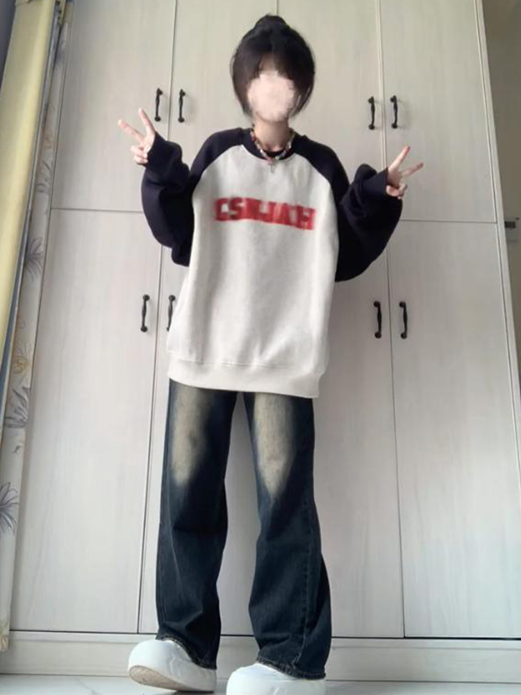 美式復古撞色厚棉T女春秋寬鬆ins潮牌慵懶風oversize無帽套頭上衣