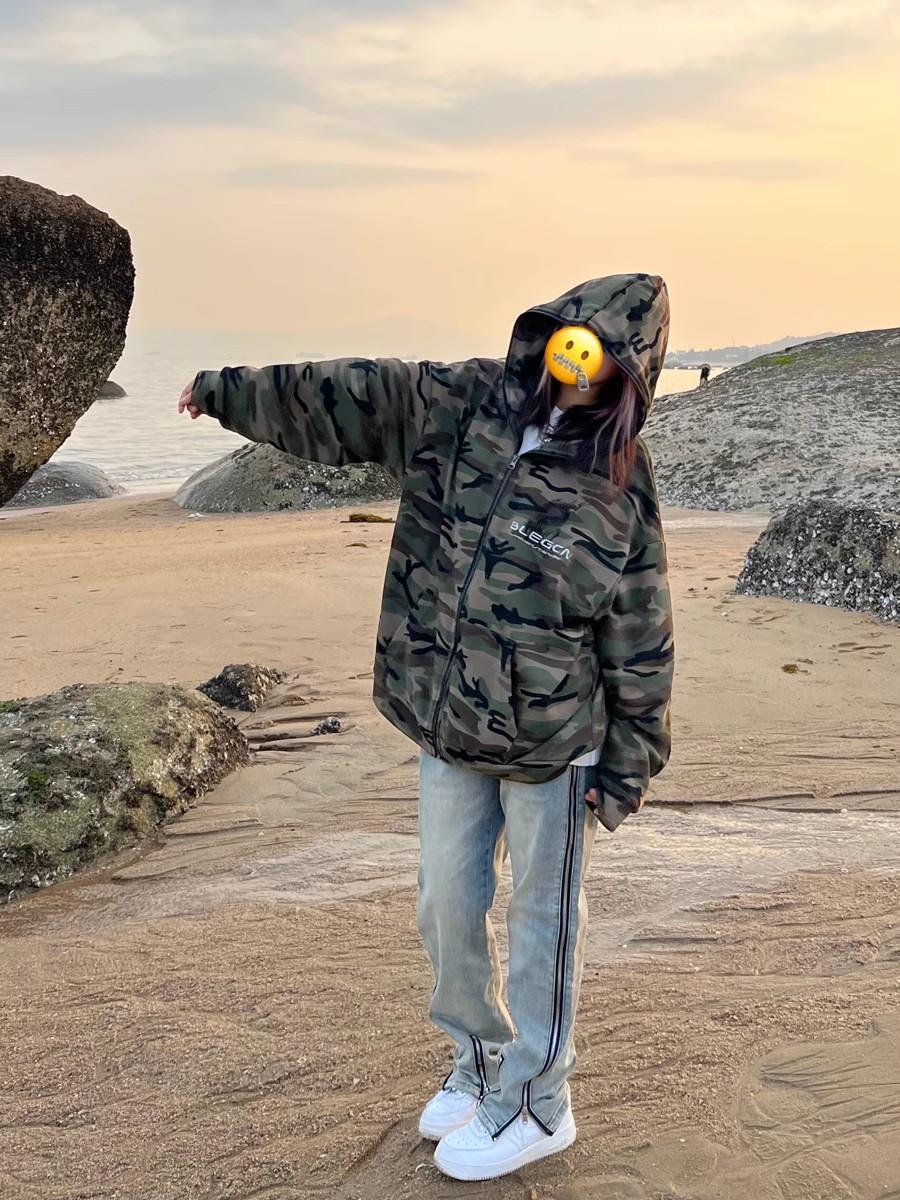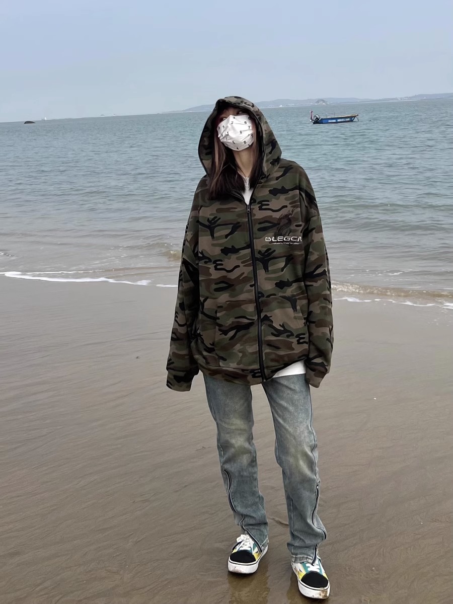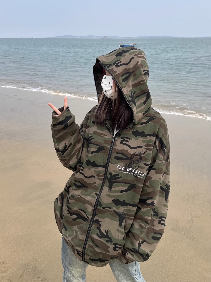 美式高街復古春秋刺繡迷彩拉鍊外套情侶寬鬆休閒連帽運動衫男女薄款